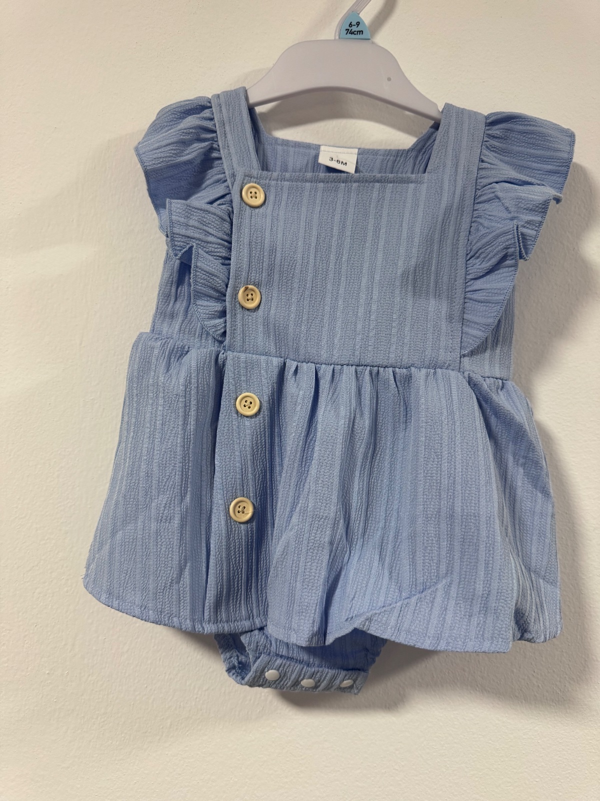Jemná modrá farba, pekné volániky na ramenách a gombíky vpredu. Praktické zapínanie dole na body.