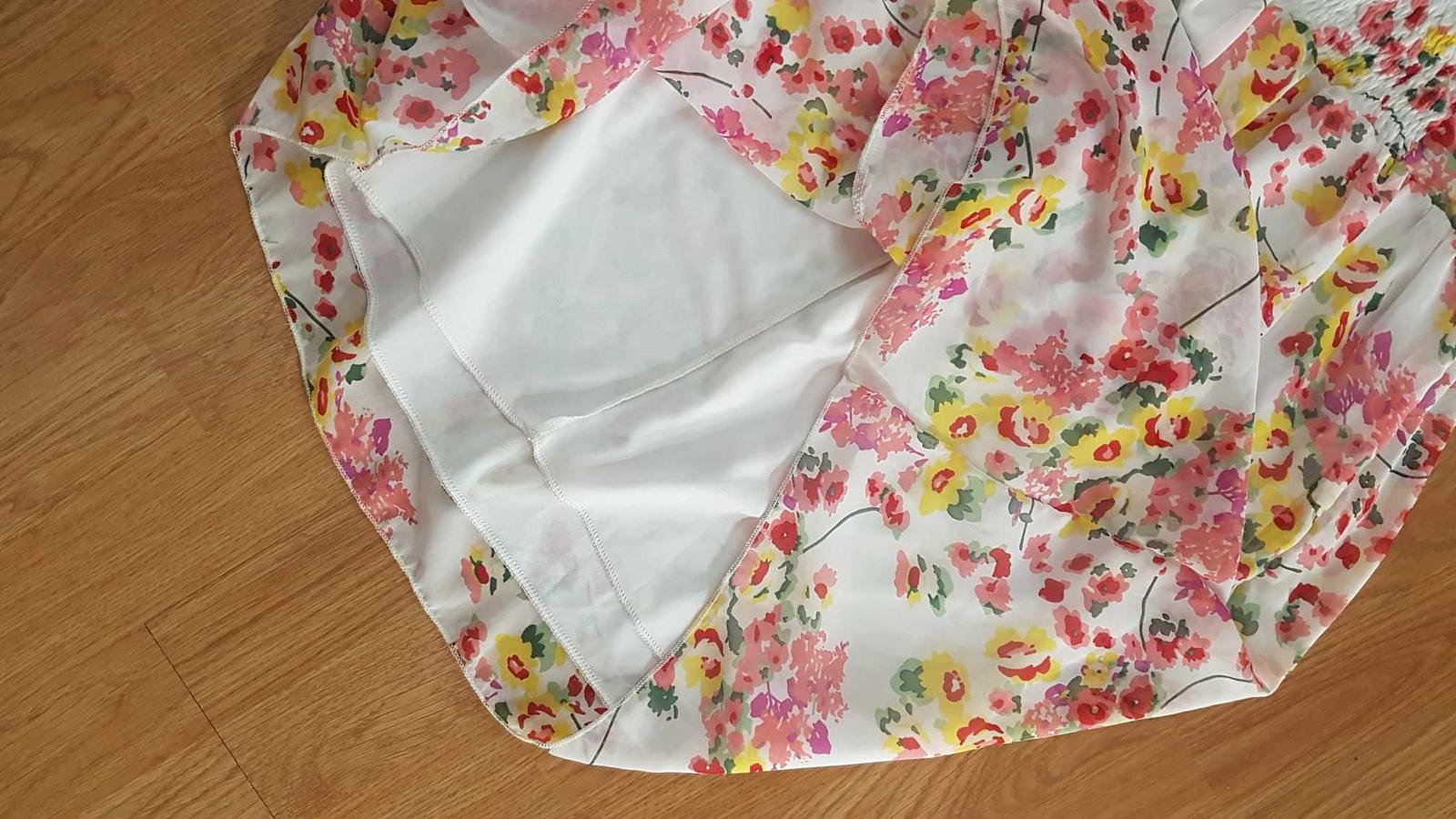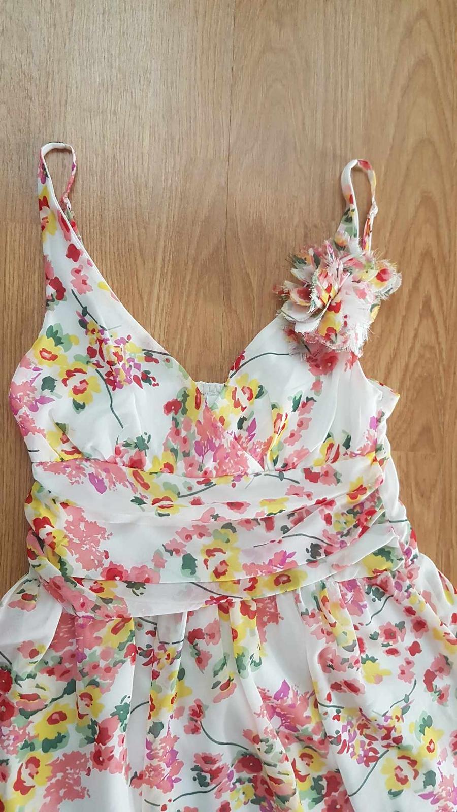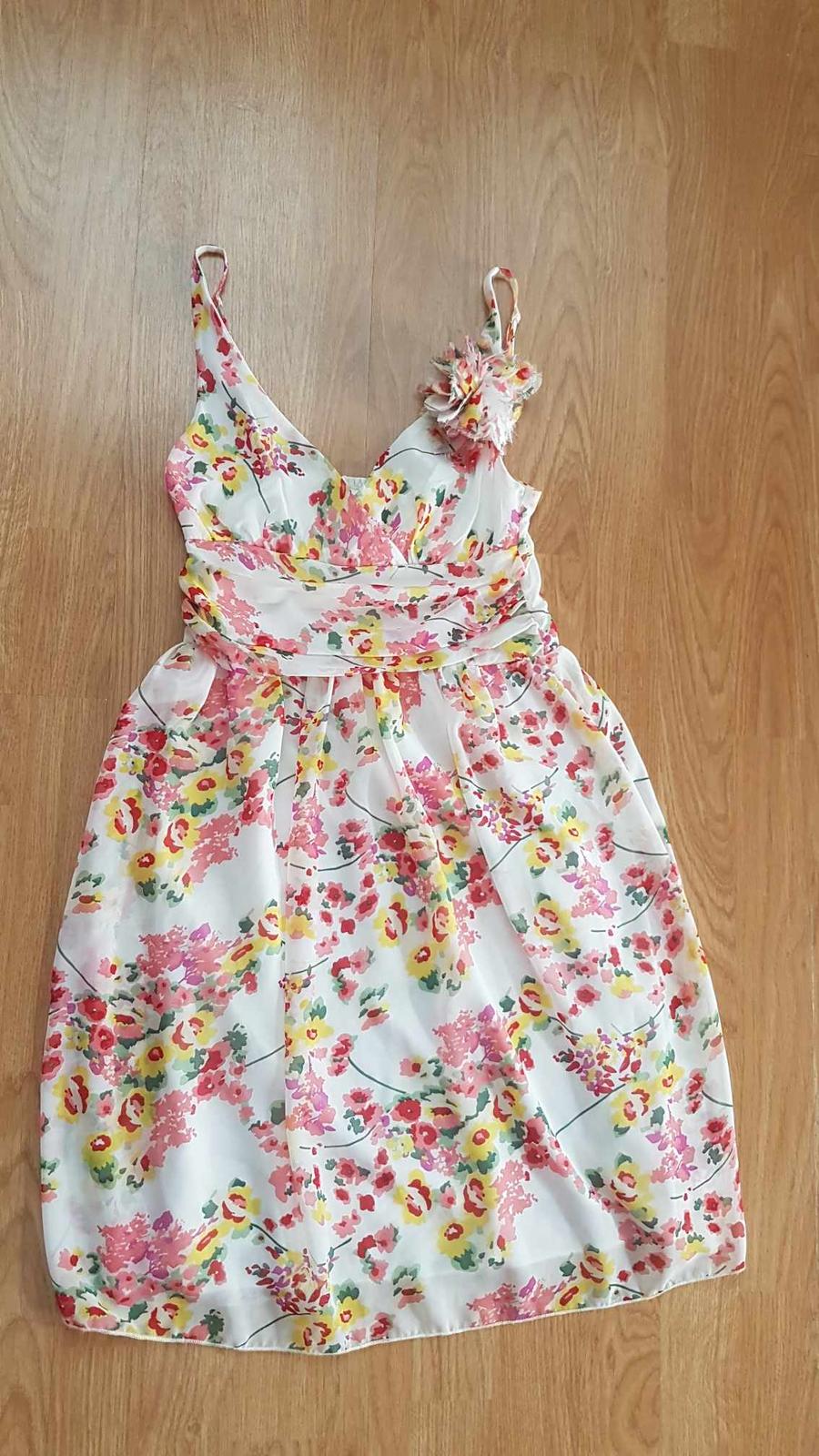 Pekné šaty bez chyby, látková ruža je prišitá, nedá sa odopnúť. Nastaviteľné ramienka, v zadu pružná časť na chrbte. celé sú podšité látkou, nepresvitajú.