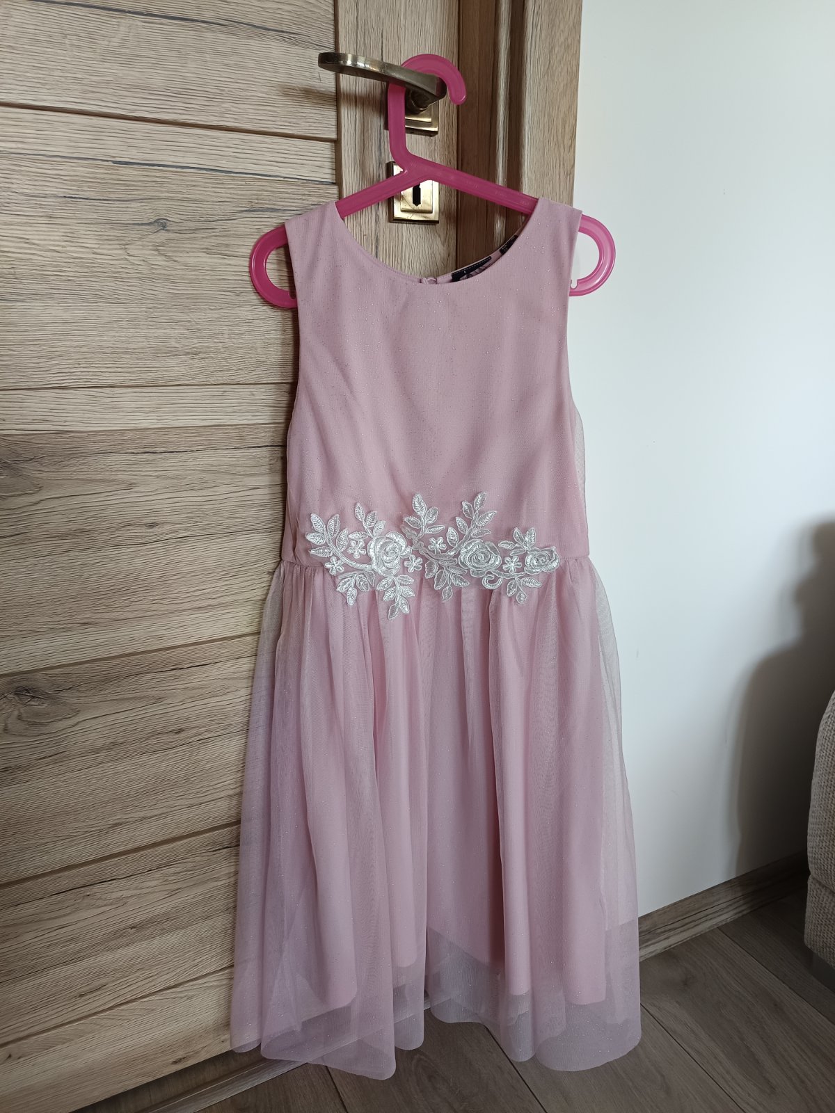 Krásne bielo-ružové saty,polyester,raz oblečené/už malé-zabudnuté v skrini/ veľkosť 146/152,miery pazuchy 37cm,pás 38cm,dĺžka 84cm Top stav