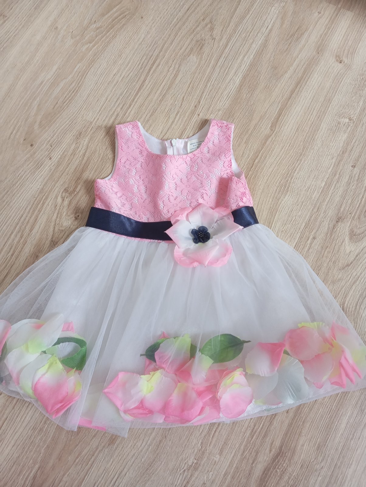 Nadherne prepracovane saty, mali sme ich asi len raz ,objednane z usa , podsite velkost nevidim ale okolo 12 mes , dlzka od ramena cca 47, sirka pas 26x2 cm