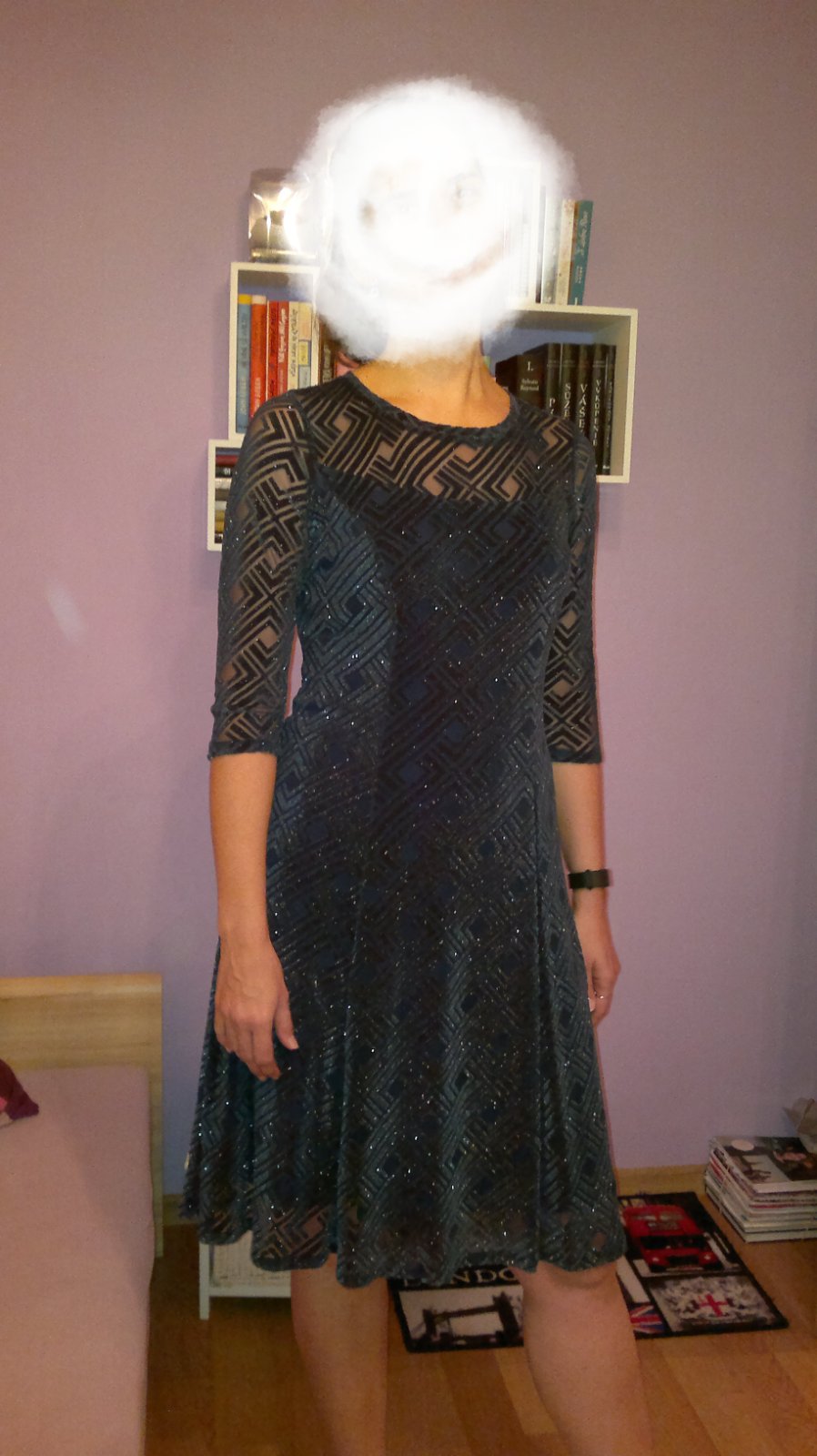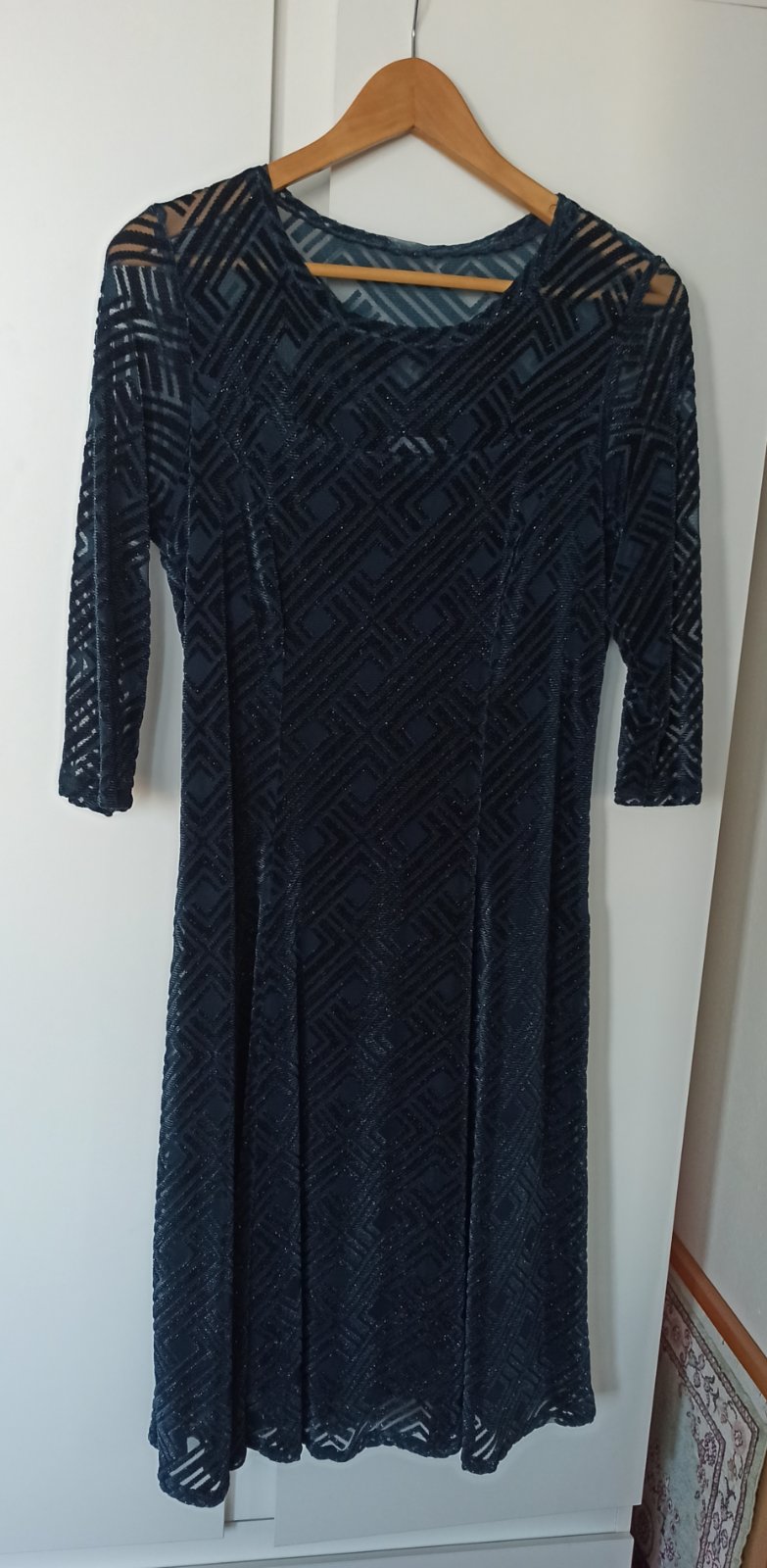 Perfektné šaty z polyesteru a elastanu! Dĺžka - 103 cm, šírka pod pazuchami vrchnej časti - 2x 62 cm, pás - 2x 44/54 cm, boky - 2x 50/60 cm, rukáv od krku - 60 cm. Veľk. 44, ale kľudne od 42.