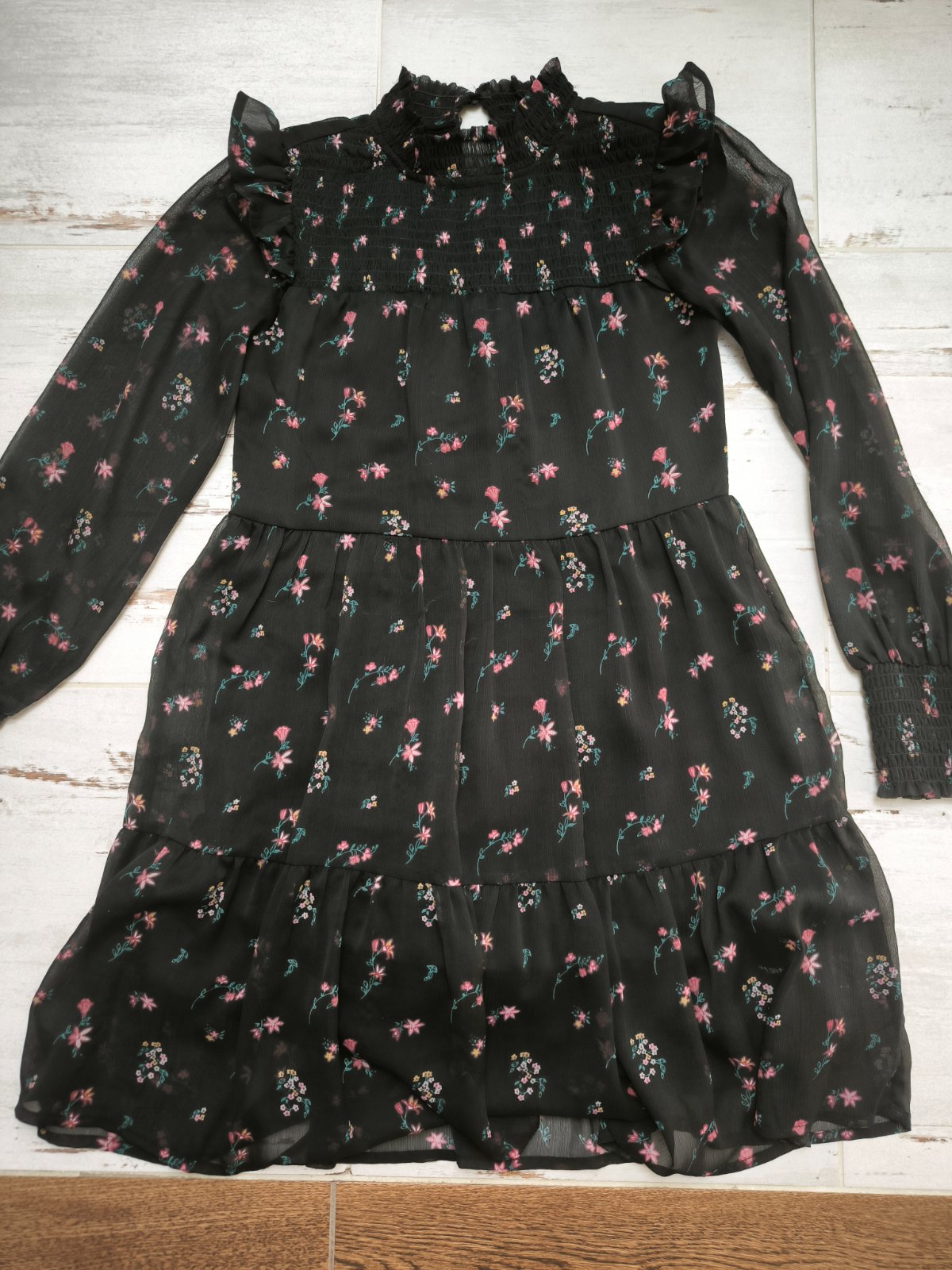 Zaujímavé saty s kvetmi. Rukávy sú sietkovane. Celková dĺžka 73cm Obvod hrude 68cm