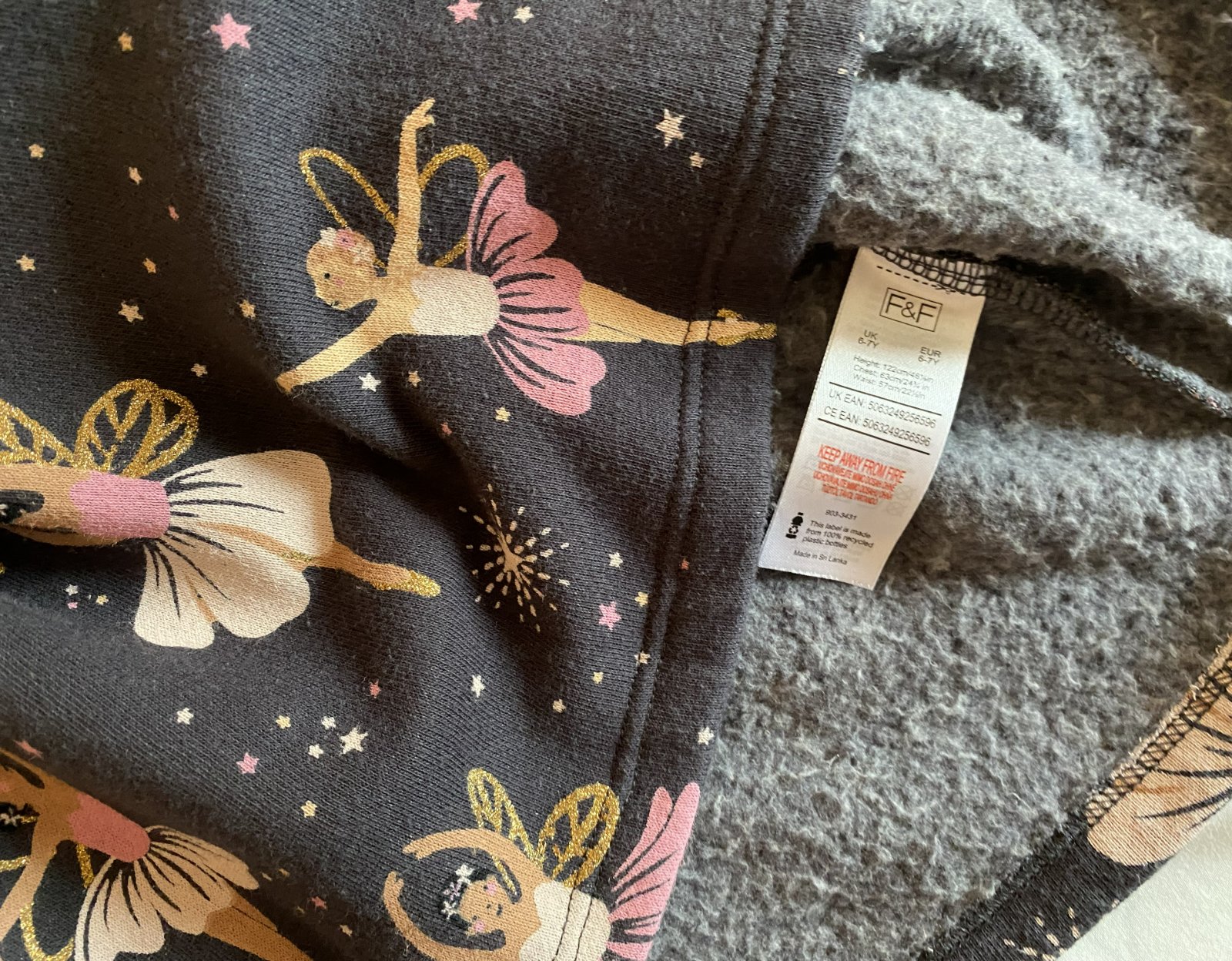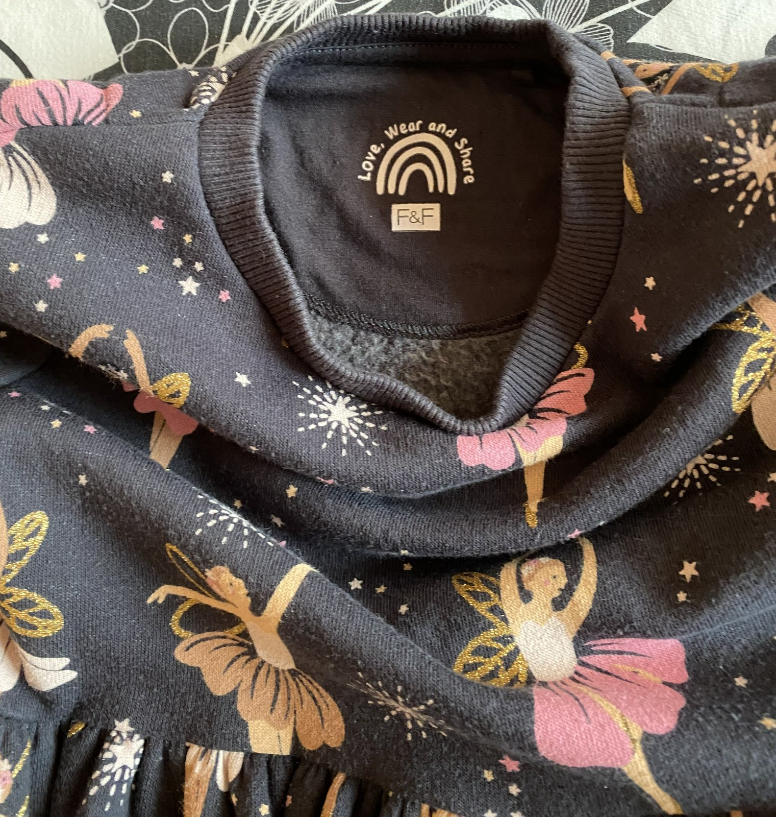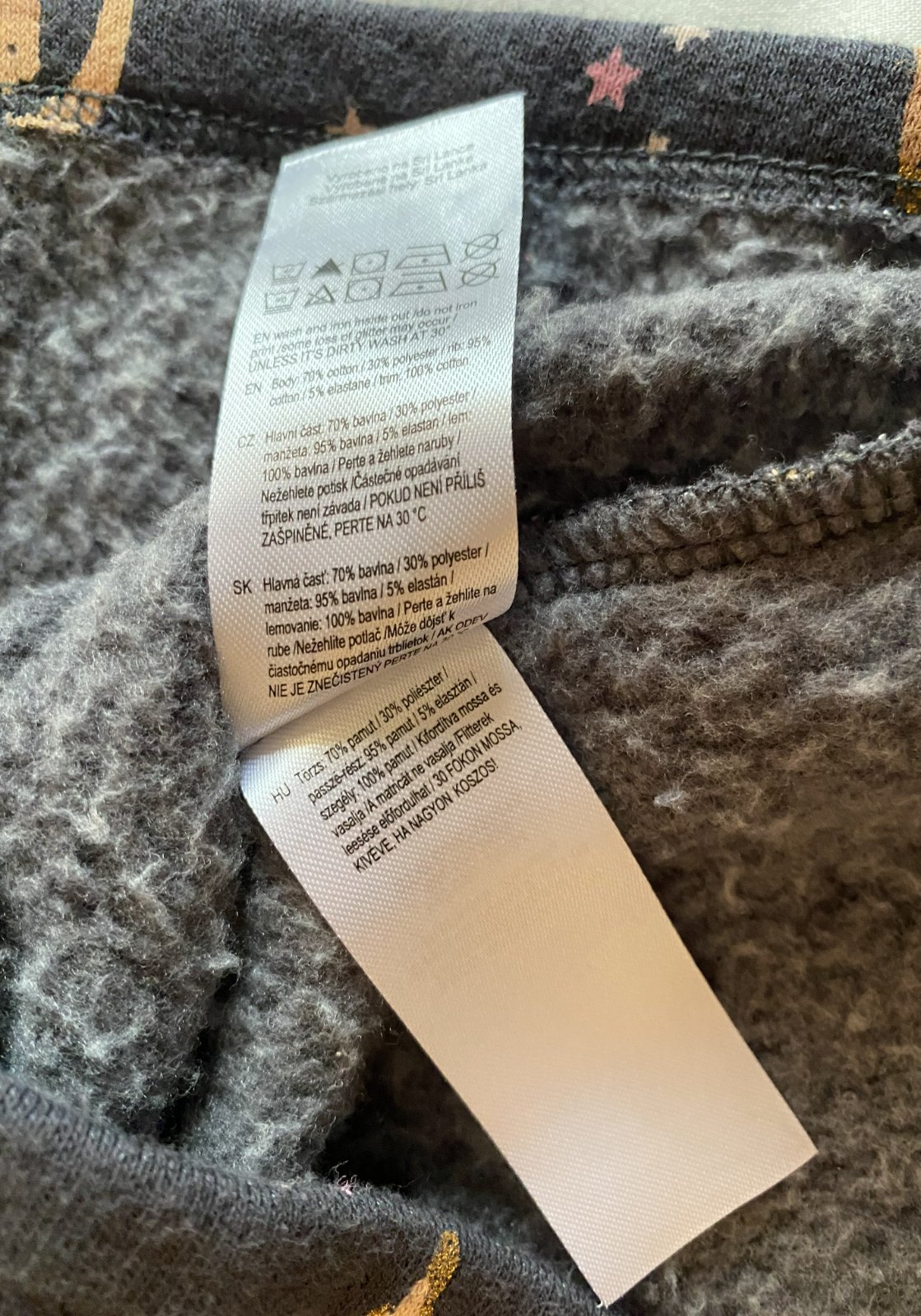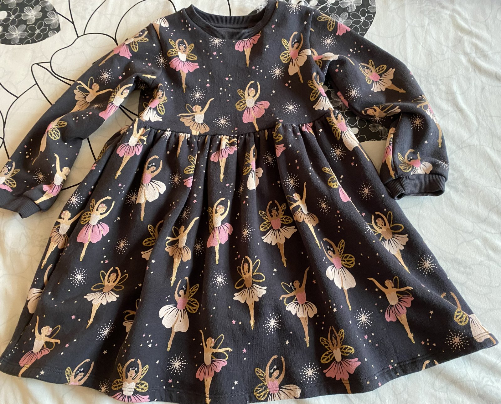 Teplé teplákové šaty F&F s potlačou v. 122 - 6.-7, rokov, mäkký pružný nekršivý materiál materiál - bavlna, polyester, elastan, zlaté metaliské vlákno na krídlach - viď detail foto, pekná nevypratá farba, asi 3x oblečené, bez fľakov a dier. Miery: dĺžka od krku dolu: 63cm, šírka v podpazuší: 34cmx2, šírka dolu cca: 78cmx2, rukáv od ramena: 41cm + rameno - plece vrátane lemu okolo krku: 8cm.