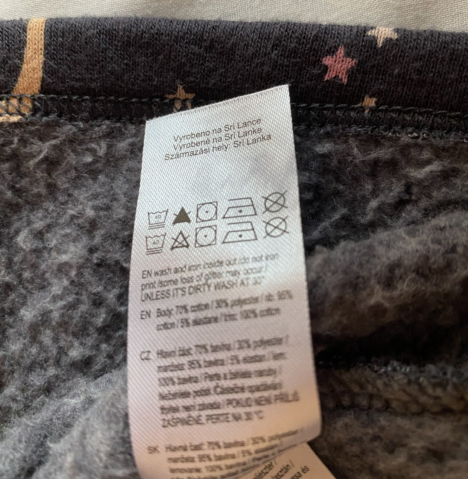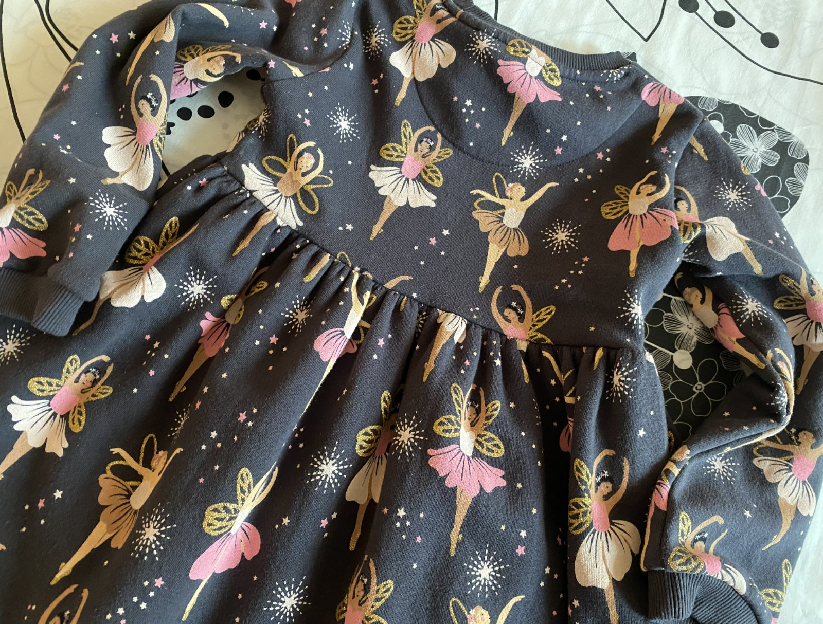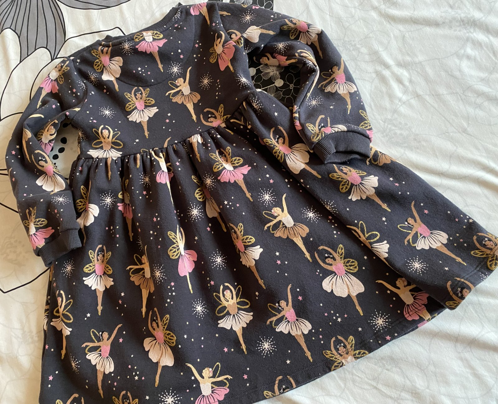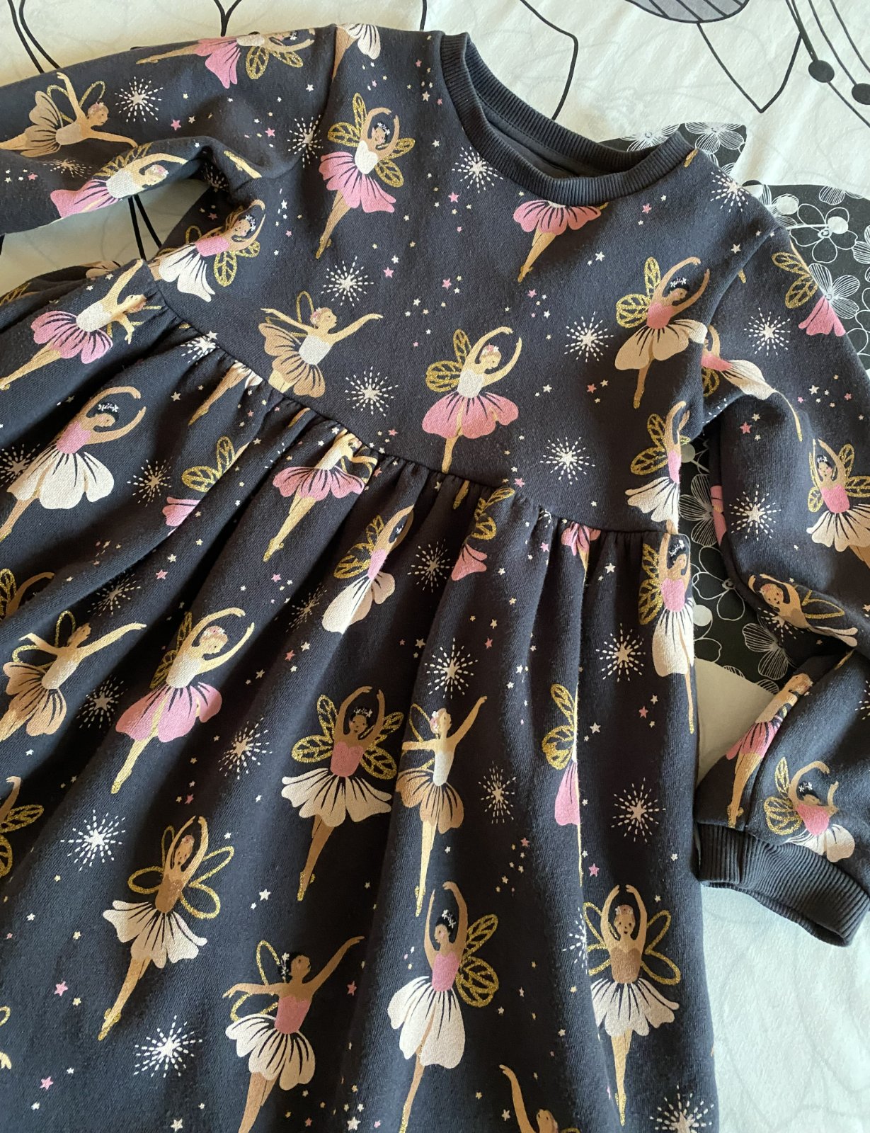 Teplé teplákové šaty F&F s potlačou v. 122 - 6.-7, rokov, mäkký pružný nekršivý materiál materiál - bavlna, polyester, elastan, zlaté metaliské vlákno na krídlach - viď detail foto, pekná nevypratá farba, asi 3x oblečené, bez fľakov a dier. Miery: dĺžka od krku dolu: 63cm, šírka v podpazuší: 34cmx2, šírka dolu cca: 78cmx2, rukáv od ramena: 41cm + rameno - plece vrátane lemu okolo krku: 8cm.