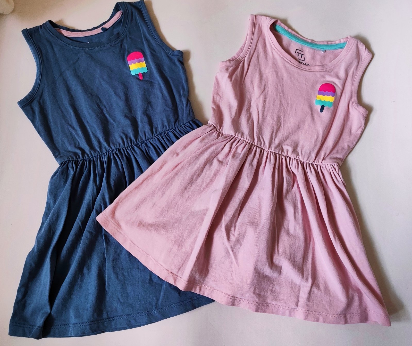 Šatičky sú z príjemnej tenkej bavlny. Sú podšité tenkou látkou. Sú bez poškodenia. Veľkosť uvedená 98 - 104.