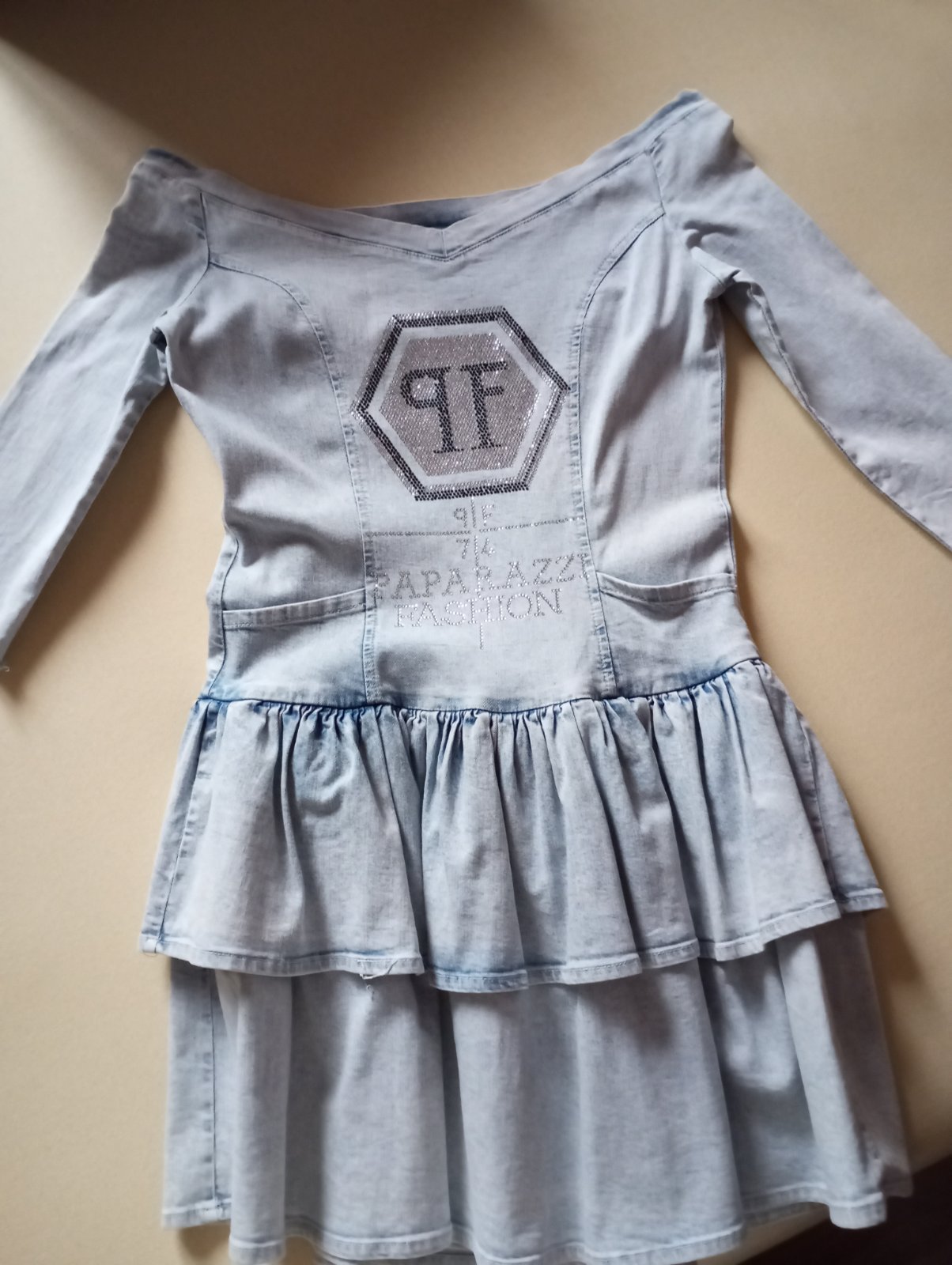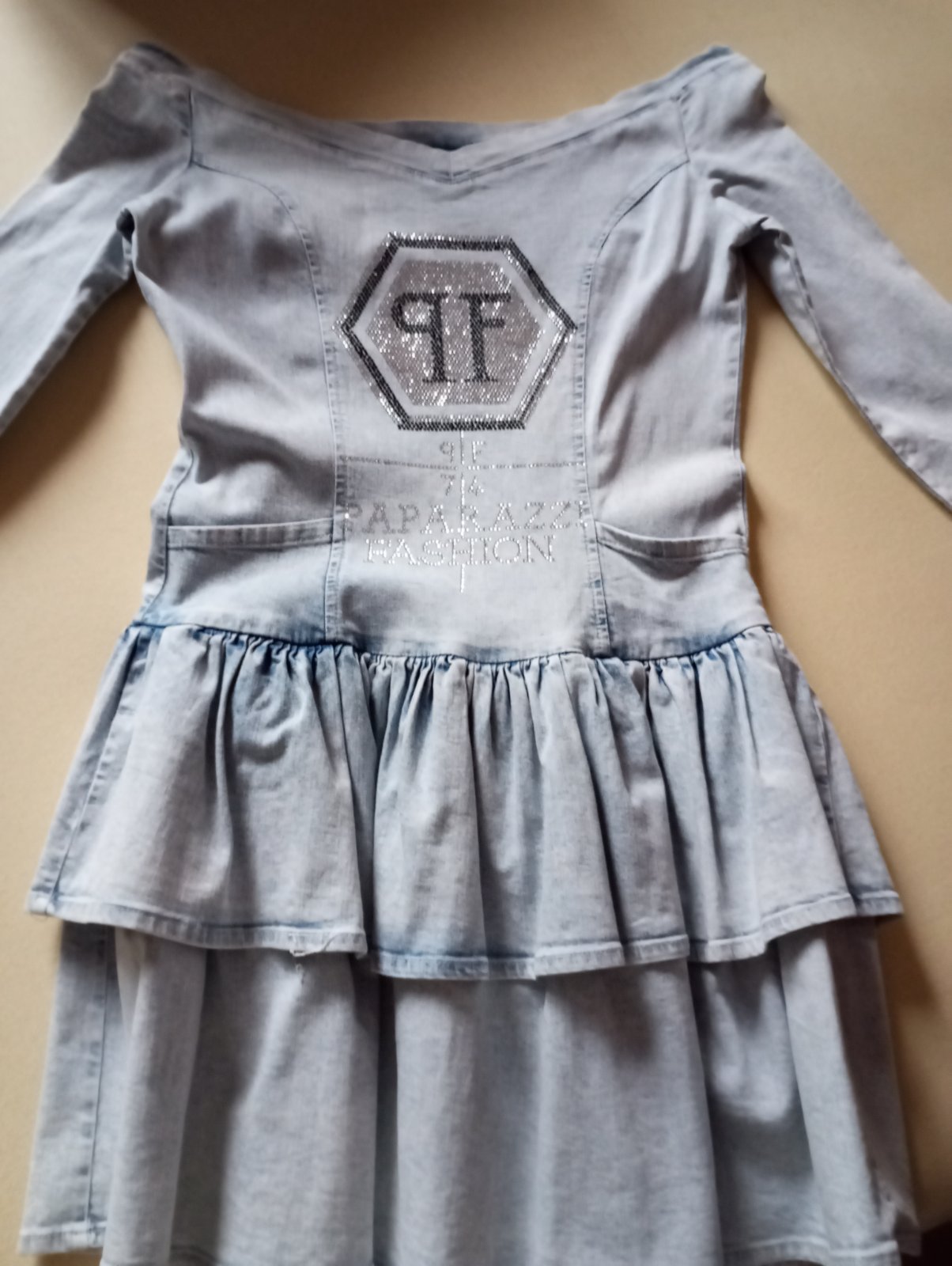 Rozšírené šaty s orientálnym výrazným vzorom. Zapínajú sa na tri gombíky a spodná časť je ozdobená volánom. Dlhé rukávy sú zakončené patentom. Dĺžka 88 cm, šírka v hrudníku cca 52x2 cm, dĺžka rukáv...