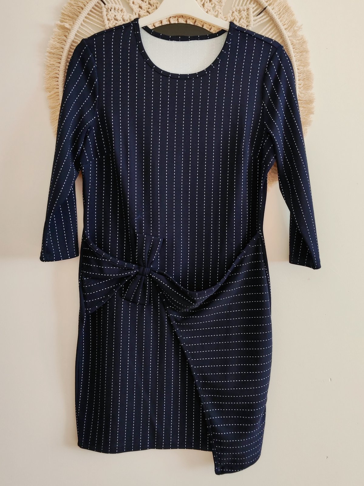 Na predaj uplne nove nenosene iba vyskušane šaty tmavomodrej farby s opaskom,na prednom diely ozdobene vyraznymi gombikmi na ľavej strane.Zapinanie vzadu na zips.Velkosť M