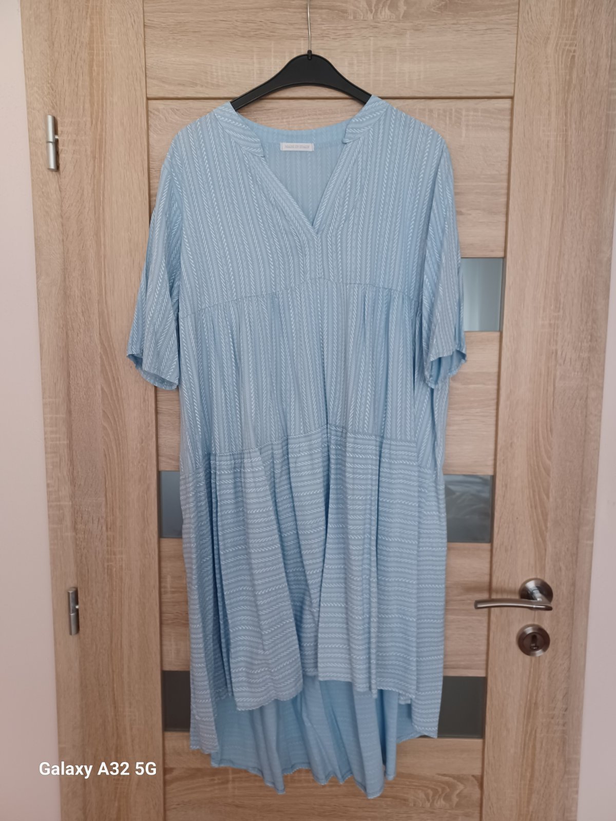 Predám ľahké, letné, viskózové šaty, zadný diel je dlhší ako predný. Šírka medzi pazuchami: 55 cm, dĺžka od ramena po spodný okraj predného dielu: 93 cm, dĺžka od ramena po spodný okraj zadného dielu: 110 cm.