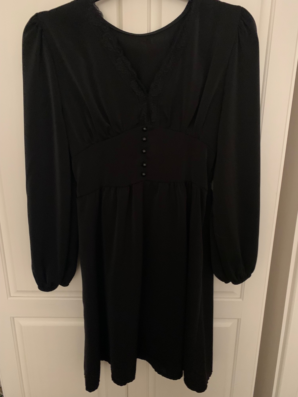 Pekne raz oblecene saty, vzadu siroka gumicka, prisposobia sa v prsiach aj v pase, dlzka 90, prsia 90-100cm, pas 86 cm, rukav id presitia 59 cm