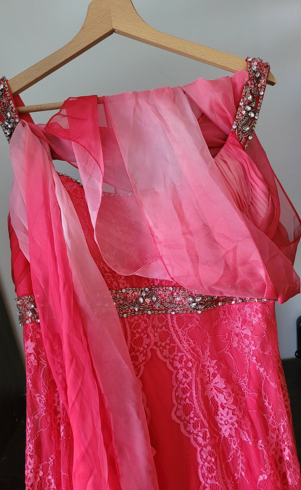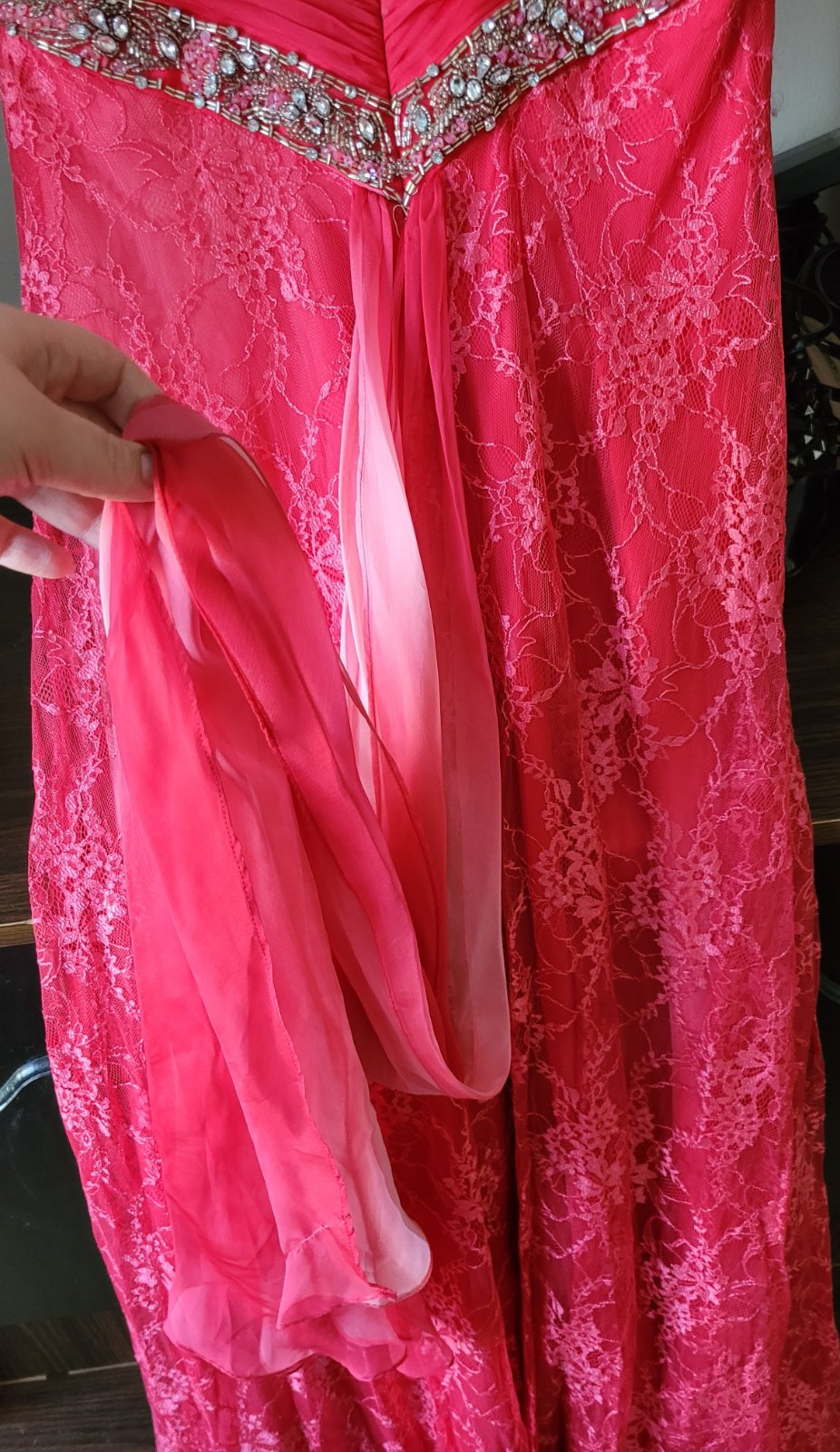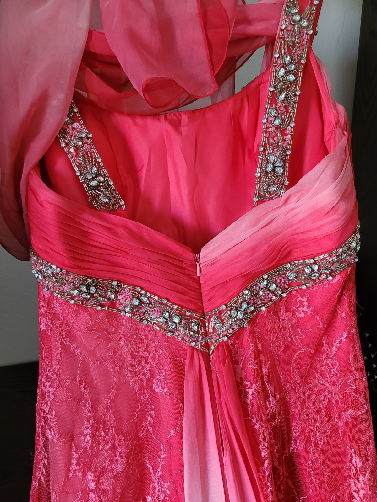 Dlhé spoločenské šaty veľkosť 40. šaty majú všitú podprsenku, čipkovanú vlečku, zips na chrbte, všitú podsukňu. Rozmery sú na foto. Boli oblečené iba raz na svadbe a iba mi stoja v skrini, takže ich rada posuniem za symbolickú cenu ďalej. Značku nepoznám, boli kupované v Španielsku v butiku za 250 eur.