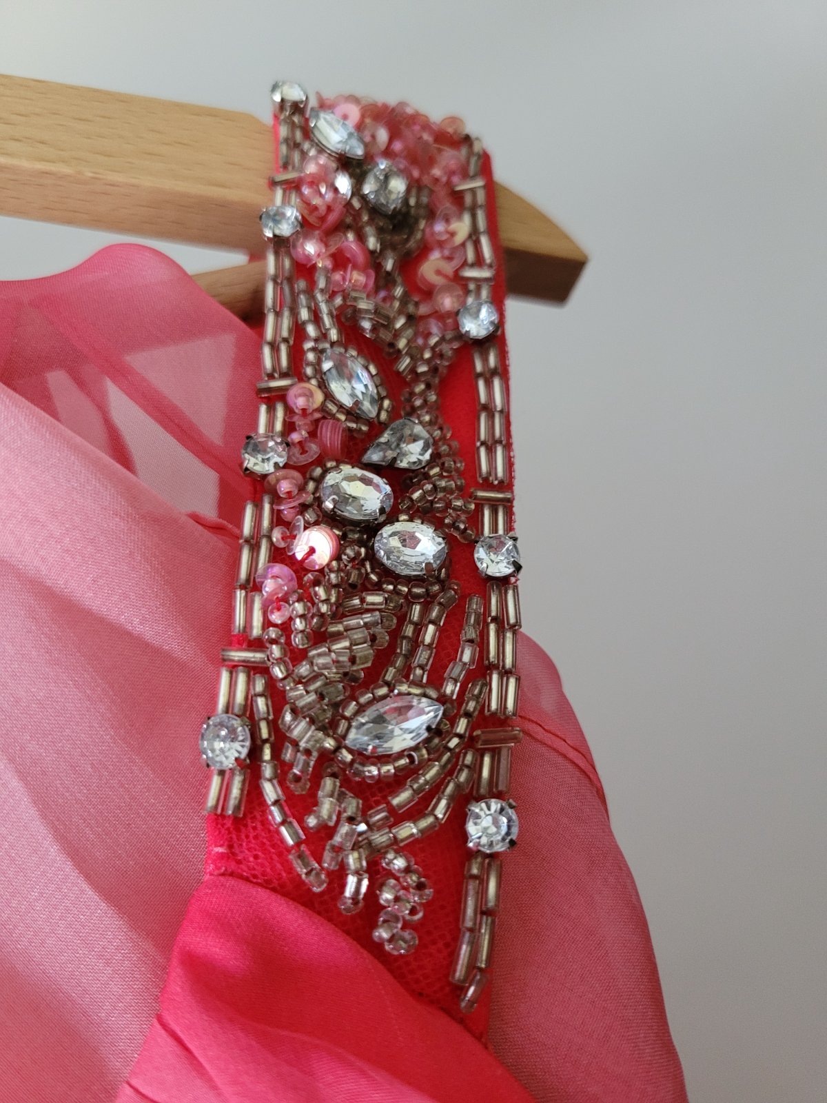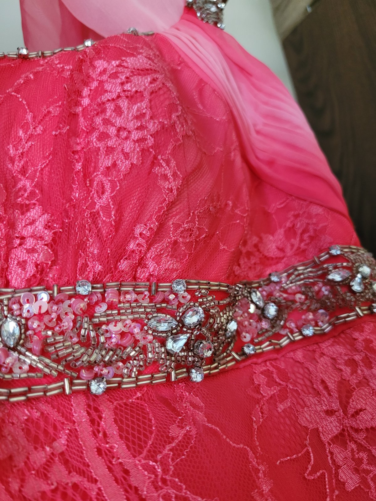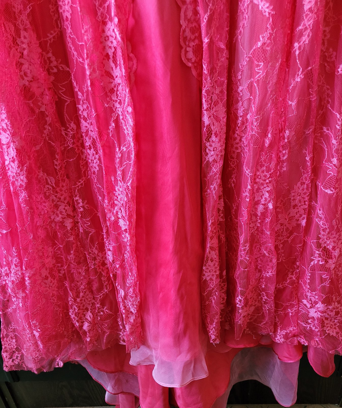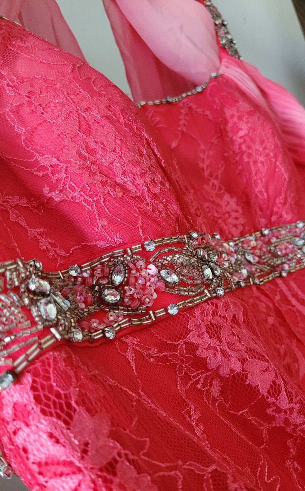 Dlhé spoločenské šaty veľkosť 40. šaty majú všitú podprsenku, čipkovanú vlečku, zips na chrbte, všitú podsukňu. Rozmery sú na foto. Boli oblečené iba raz na svadbe a iba mi stoja v skrini, takže ich rada posuniem za symbolickú cenu ďalej. Značku nepoznám, boli kupované v Španielsku v butiku za 250 eur.