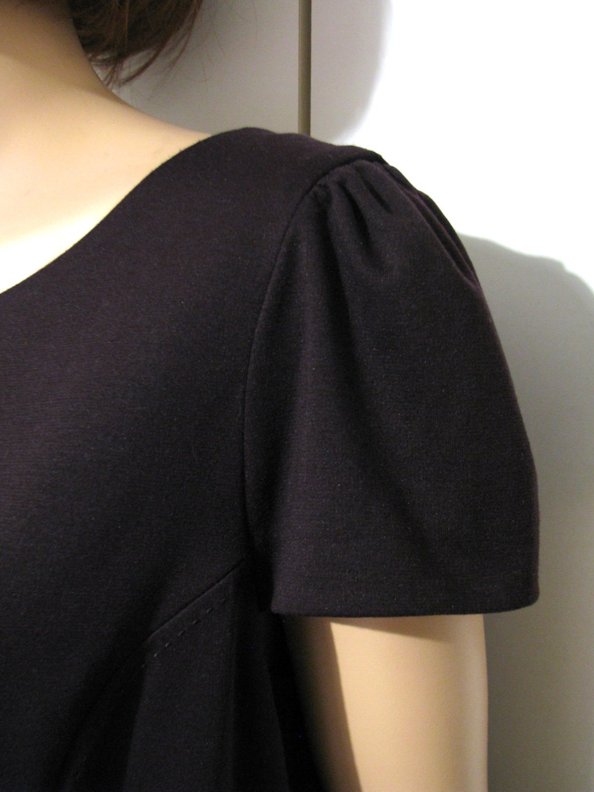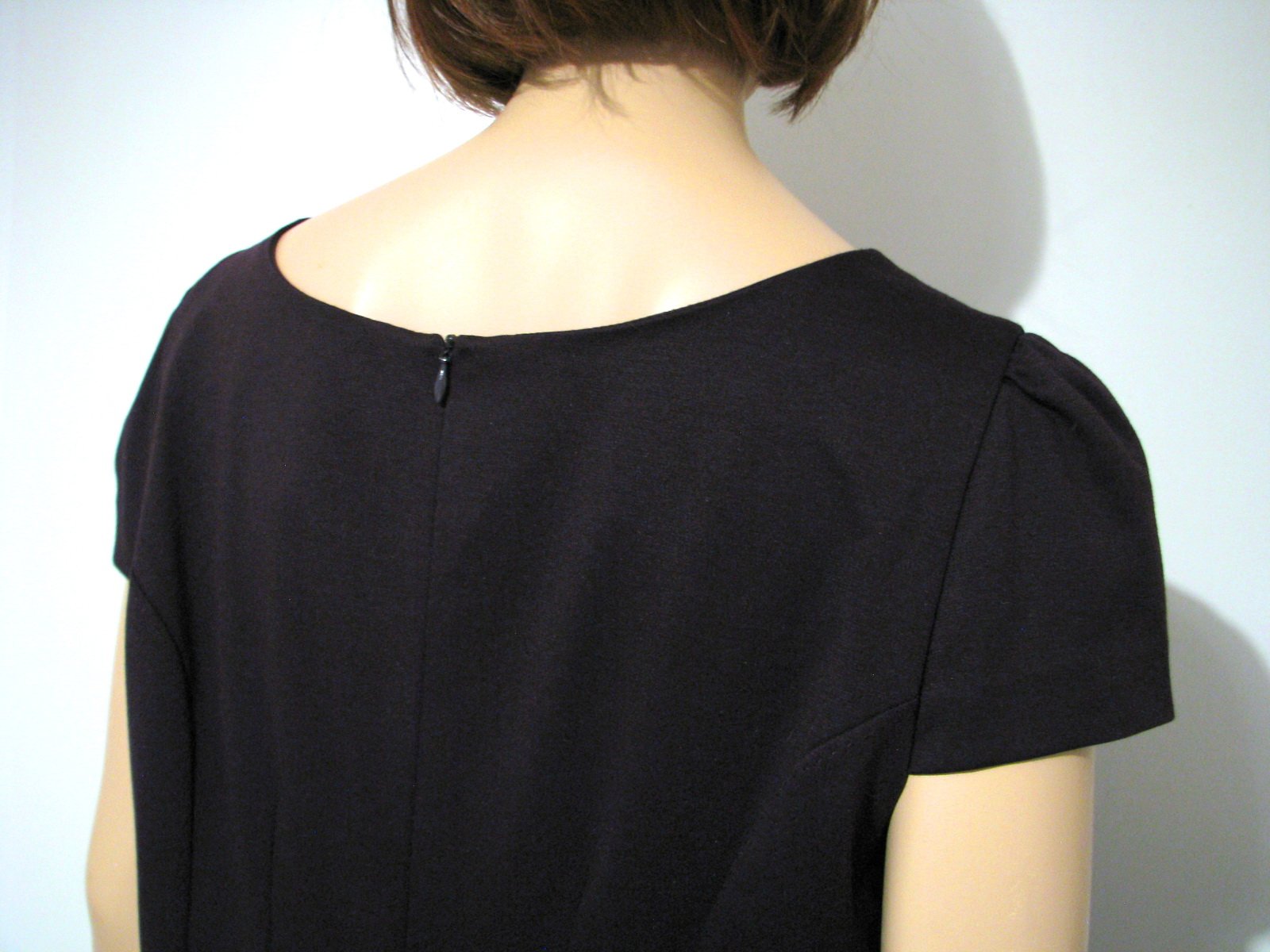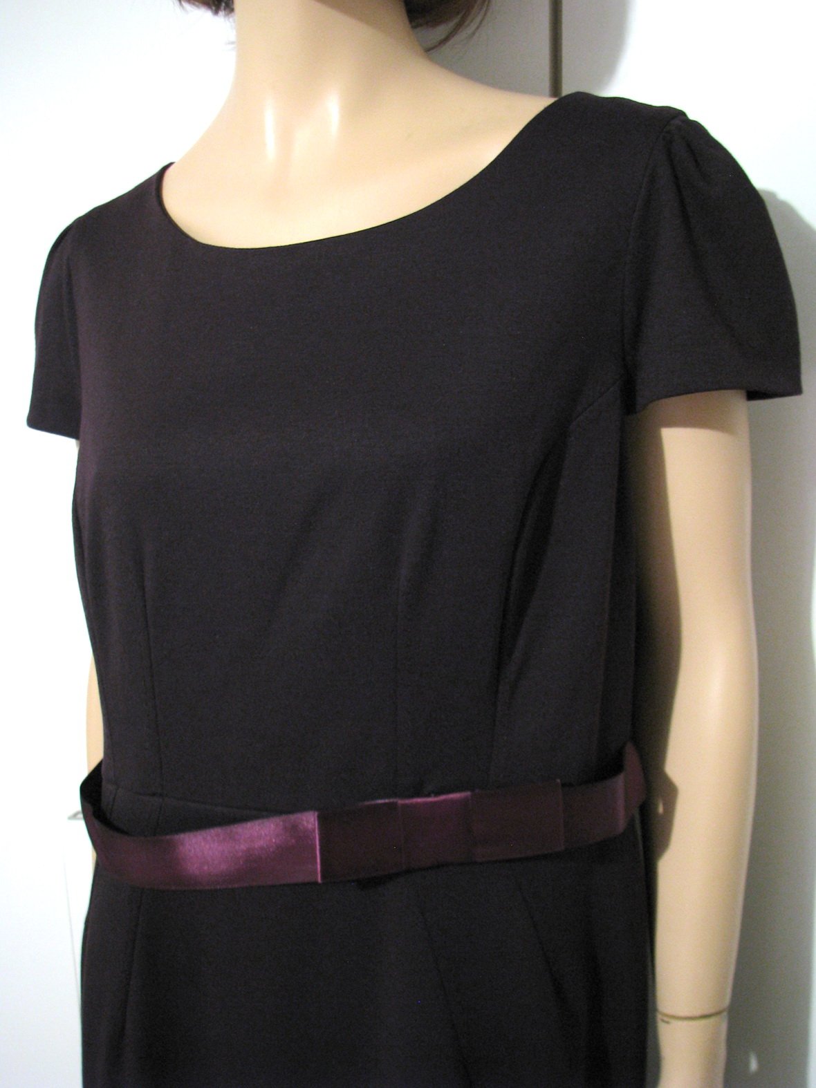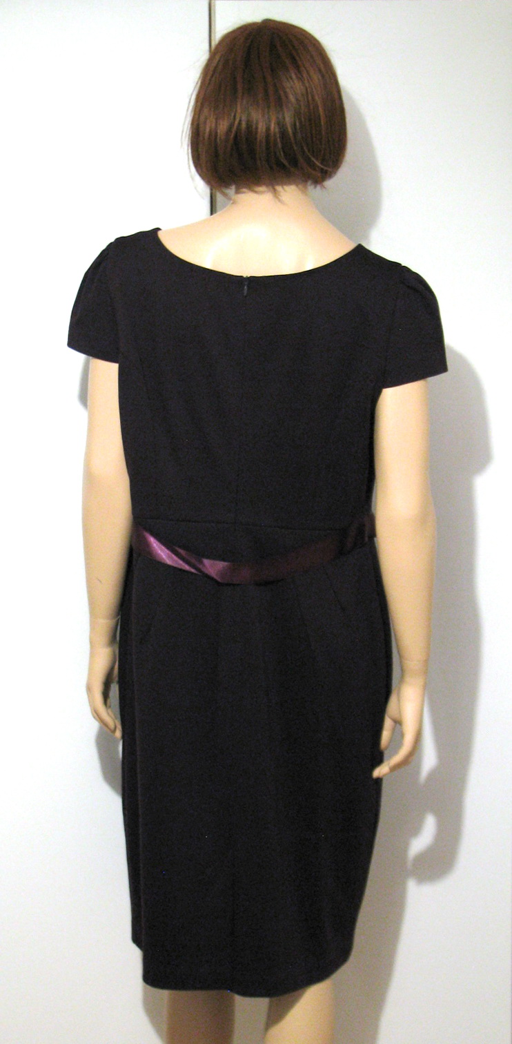 Úpletové šaty tmavofialovej farby, s krátkym rukávom. V páse majú prišitú saténovú stužku ako "opasok", figuríne sú šaty veľké, takže na nej visí, inak je stužka normálne rovno. Dodáva šatám eleganciu, takže sú vhodné aj na menšiu spoločenskú príležitosť či návštevu divadla. Prípadne sa dá stužka odpárať a šaty sa dajú nosiť aj bežne, každodenne, napr. do práce. Výborne zachovalé, bez poškodení. Veľkosť uvedená 18, čo by malo zodpovedať 46, no myslím, že sadnú aj na 44. Rozmery: šírka cez prsia je 59 cm, v páse 50 cm, cca v bokoch 64 cm, dĺžka 107 cm.