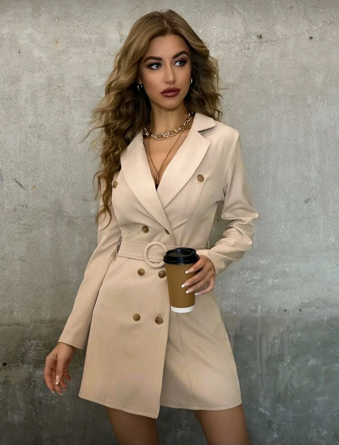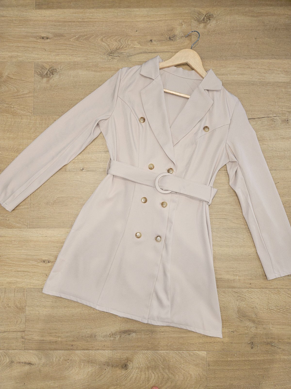 SkladomNenosené béžové šaty, šírka cez prsia 46 cm, dĺžka 84 cm, rukávy 59 cm. Skôr väčšie S-ko (neodporúčam ak nosíte XS). Dajú sa nosiť aj ako šaty aj ako pláštik.