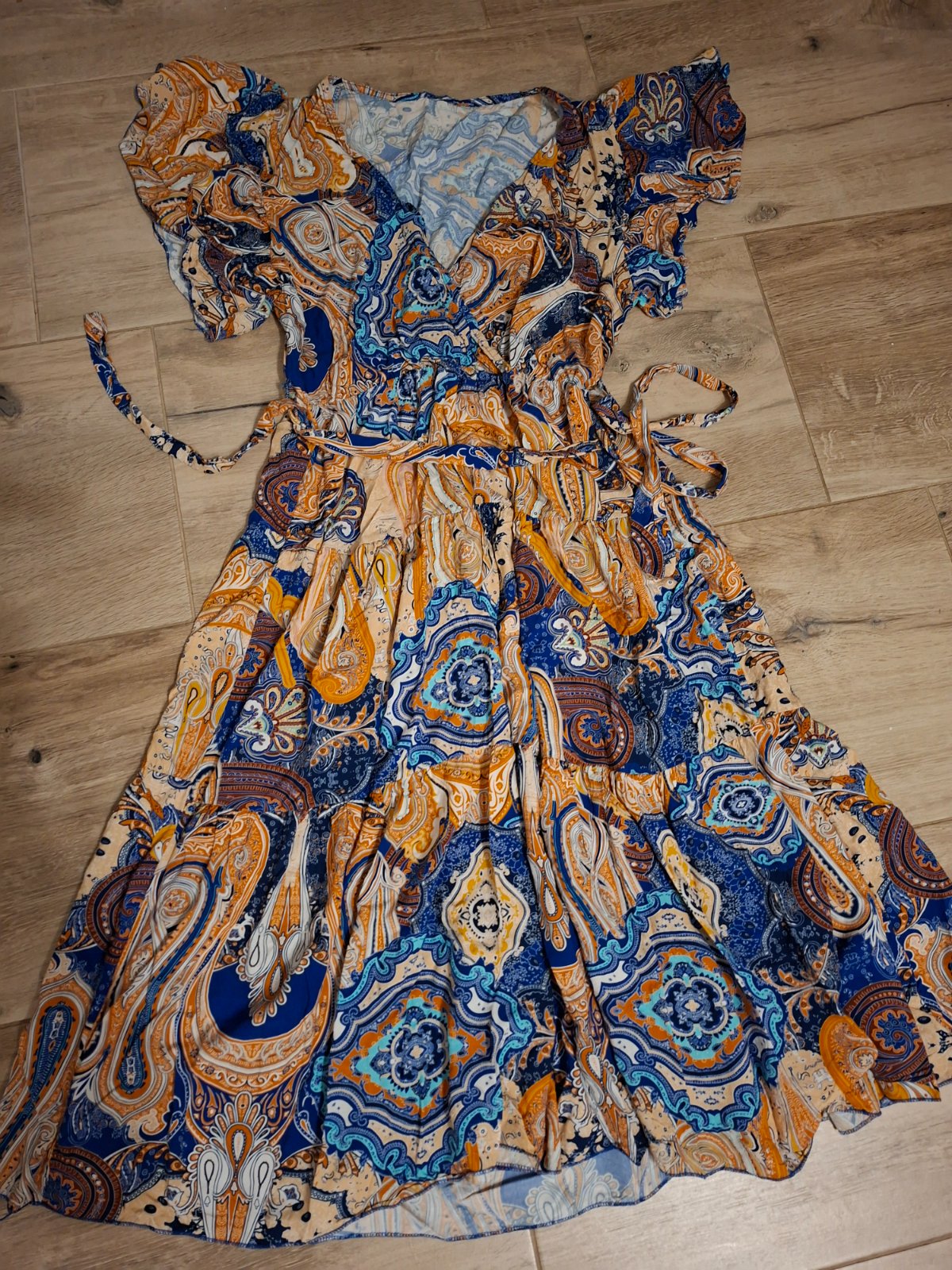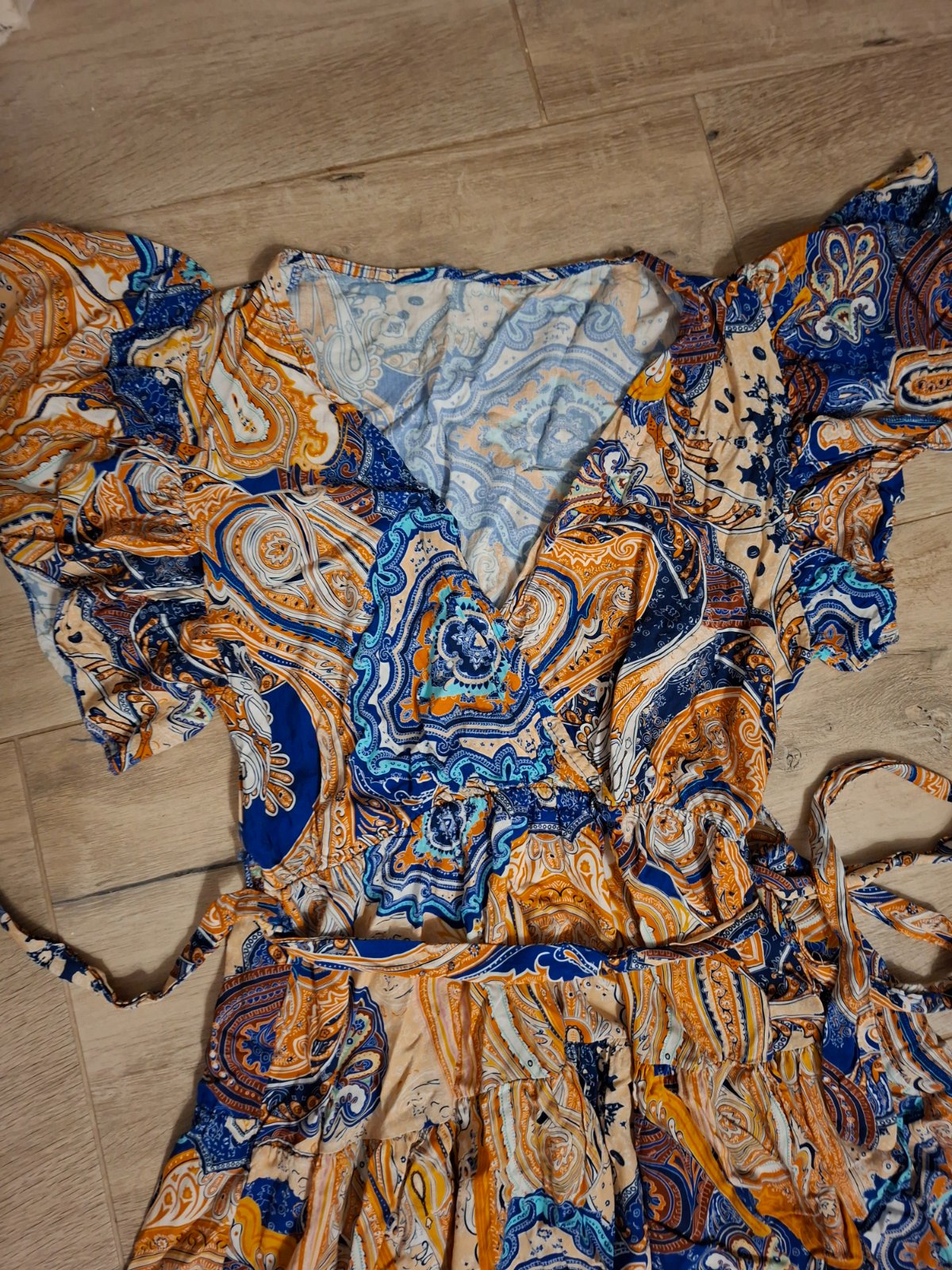 Dlzka 113cm, vpredu su prekladane na prsiach, sadnu na s az m. V pase gum8cka a daju sa stiahnut este snurkou, zaujimave tenke