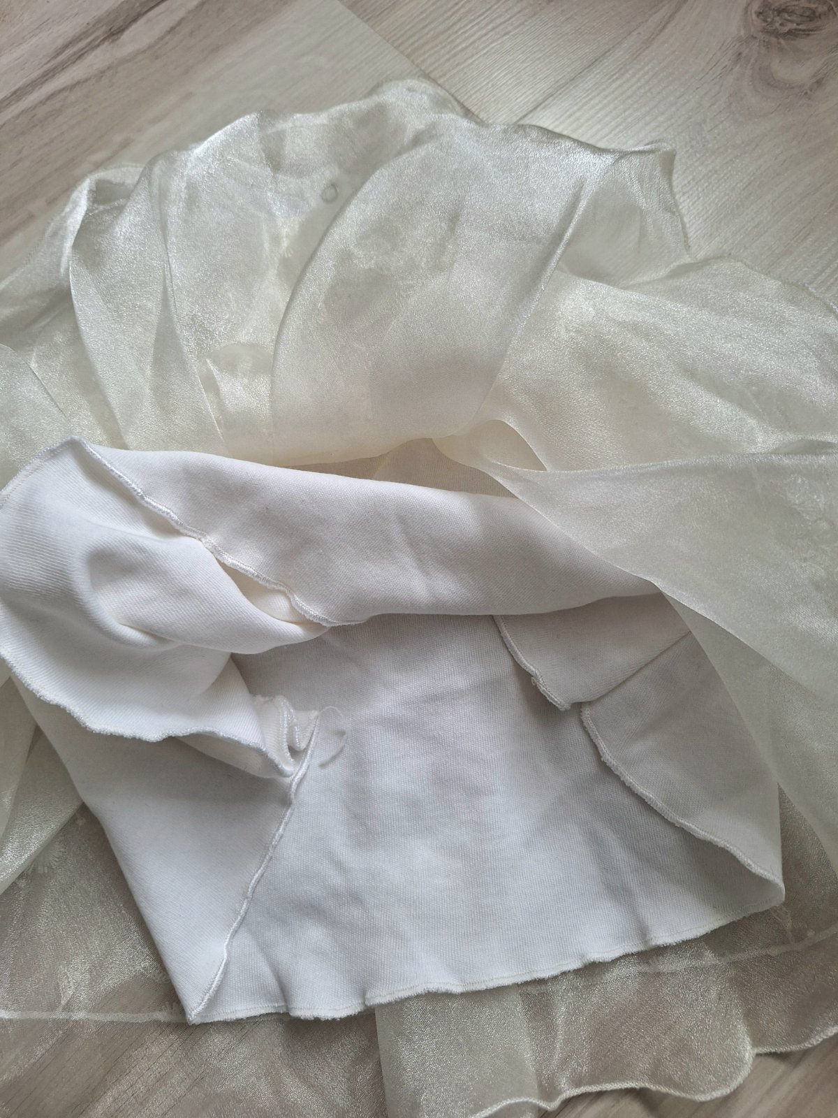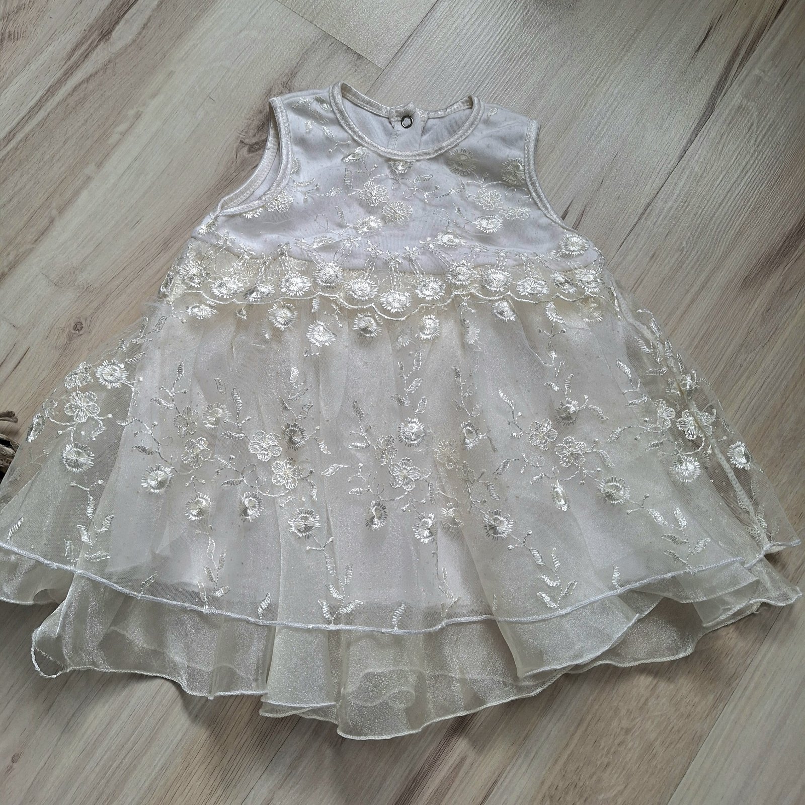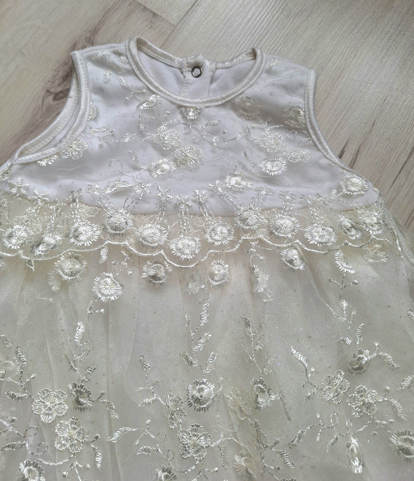 Sviatočné šaty bez poškodenia 1xoblečené na pár hodín, k šatkám sú aj kraťasy na plienku, dĺžka35cm cez prsia 2x22cm. Veľkosť len odhadom píšu že na 9m.