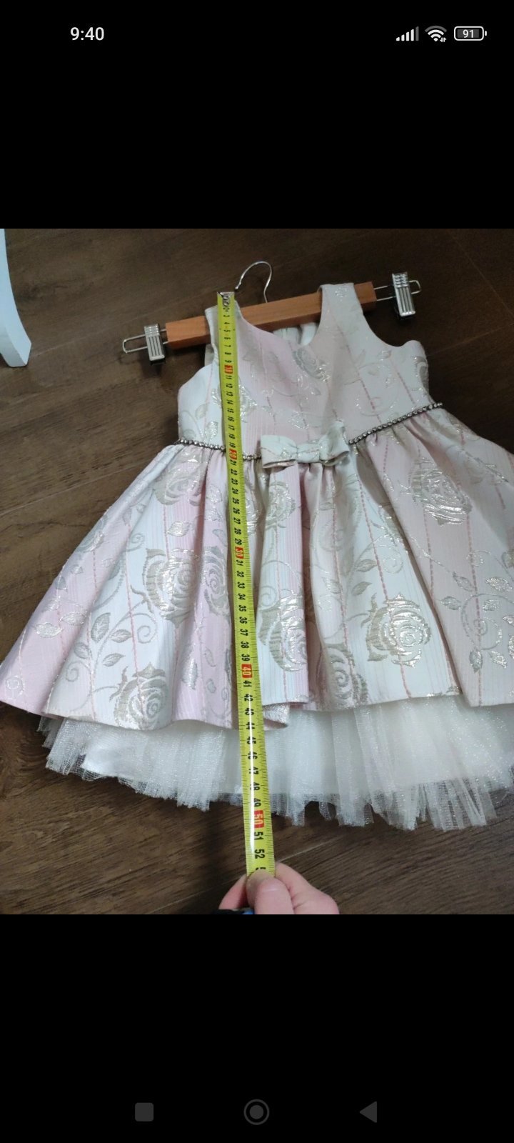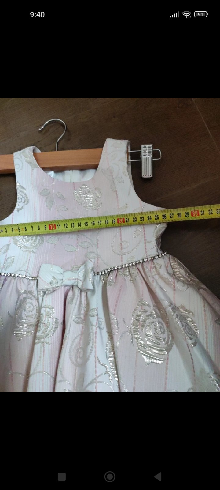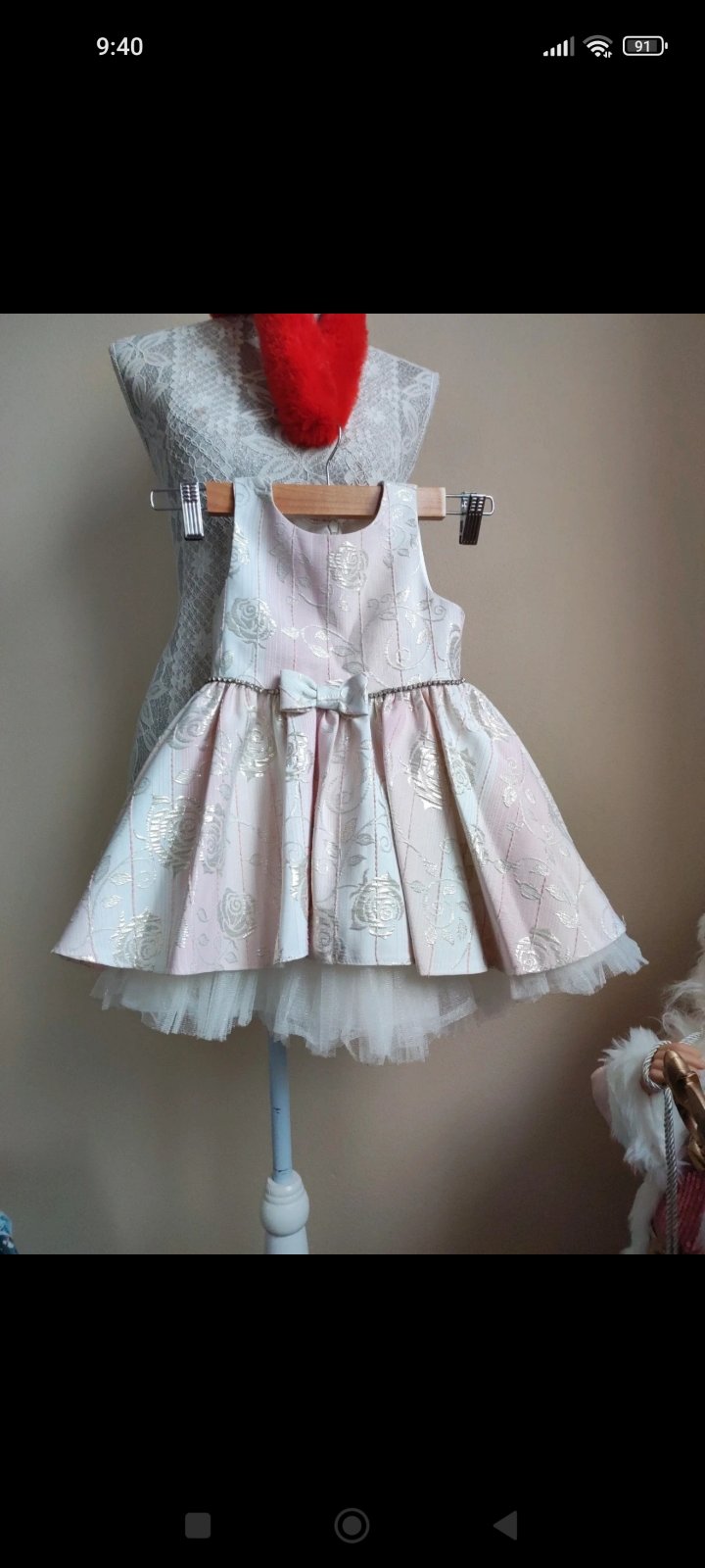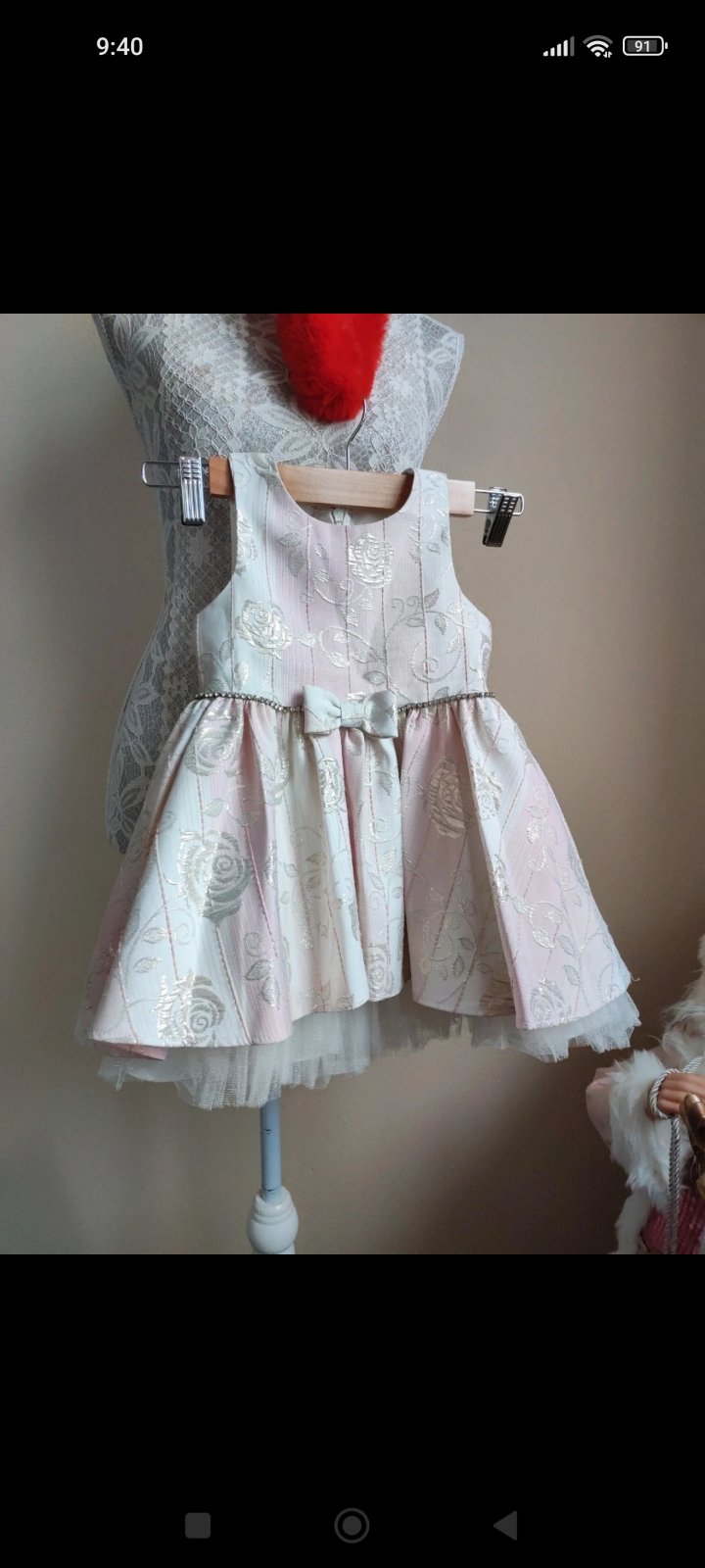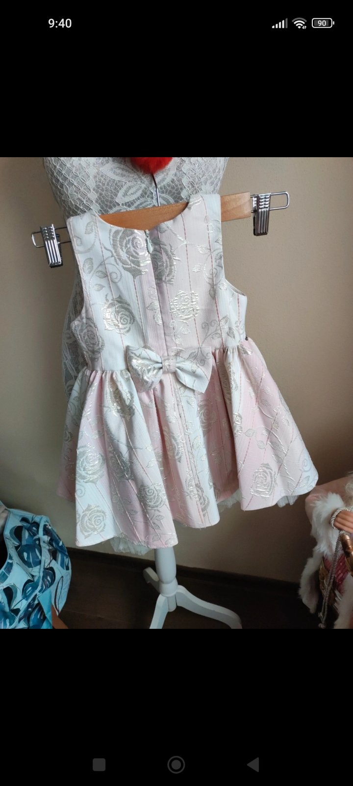 Krásne, jemné, s láskou ušité šaty s dlhým rukávom a volánikmi na pleciach. Vzadu na zips. Veľkosť cca 98/104, rozmery nafotené.