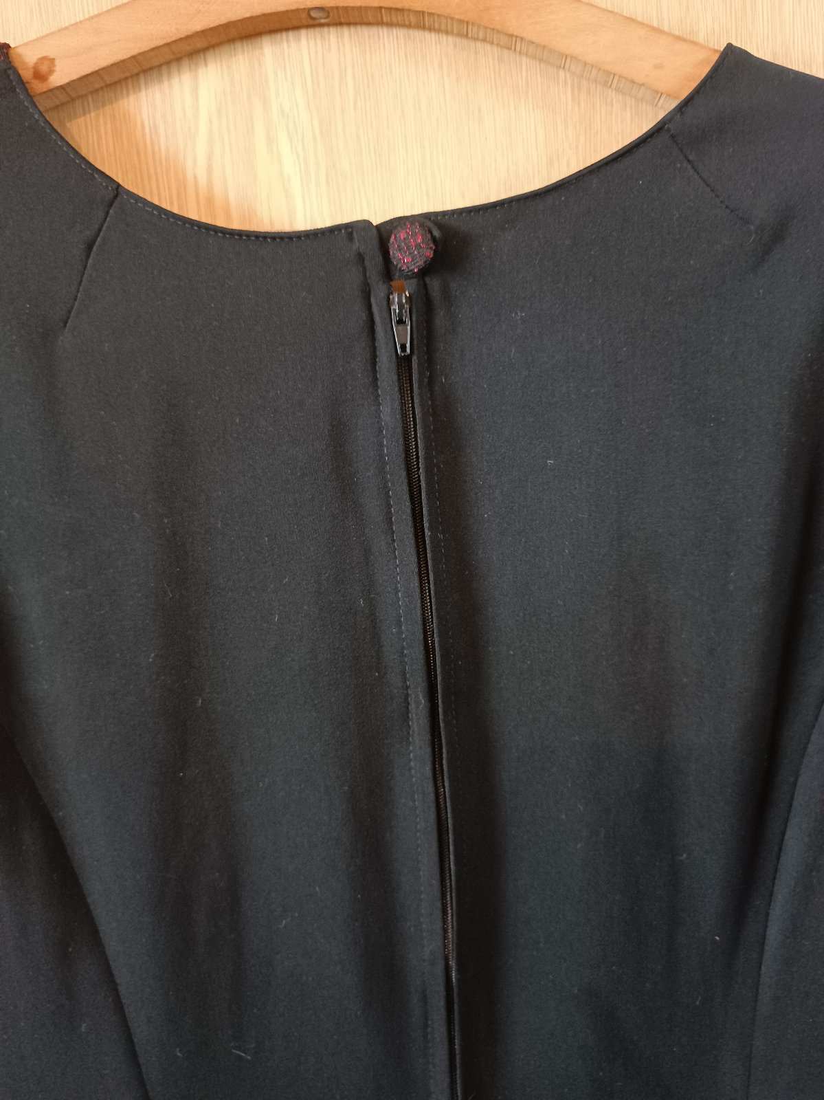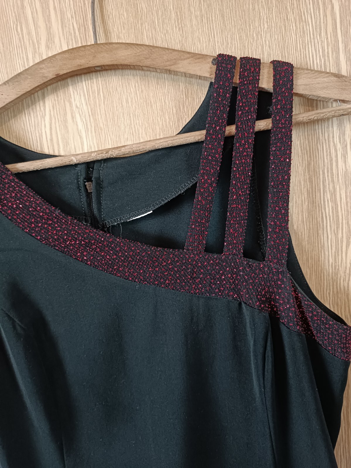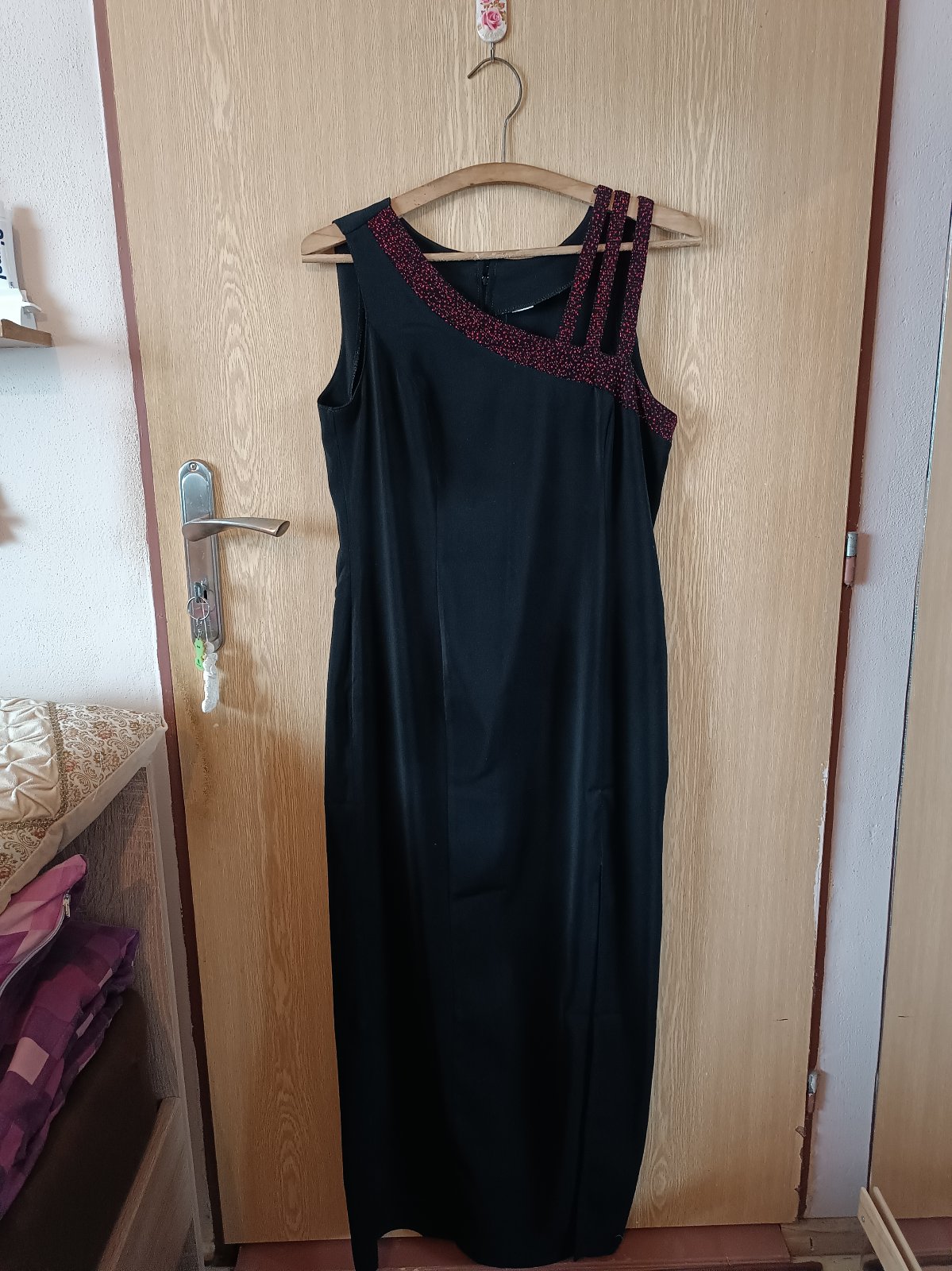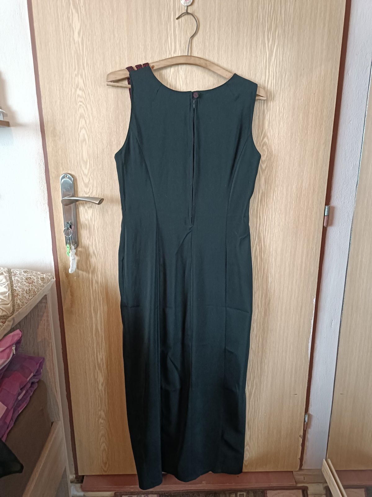 Spoločenské šaty + šatka, značka a veľkosť neuvedená, ale sadne na také L, rozmery: dĺžka od ramien cca 139 cm, šírka vpredu pod pazuchami cca 50 cm, šírka pás vpredu cca 45 cm, cena 25 €, pôvodná cena bola 66 €. S rozparkom, vzadu na zips a gombík.