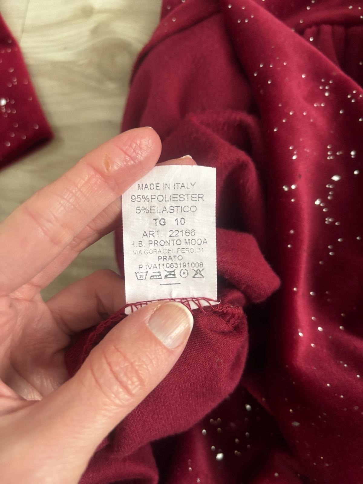 Farba je pekná bordová,nie červená. Vhodná pre silnejšie dievčatká. Látka je zamatová pretkaná zo zlatou niťkou.