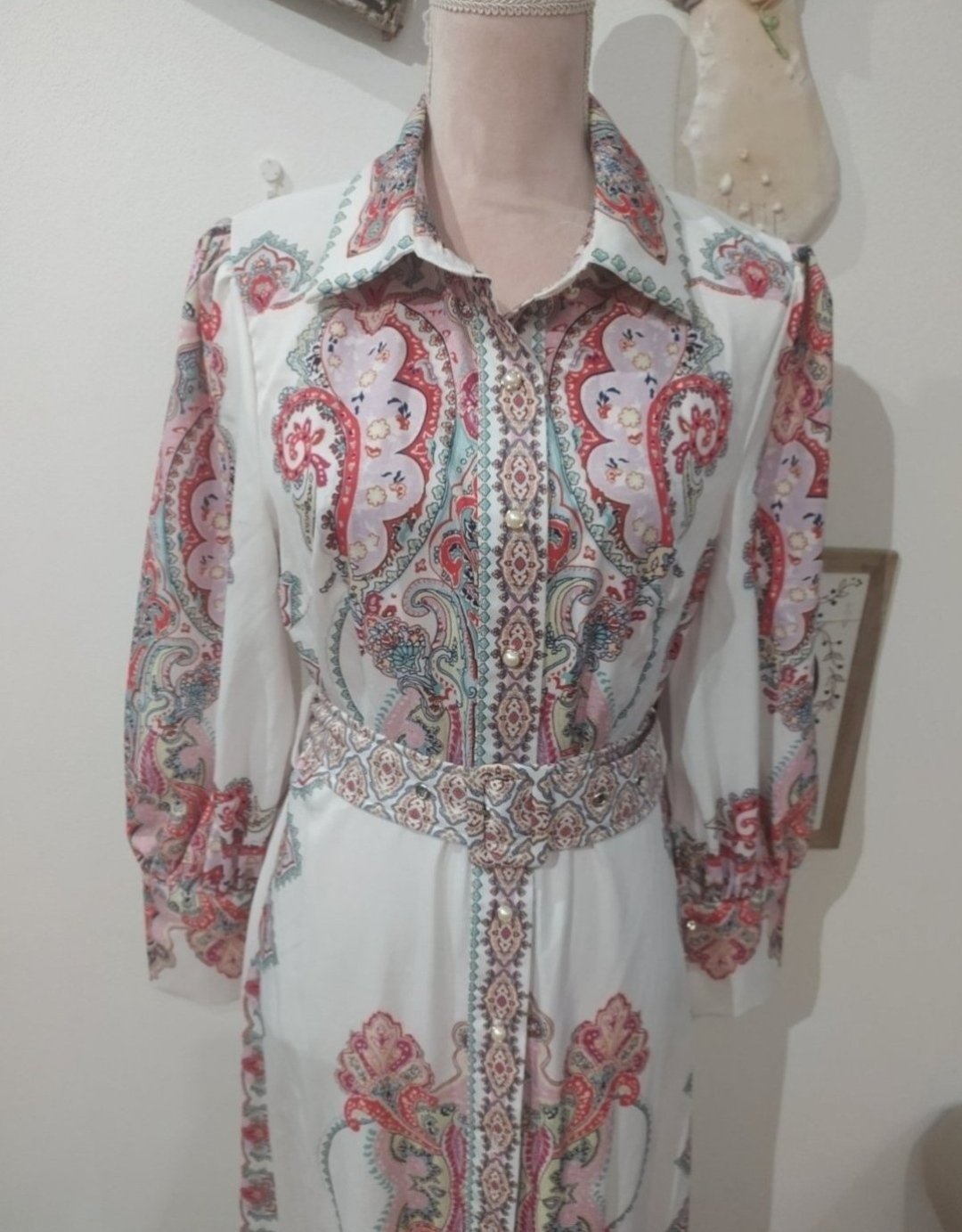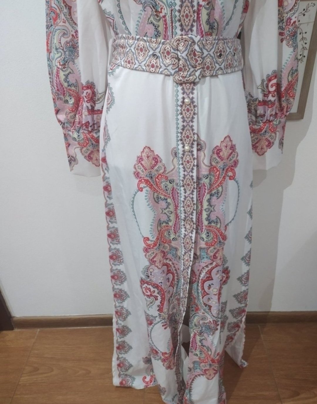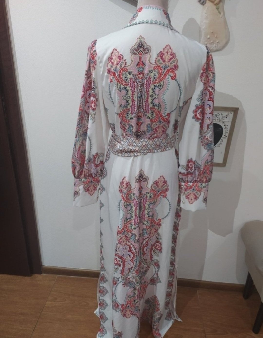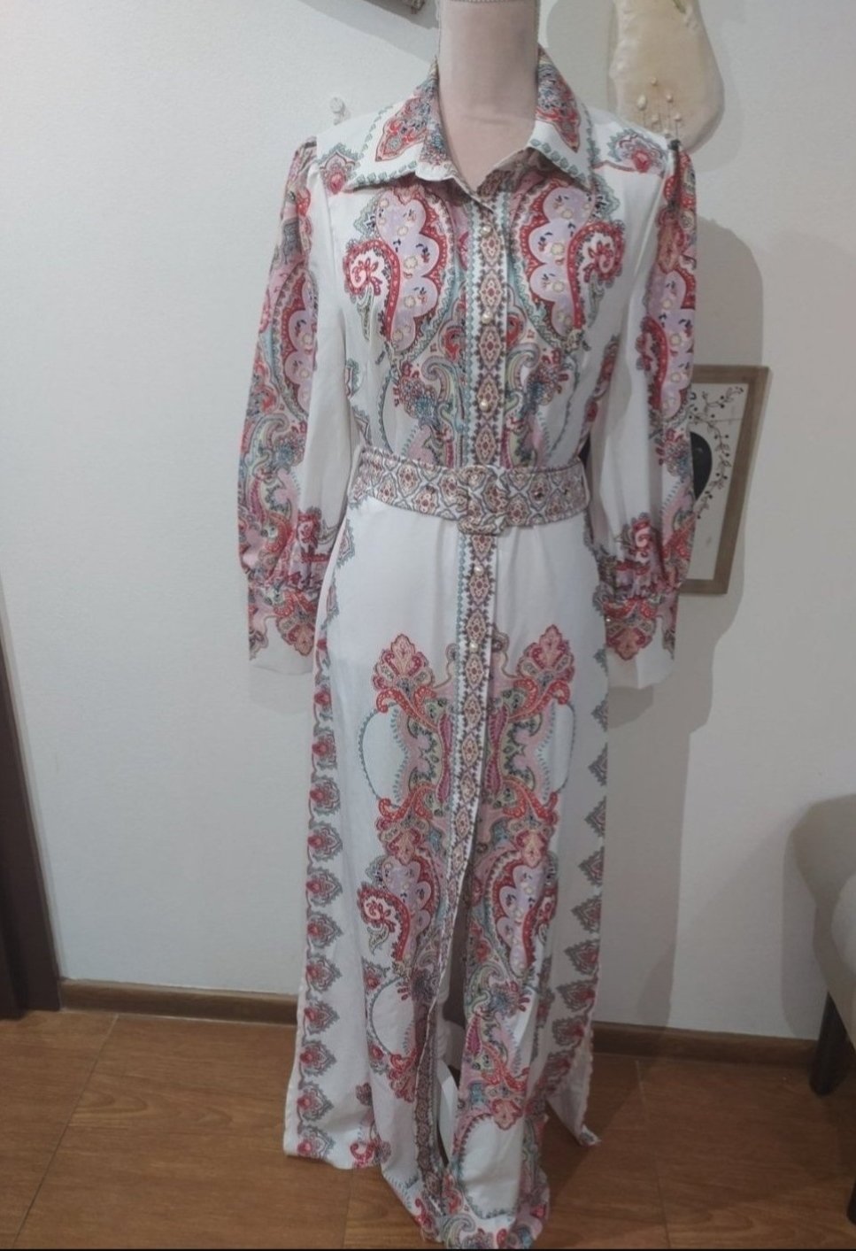 Košeľové maxi šaty,v top stave.Rukavy naberane ukončené širokou manžety,zapínanie po celej dĺžke,po bokoch razporky.Vel Uni vhodné pre veľ S-M