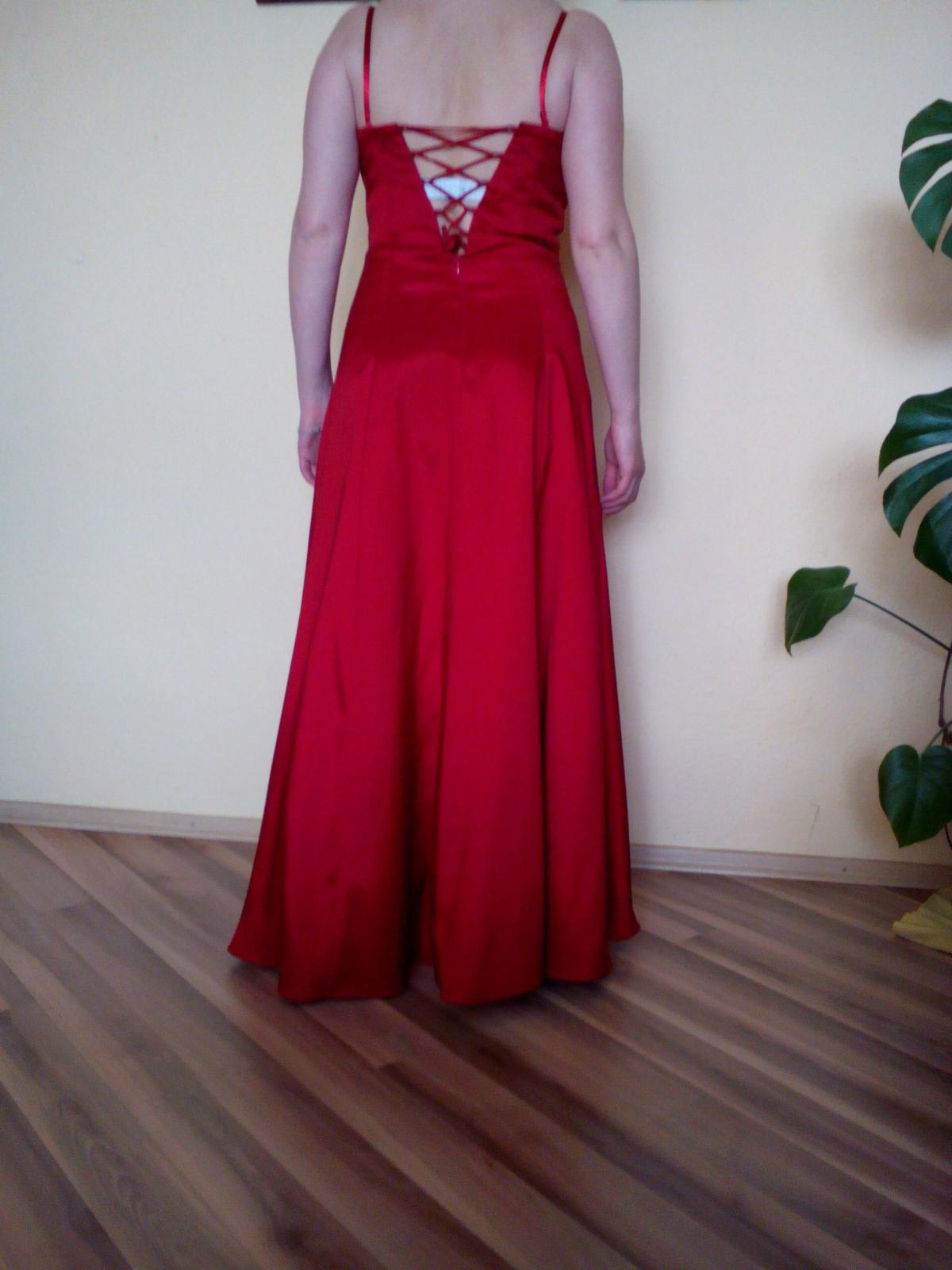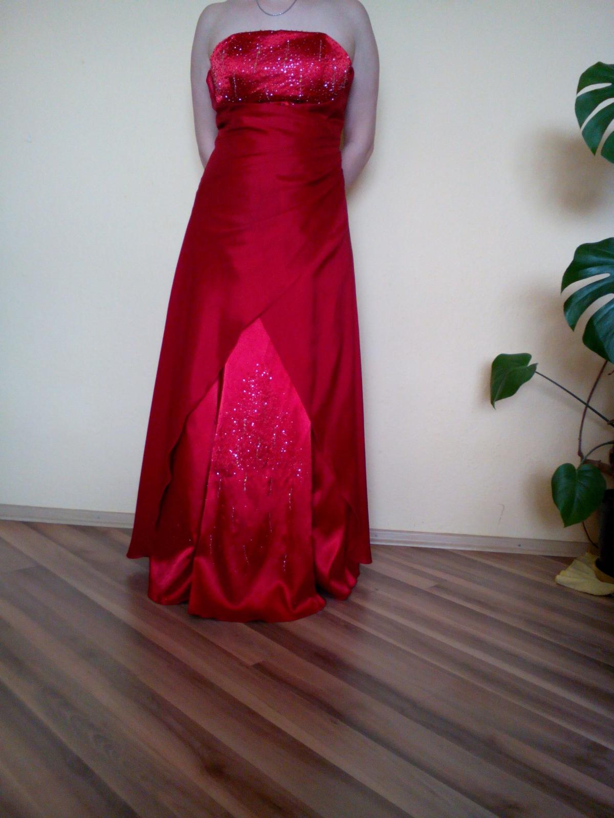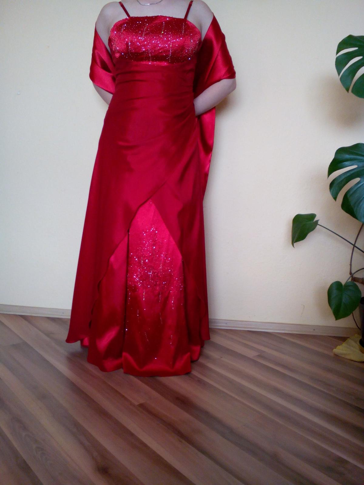 Predám elegantné dlhé spoločenské šaty, červenej farby, na prsiach aj na spodku sukne sú vyšité lesklé perličky červenej a bielej farby. K šatám je aj štóla a obnímatelné ramienka. Velkosť 38-40, značky Zaira. Len a len osobný odber