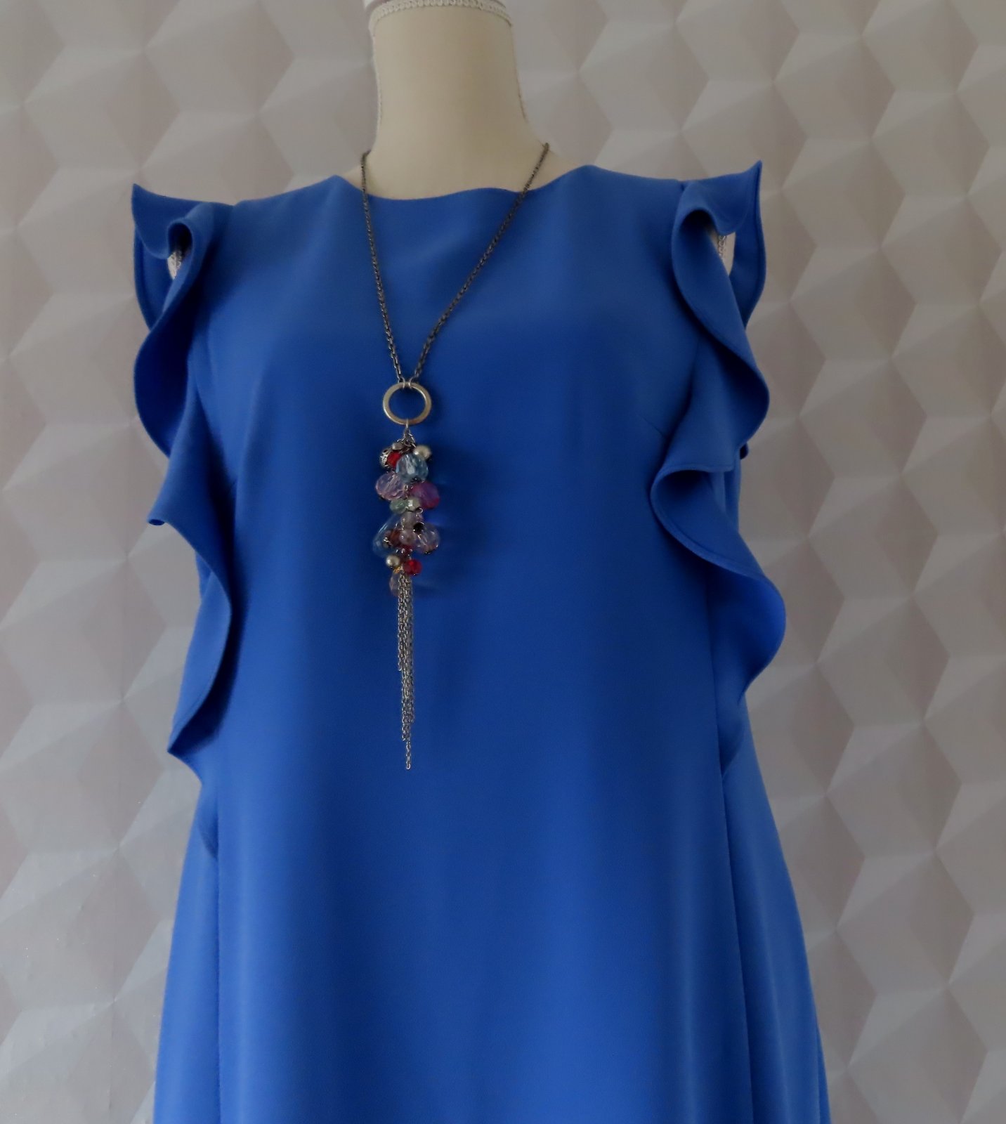 Šaty sú pekne šité, tvarujú postavu. Rukávky nemajú, ale majú tam krásne volániky, ktoré ich robia nevšednými. Dlžka šiat je pod kolená. Zapínanie vzadu na dlhý zips.