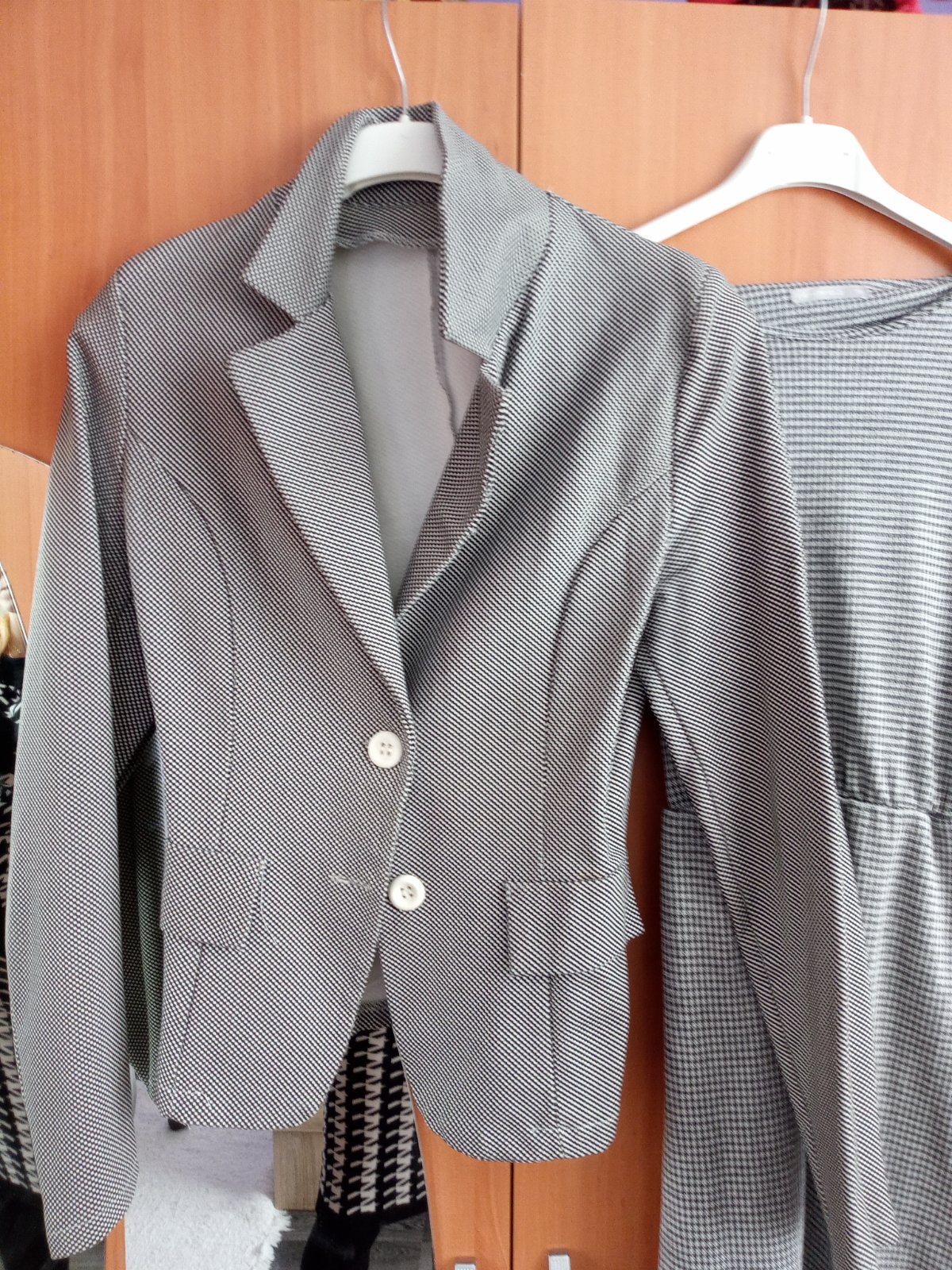 Damske saty- nove, bez visacky- ony nikdy nemali visacku, prisli take z obchodu. Zlozenie nie je uvedene- odhadujem to na 100% polyester. Su take sedo-hnede. Velkost je uvedena ako S, podla mna moz...
