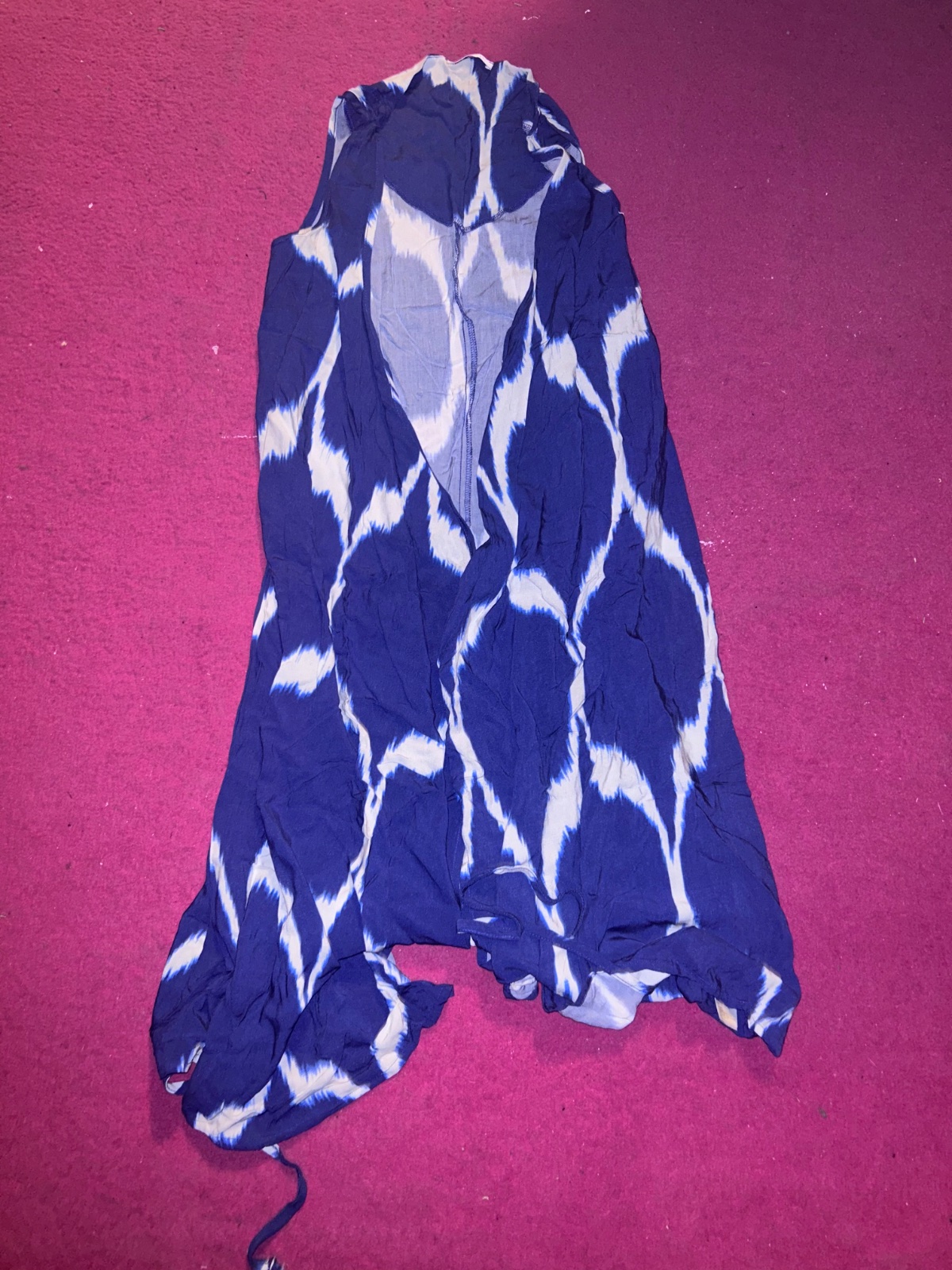 Ľahká, vzdušná látka, šírka prsia 2 x 48 cm, dĺžka 100 cm, v páse je guma. Farba krásna kobaltová modrá.