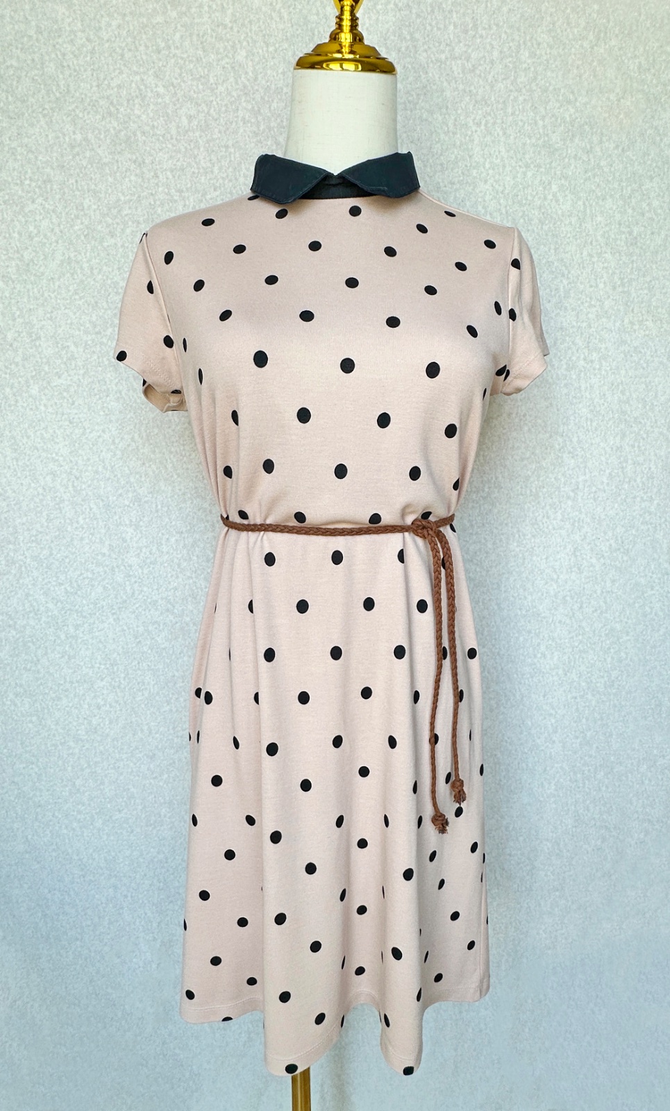 Hravé šaty v jemnej púdrovej ružovej farbe s akcentom čiernych polka dot a golierikom. Dajú sa nosiť navoľno, alebo previazané opaskom (na fotkách je len pre ilustráciu, nie je k šatám). Zapínanie na chrbáte na skrytý zips.
