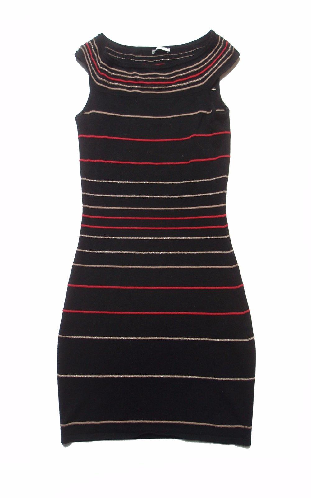 čierne s červenými a zlatými pásikmi, príjemný mäkký úplet (nie tenká tričkovina), ktorý je ale dobre elastický, takže pekne tvaruje postavu, veľmi dobrý stav, uv. veľ. S dl. 88cm, do šírky sa roztiahnu podľa potreby.