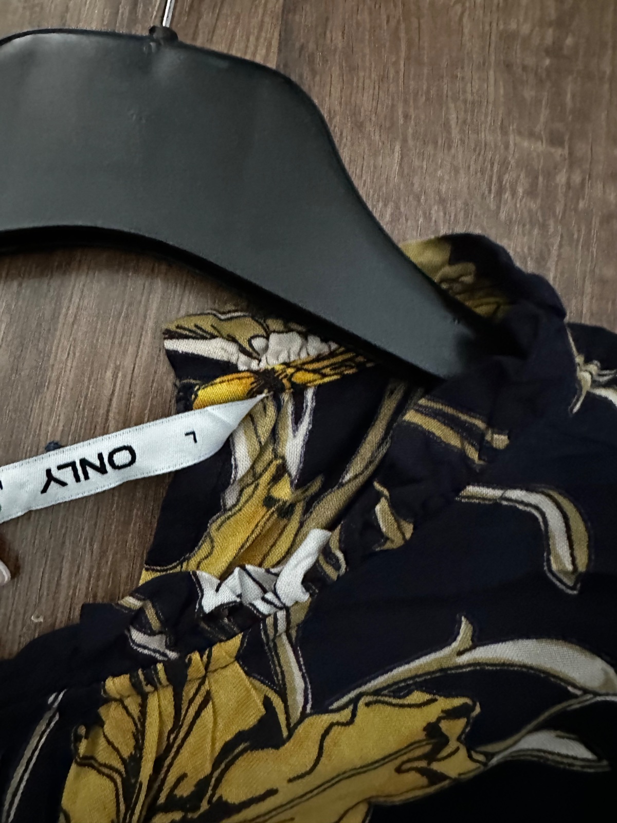 Predám krásne vzorované šaty s dlhým rukávom a výraznou kvetinovou potlačou v odtieňoch žltej, bielej a hnedej na tmavomodrom podklade. Šaty majú ženský strih so zvýrazneným pásom a volánovou sukňou, ktorá pôsobí ľahko a vzdušne. Zapínanie je riešené na chrbte so gombíkom. Rukávy sú ukončené gumičkami pre pohodlné nosenie. Veľkosť je L. Ideálne na jar, leto či teplejšie jesenné dni – vhodné do práce, na bežné nosenie aj príležitosti. V perfektnom stave, bez známok poškodenia.