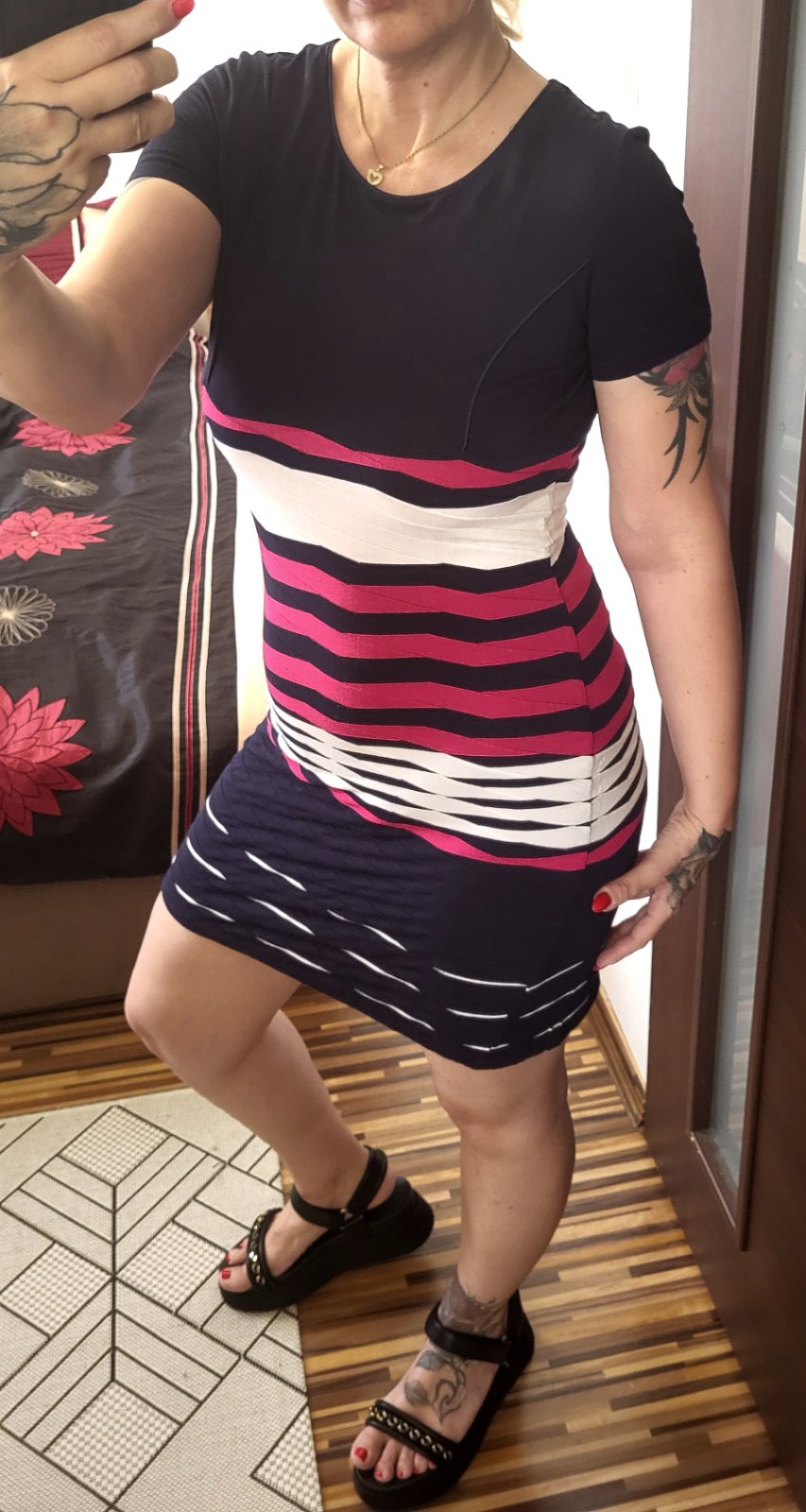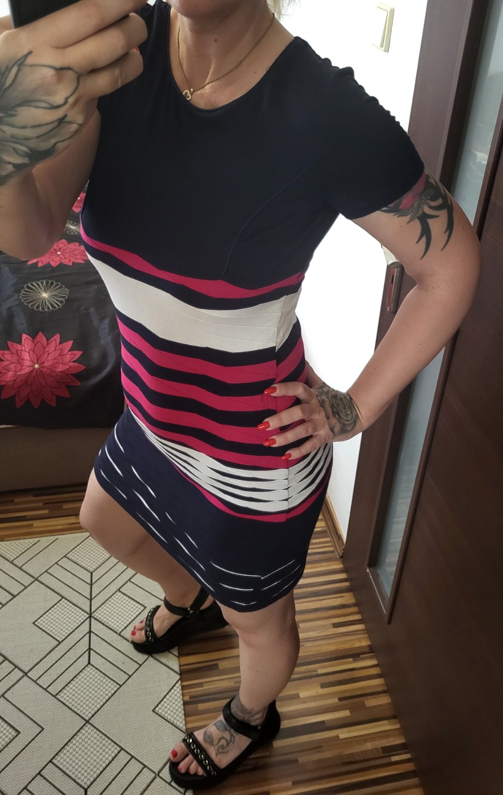 veľmi dobrý stav, robia peknú postavu, elastické, pohodlné, dovezené z Anglicka, farba námornícka/rúžová/biela, celková dĺžka 89cm a šírka pod pazuchami 45x2 až 55x2, poštovné doporučene 3€, obyčajne sa nedajú poslať