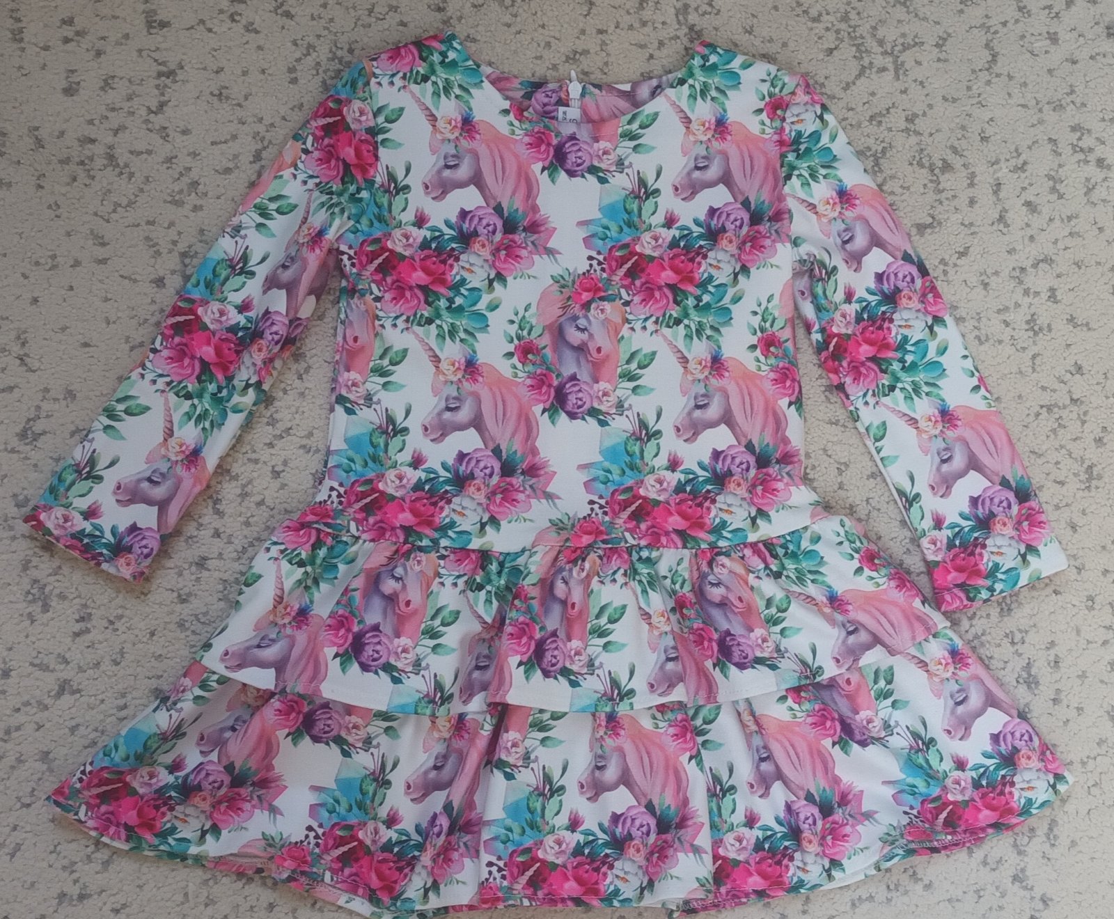 Krásna vetlomodrá vtáčiková tunika/šaty s okrasnými rukávikmi- velkosť 104. Rozmery (dĺžka rukáva od šitia na pleci-35cm, dlžka celej tuniky - 50, širka cez prsia 33cm