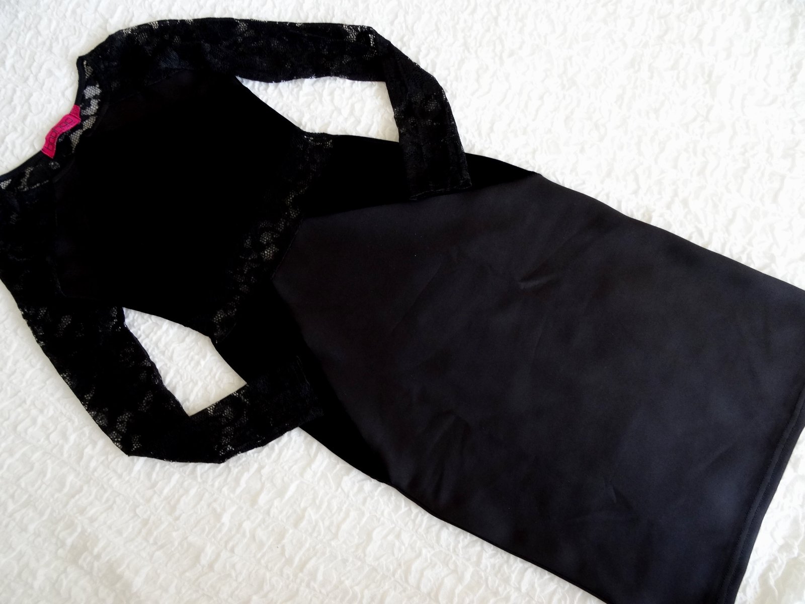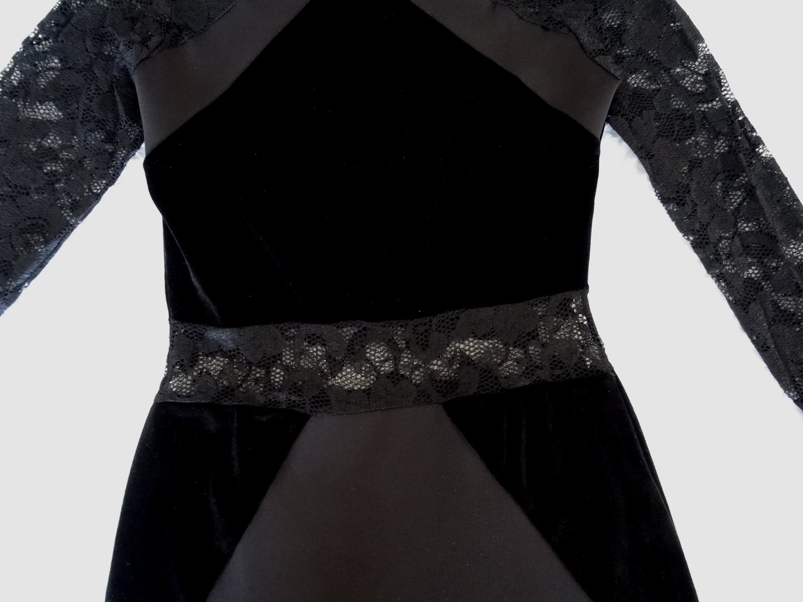 Celé šaty sú sýto čierne, kombinácia 3 druhov látky - hore je elastická čipka, cez prsia a pás jemnučký zamat a dole čierny hrubší úplet - vyzerá svetlejší ale je sýto čierny - je to len fotením.