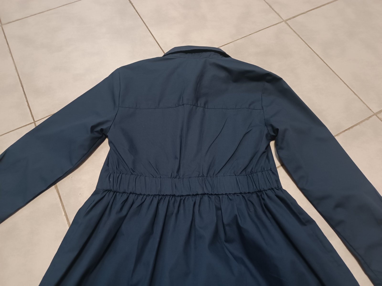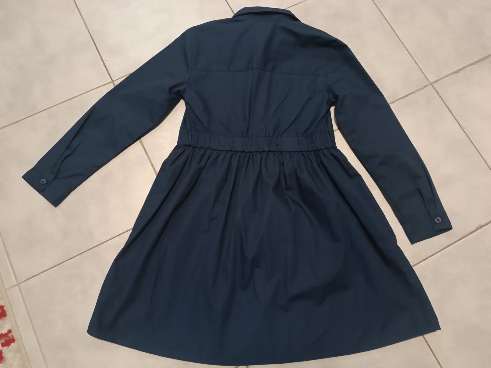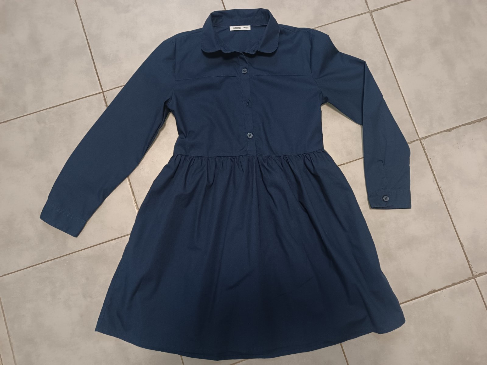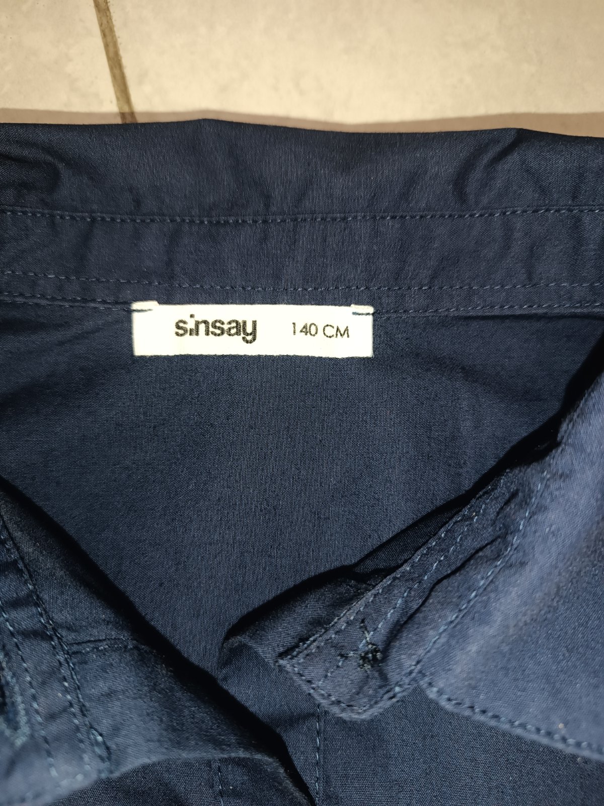 Košeľové šaty, zn. Sinsay, veľ. 140, tmavomodrá farba - oblečené raz, nevyblednuté, výborný stav, ako nové. Vzadu gumička. Celková dĺžka 74cm, rukáv 49cm, šírka pod pazuchami 36cm. 50% bavlna, 50% polyester.