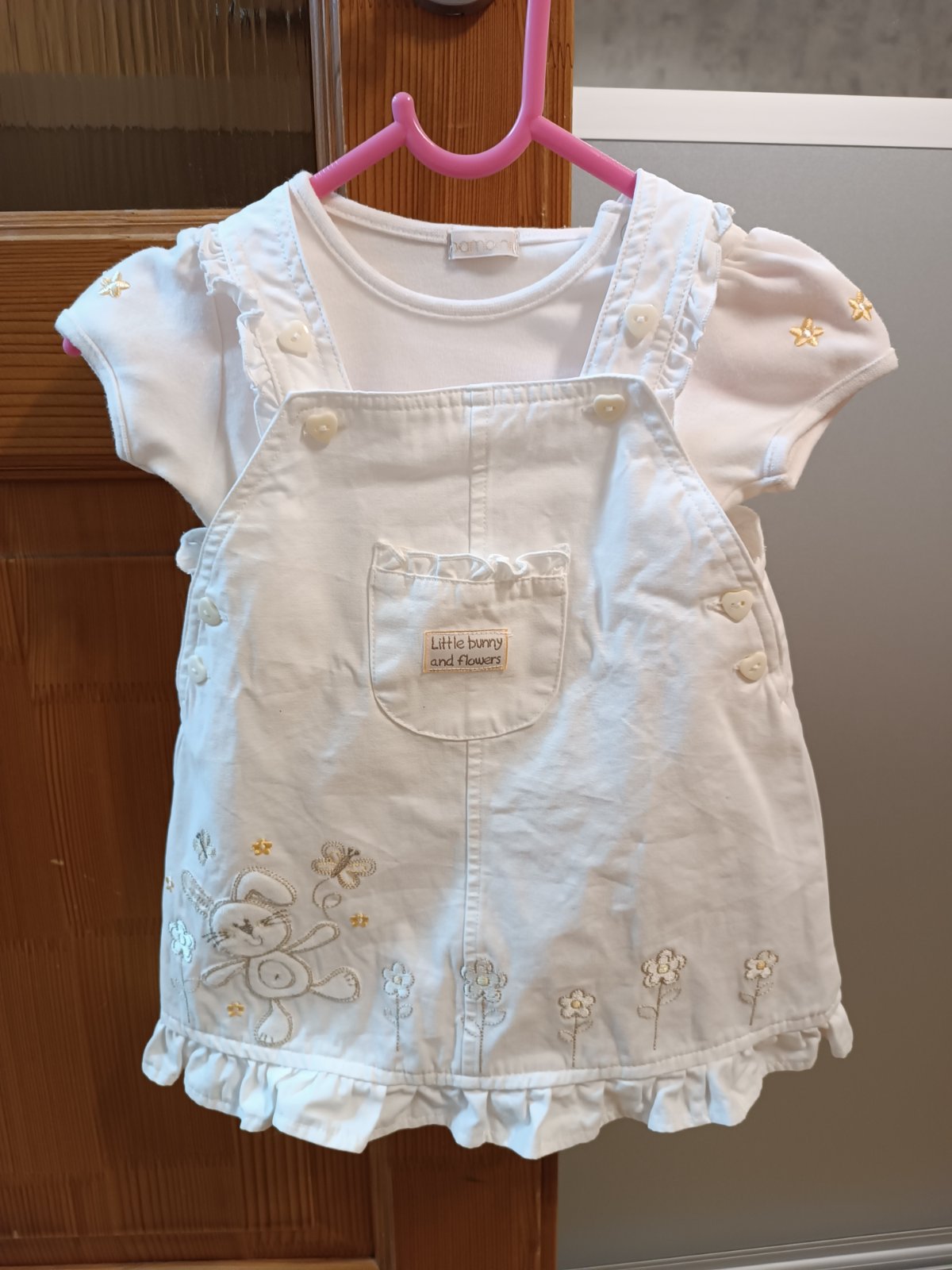 Šaty bez poškodení, veľkosť uvedená na 9-12 mesiacov, krátky rukáv, mašličky sú prišité,dlžka šiat meraná od ramena-44cm, šírka meraná pod pazuchami-22*2(obvod) zloženie70% bavlna, 28% polyester, 2...