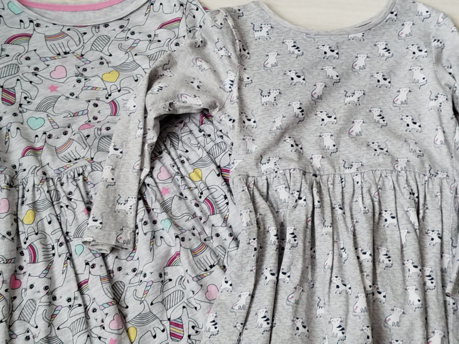 Predám šatočky, pre dievčatko vo veku 4-5 rokov. Veľmi dobrý stav. Na šatoch s farebnými mačičkami tmavšia časť, detail na foto, vidieť len pri detailnom prezeraní. Cena spolu. Predám aj zvlášť.