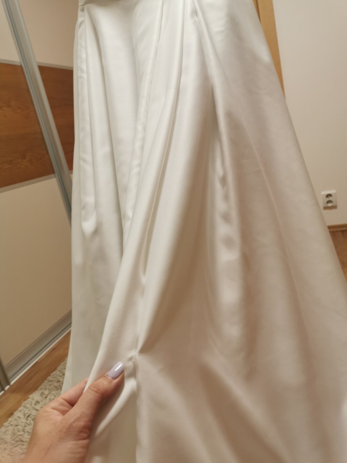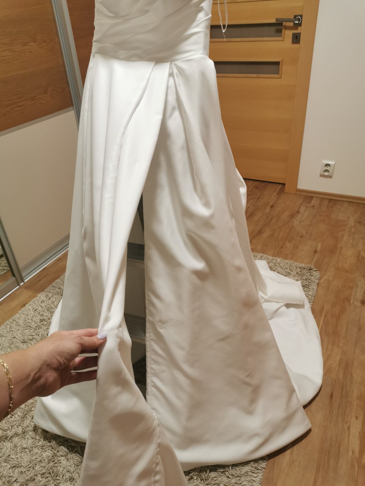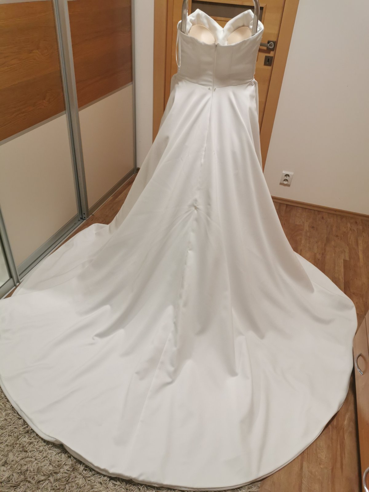 Krásné, jednoduché, elegantné a nadčasové, jednoducho nádherné svadobné šaty s vlečkou. Vnútri na chrbáte je šnurovačka, ktorú prekrýva zips. Rázporok je možné zapnúť na dva úrovne. Vlečka sa zapína vyššie na gombík na dva gumičky. Šaty majú všité výplne na prsia vo veľkosti A/B, ktoré je možné odpárať v prípade väčších pŕs. Nevesta na fotke má výšku 176cm (topánky s 3cm opätkom na nohách). Dĺžku vie krajčírka skrátiť. Šaty boli kúpené nové a použité 1x.