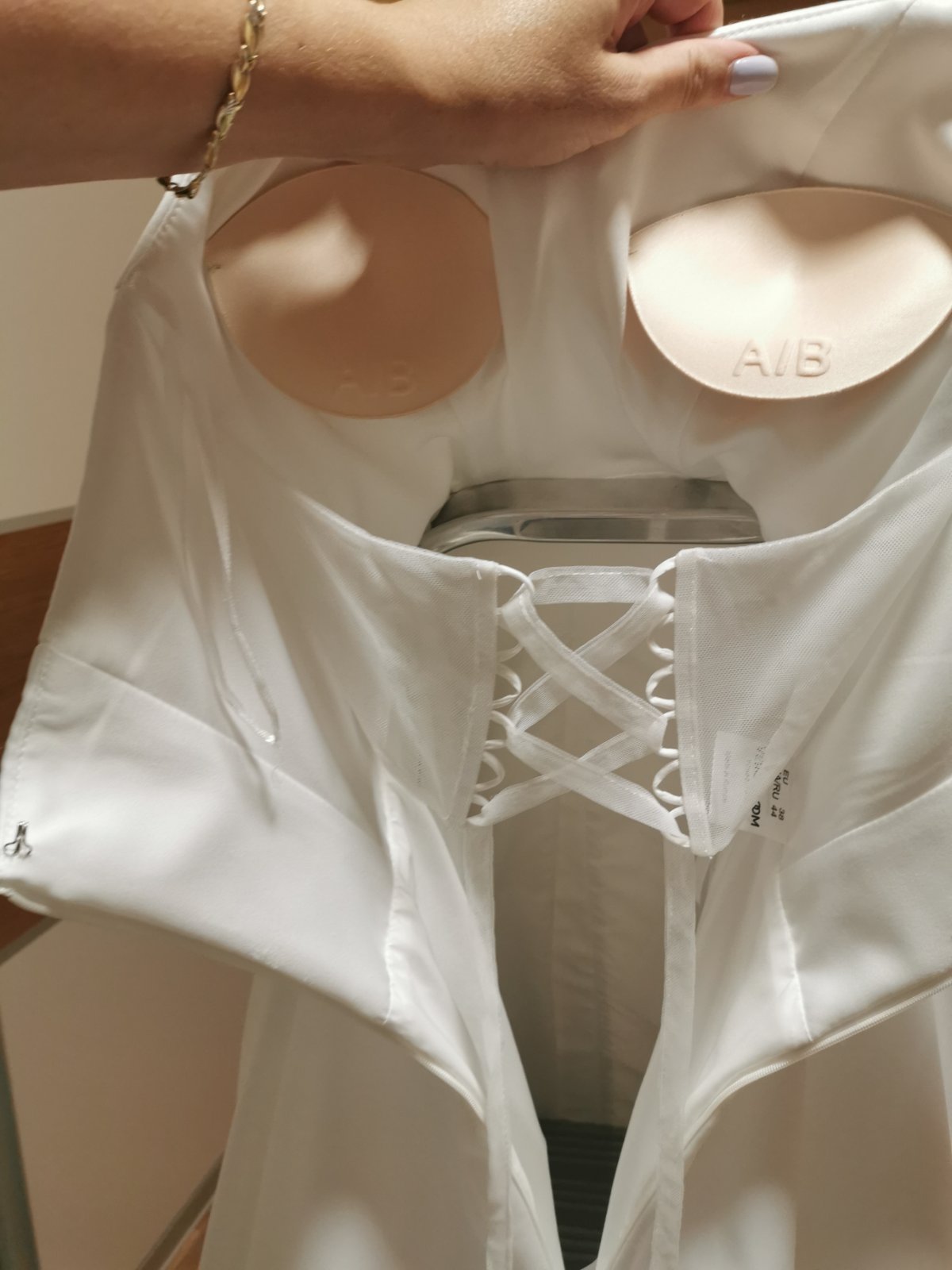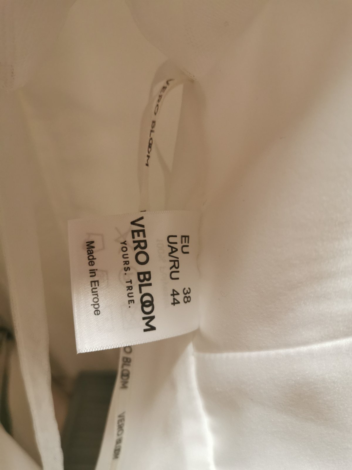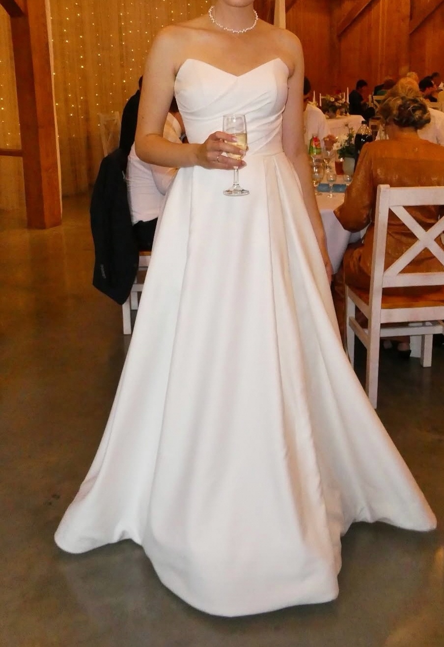 Krásné, jednoduché, elegantné a nadčasové, jednoducho nádherné svadobné šaty s vlečkou. Vnútri na chrbáte je šnurovačka, ktorú prekrýva zips. Rázporok je možné zapnúť na dva úrovne. Vlečka sa zapína vyššie na gombík na dva gumičky. Šaty majú všité výplne na prsia vo veľkosti A/B, ktoré je možné odpárať v prípade väčších pŕs. Nevesta na fotke má výšku 176cm (topánky s 3cm opätkom na nohách). Dĺžku vie krajčírka skrátiť. Šaty boli kúpené nové a použité 1x.