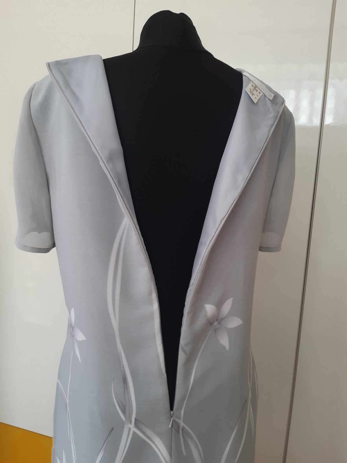Pekné šaty na sviatočnú príležitosť, ale aj bežne. Šaty majú podšívku, vrchný, aj spodný materiál je 100% polyester. Vrchná časť je základ svetlo -šedá látka, ktorá je ušitá spolu s podšívkou. Na tejto látke je ďalšia tenká látka podobná šifónu, je so vzorom, v strede, aj na bokoch je po boky od spodu prestrihnutá po bokoch, aj v strede. DL. 97 cm, šírka cez prsia 47x2 cm, pas 38x2 cm, boky 46x2 cm. Šaty sú vo výbornom stave, bez poškodenia., nebadať známky použitia.