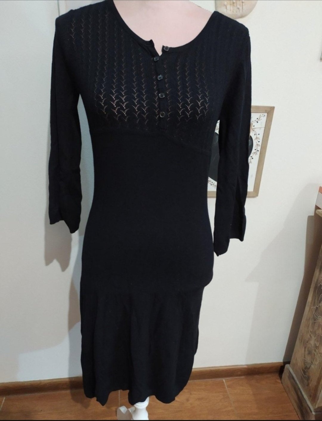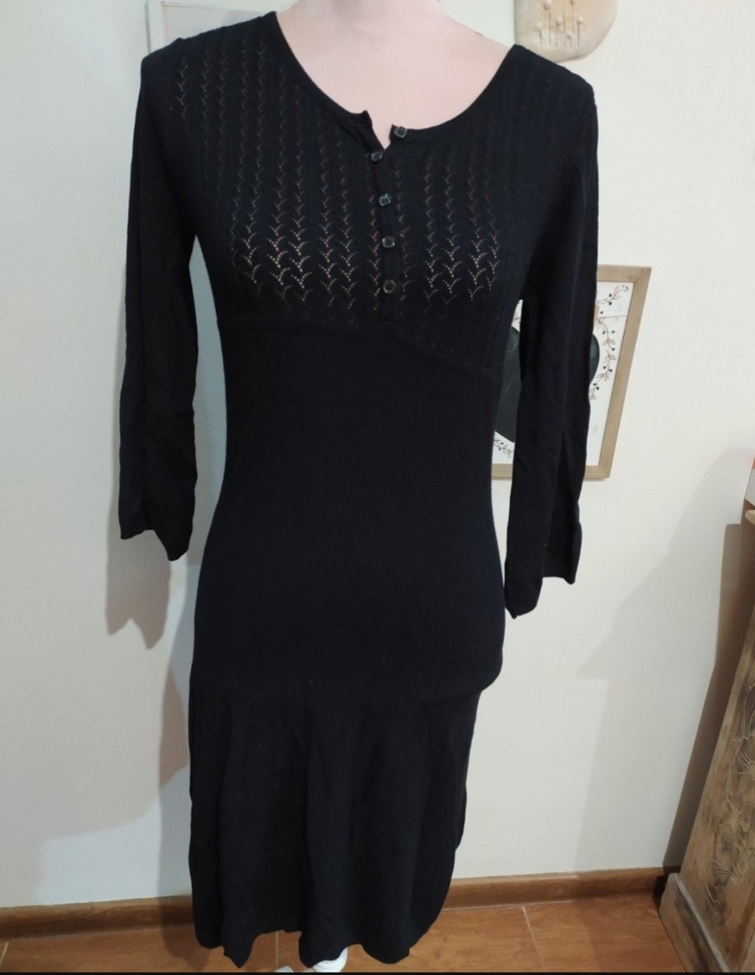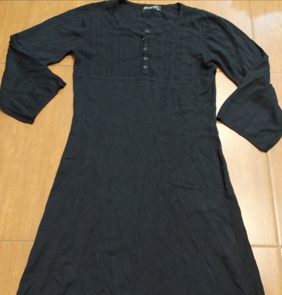 Malo nosenie čierne priliehavé šaty, z veľmi príjemného materiálu s aplikáciou uzlíka na brusku.Saty sa prispôsobia postave, skôr na vyššiu postavu 170cm kvôli dĺžke. Celková dĺžka 110 cm, rukáv 62...