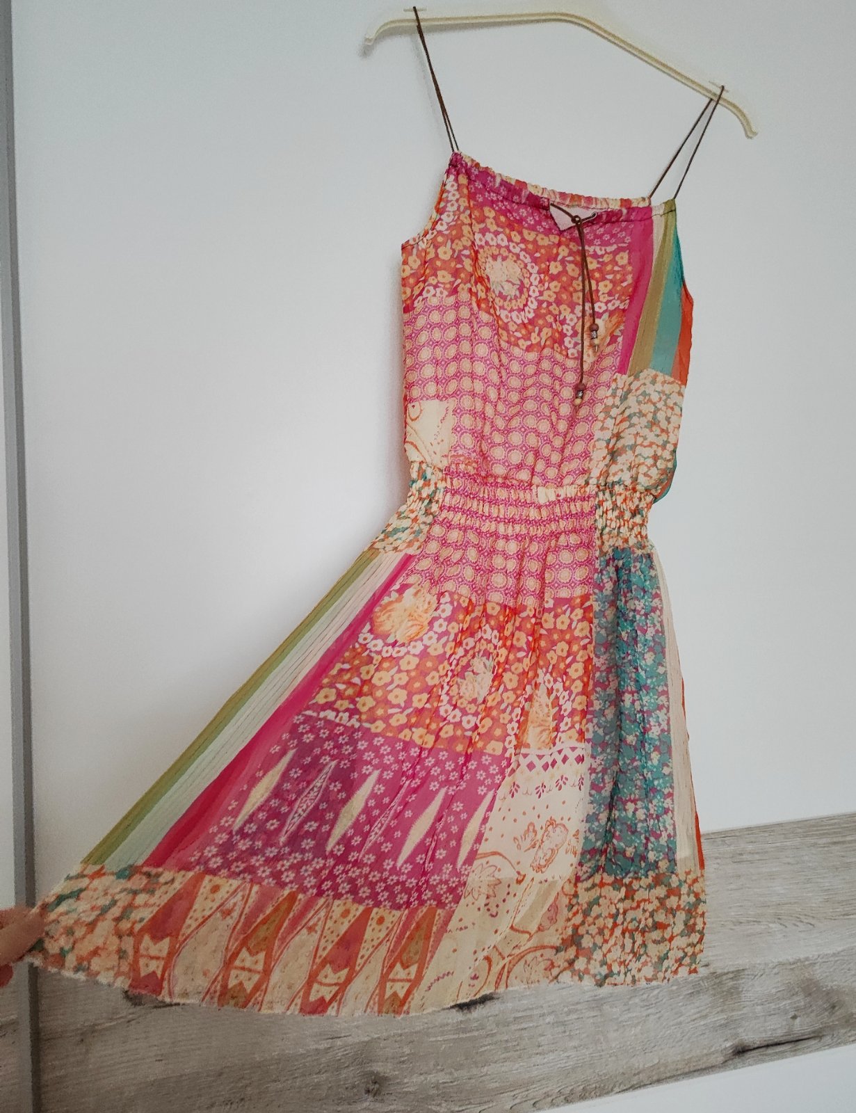 Výrazná lososová farba. Vo výstrihu zapínanie na malý patent. Elastický materiál. Dĺžka 86 cm, v páse na gumu max 55x2 cm. Kupované v Taliansku.