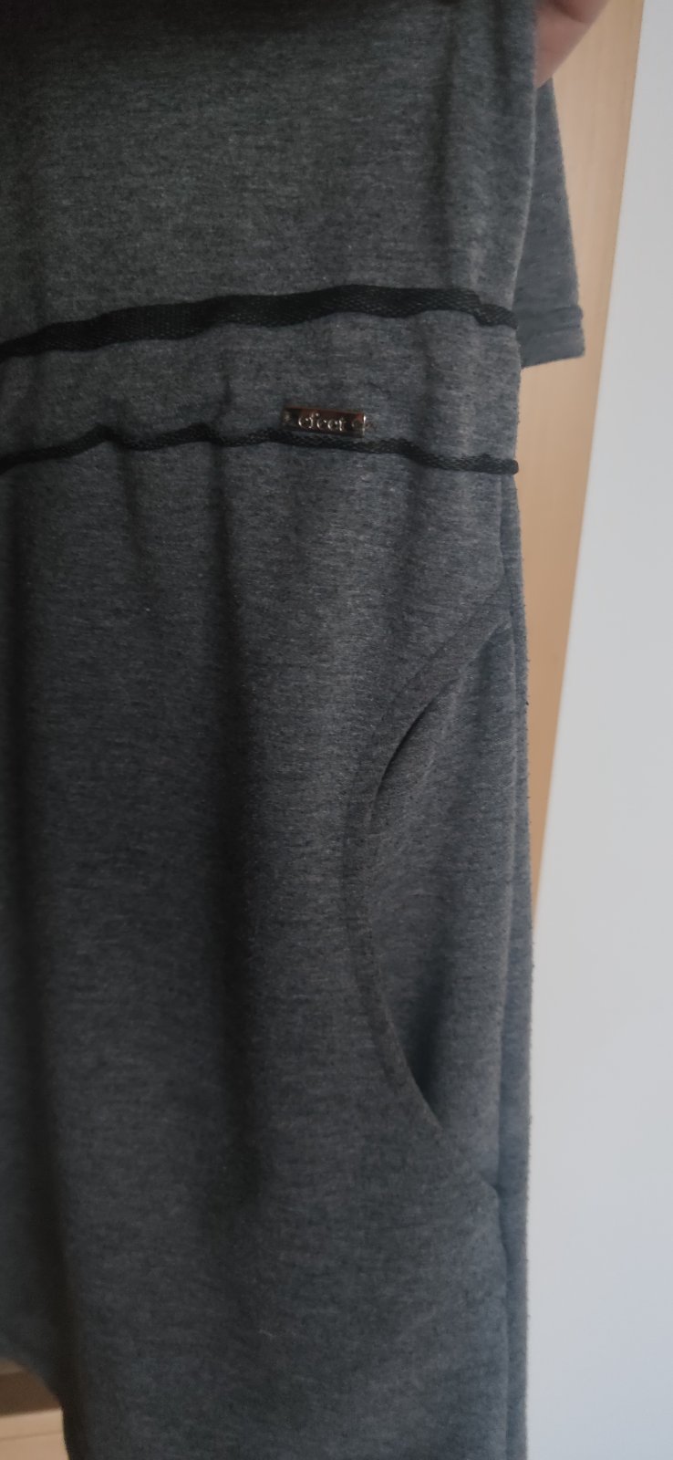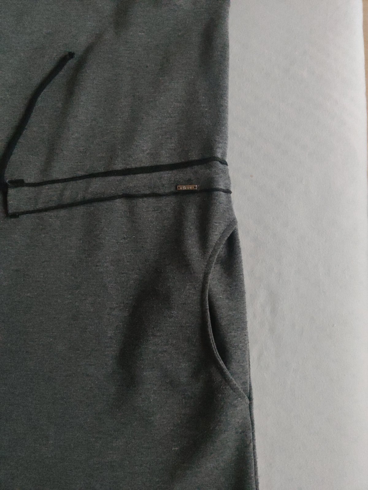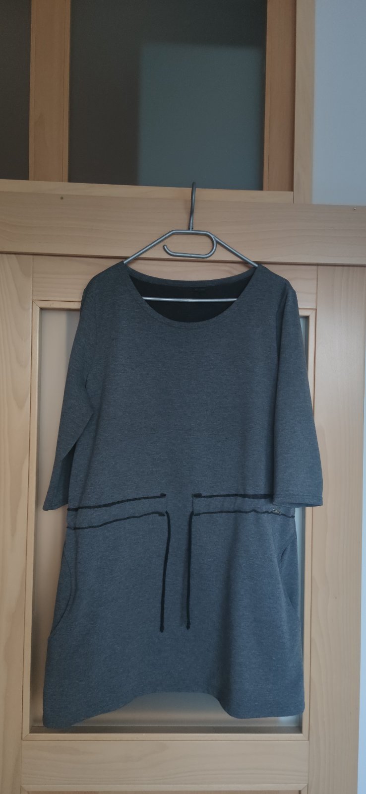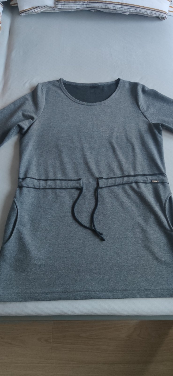 Predám dámsku tuniku, zakupená v butiku.. Veľkosť 44. Rukáv 3/4. Sťahovanie v páse pomocou šnúrky. Dve bočné vrecká. Farba sivá.