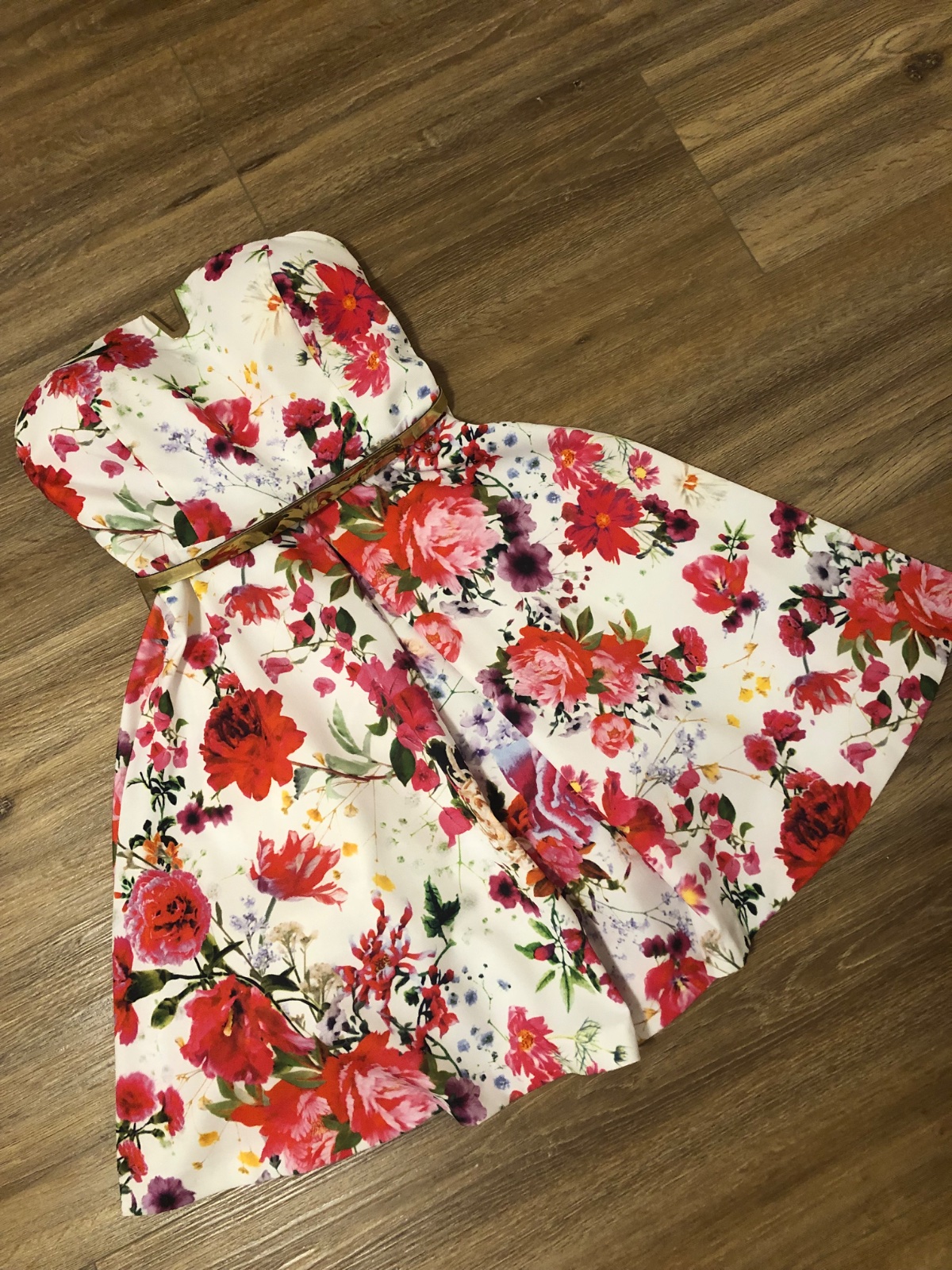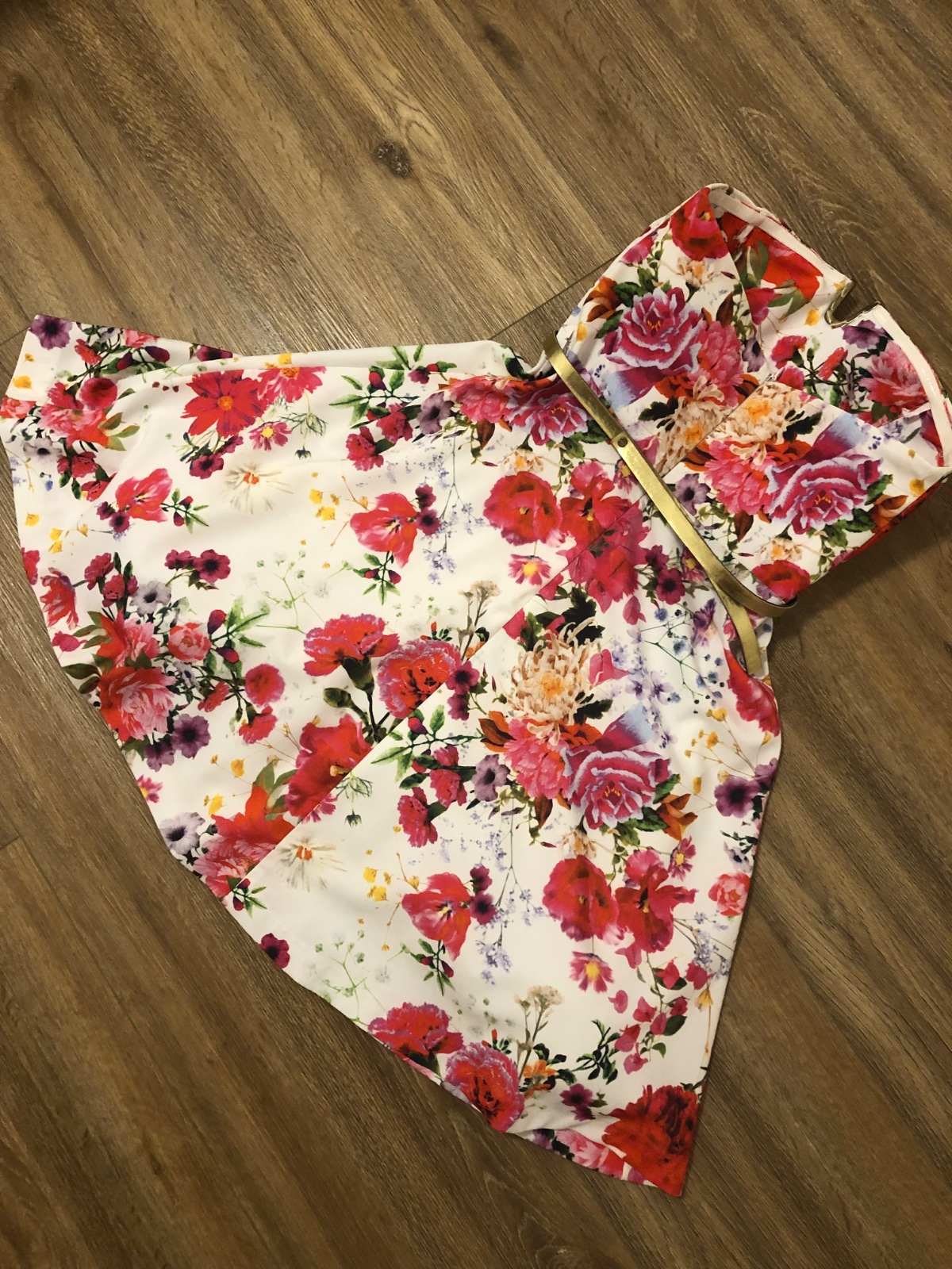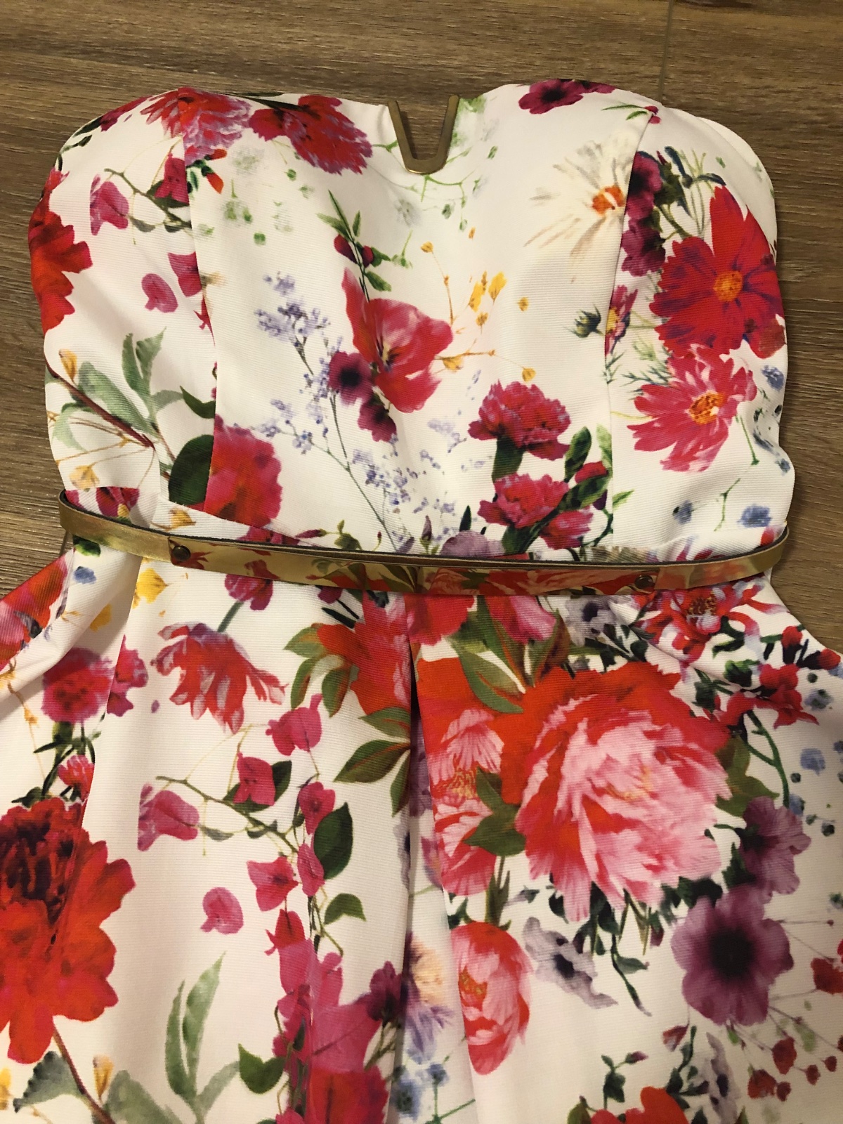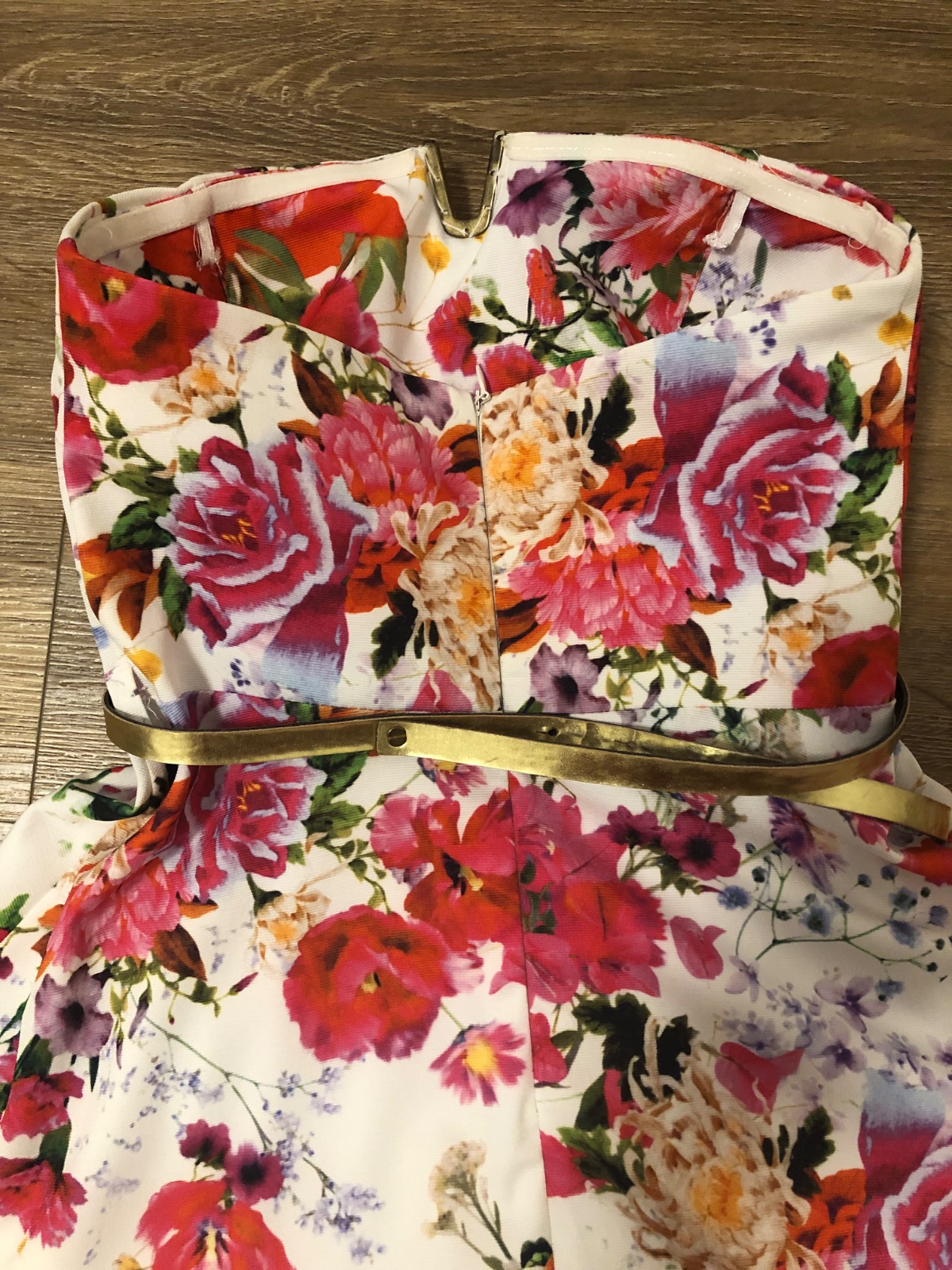Krátke šaty nosené na svadby. Na hrubšie ramienka, vzorované krémovo zlaté s kvetinovým vzorom v spodnej časti. Šaty sú ozdobené zlatým opaskom. Na šatách je veľkosť 42 - sú však véľkostne menšie m...
