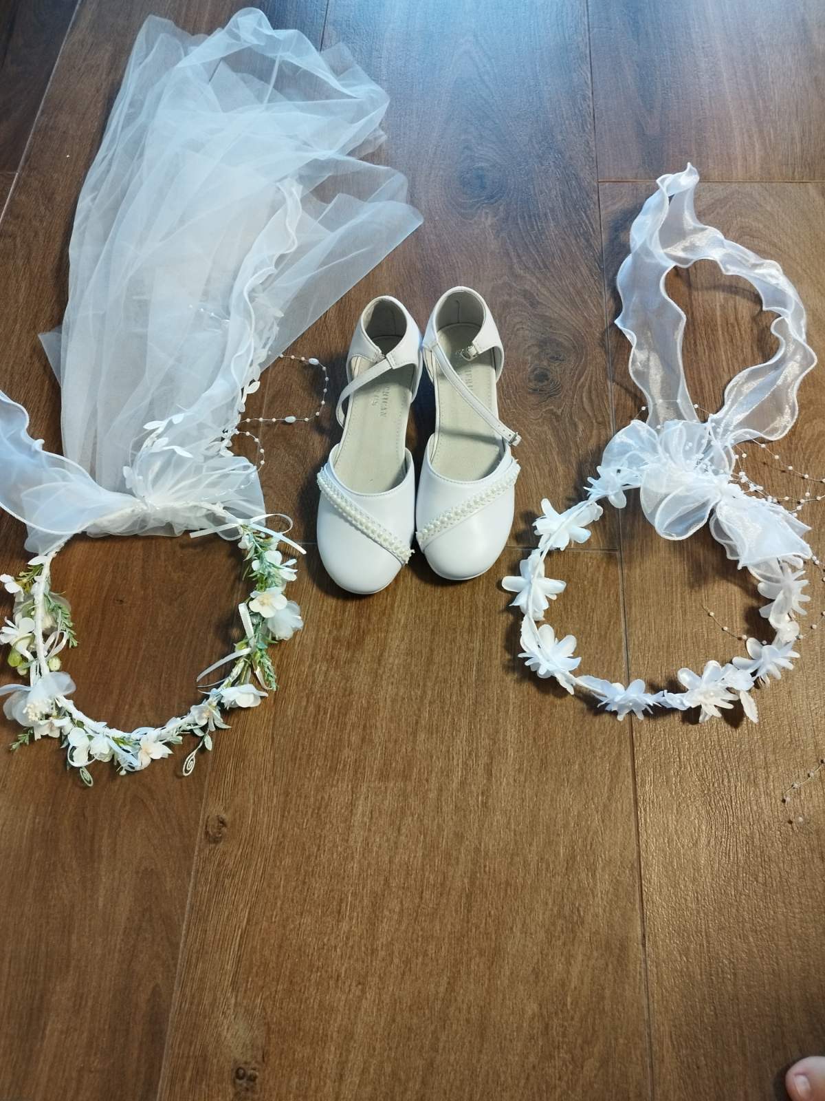 Predám šaty na 1.sväté prijímanie, bez poskodenia velkost 158, osobny odber možnosť odskúšať po dohode, topánky velkost 35 nové ani raz neboli obute cena topánok 8eur.