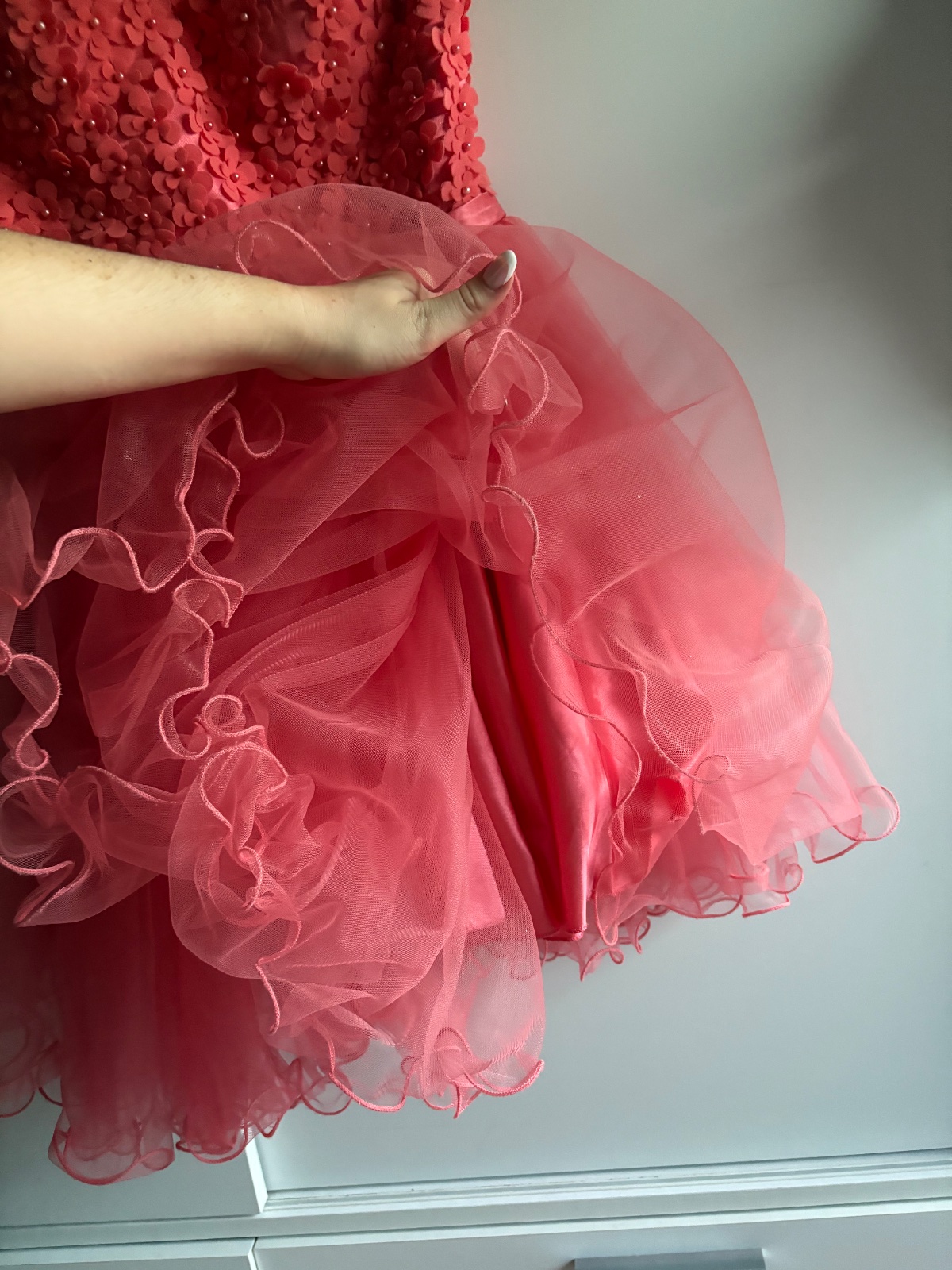 Krásne šaty, ktoré sú vhodné na donosenie. Veľkosť kľudne od M po menšie XL. Vzadu je guma tak sa prispôsobí. Má chybičky krásy, niekde sú popadané kytičky a rozstrapatené od tancovania. Stav je viditeľný na fotkách. Boli využite na venček.