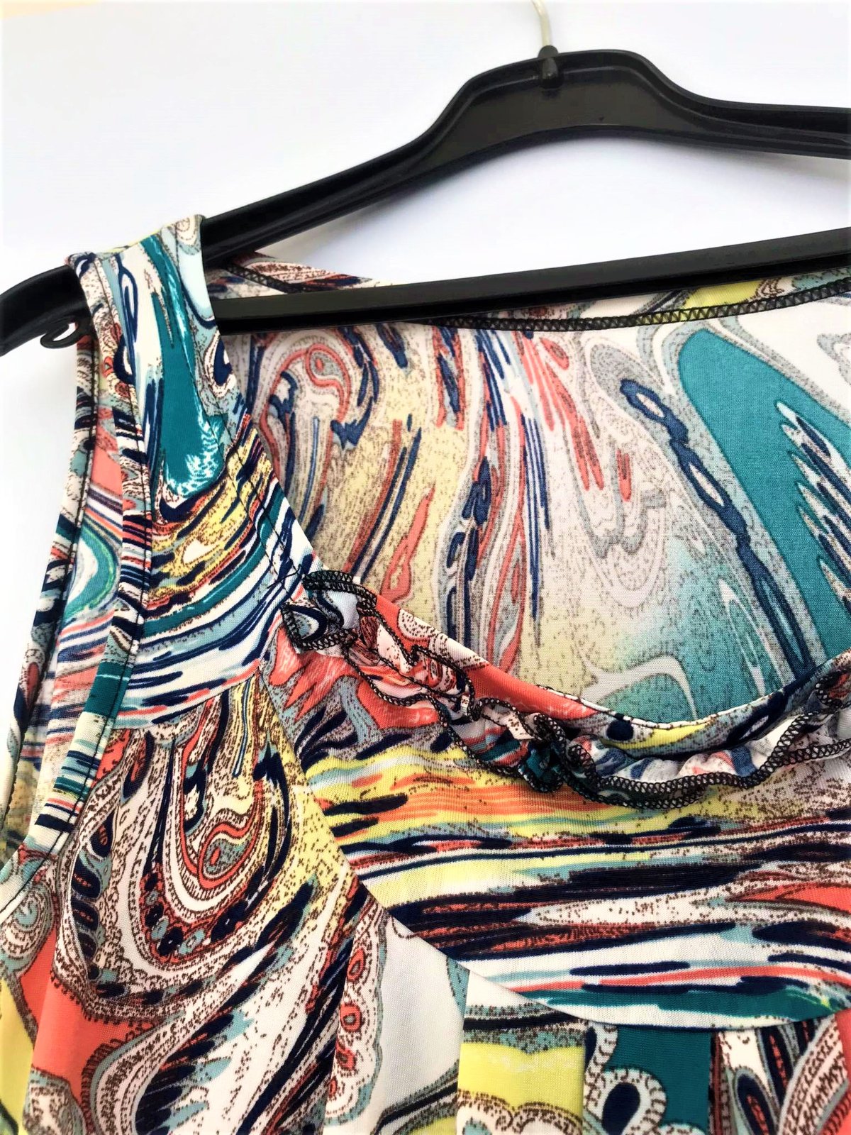 nádherné neznosené padavé letné šaty v špičkovej kvalite,oblečené na 1 príležitosť,materiál : syntetika - nekrčia sa,super na dovolenky,perfektne zoštíhľujú, top stav a kvalita,vpredu jemne nariasené - super aj pre tehotné....