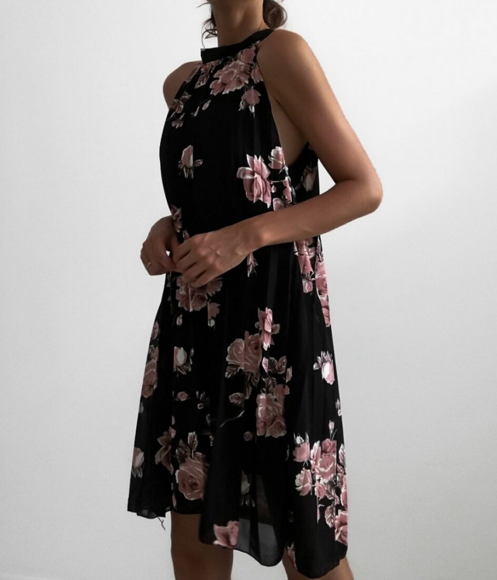 krasne laucke saty s potlacou kvetiniek . zaujimavy skladany efekt a stojacik posobia velmi elegantne. velkost S/M ihned k odberu