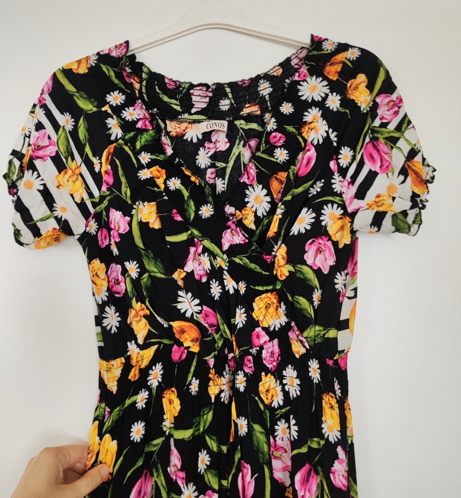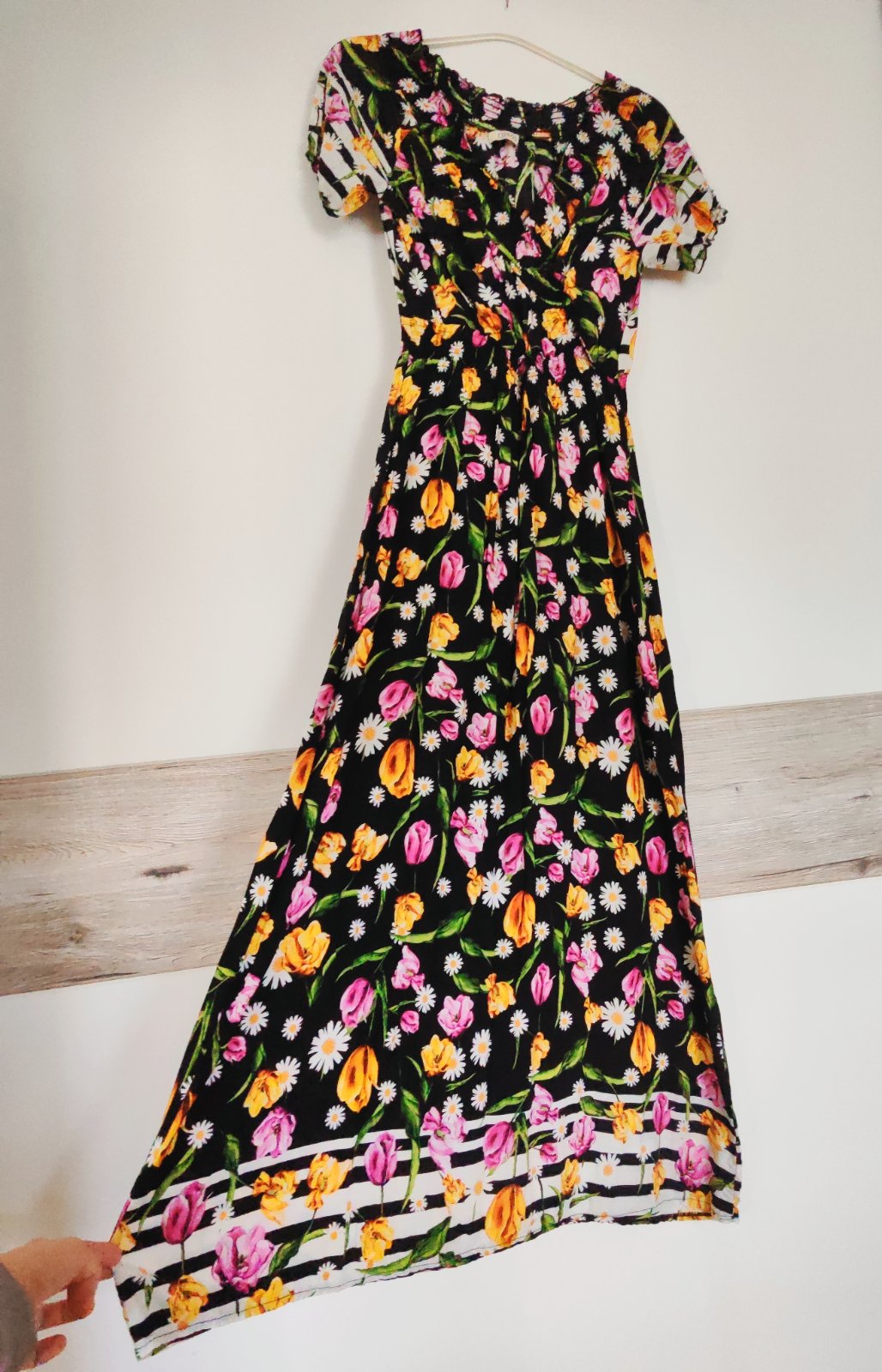 Perfektné šaty z polyesteru, viskózy a elastanu, podšité elastickou tričkovinou. Dĺžka - cca 122 cm, šírka pod pazuchami - 2x 50 cm v kľude, cez gumičku - 2x 32/42 cm, boky - 2x 60 cm. UNI veľkosť,...