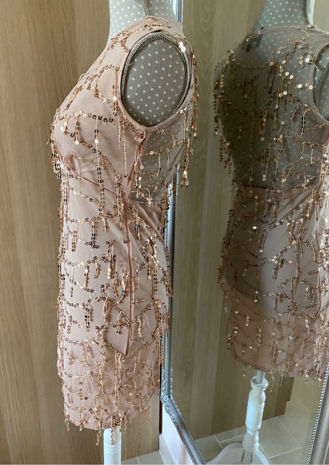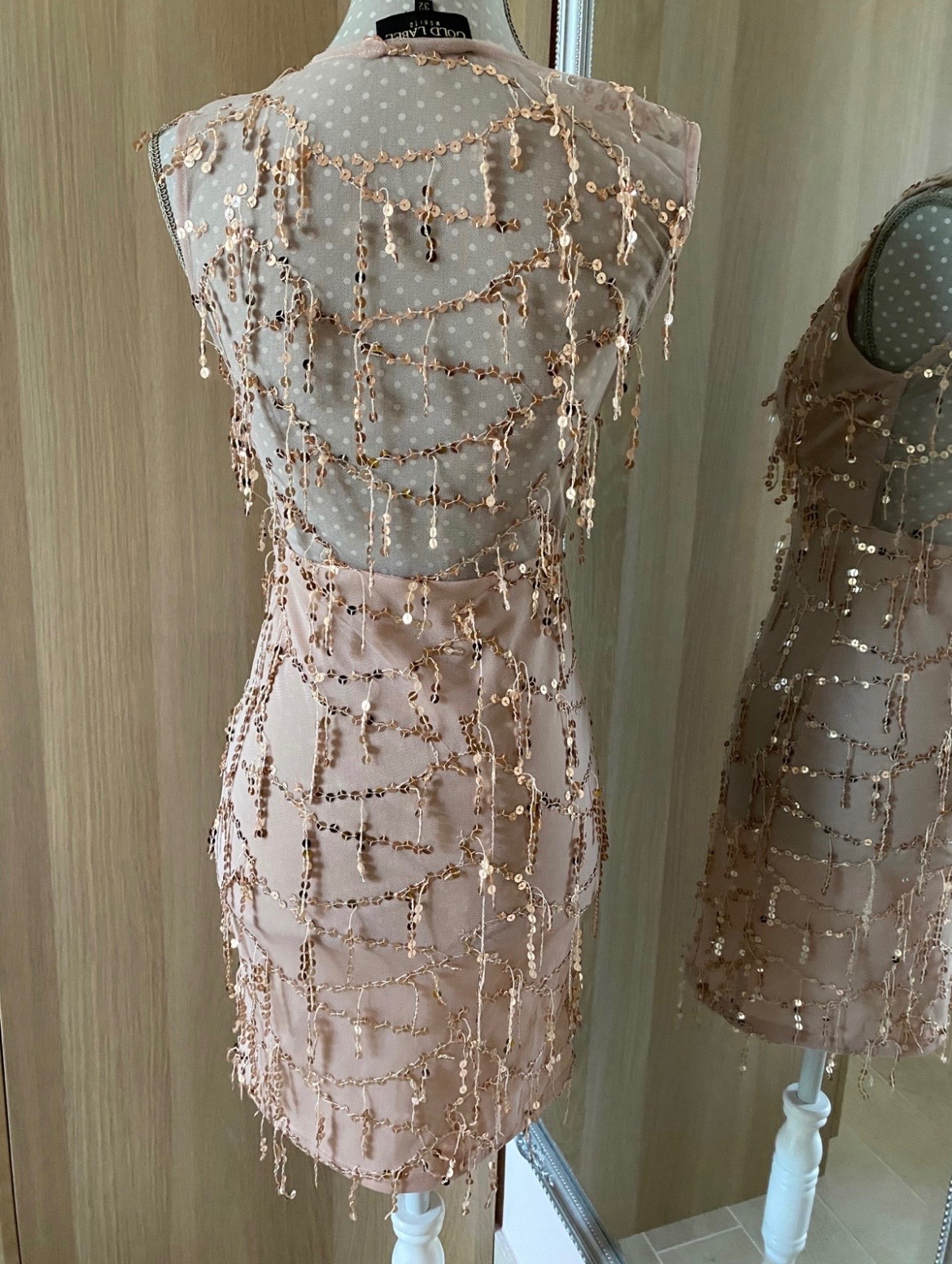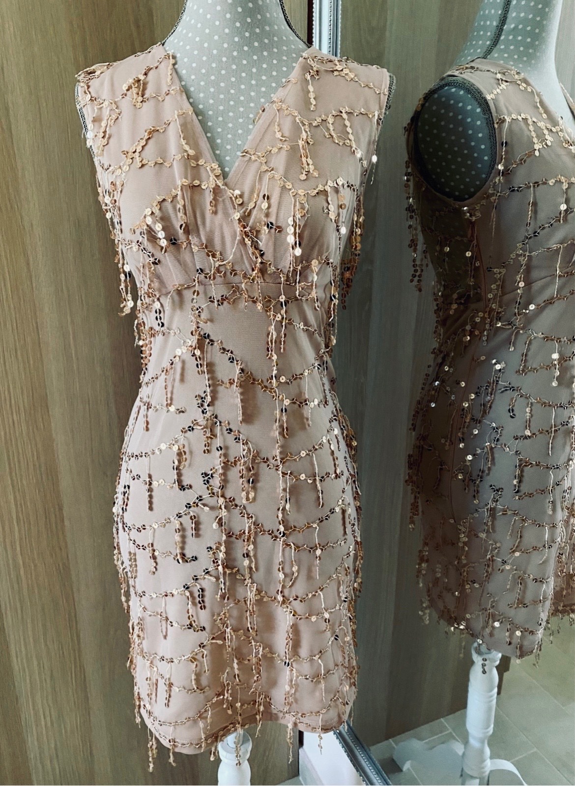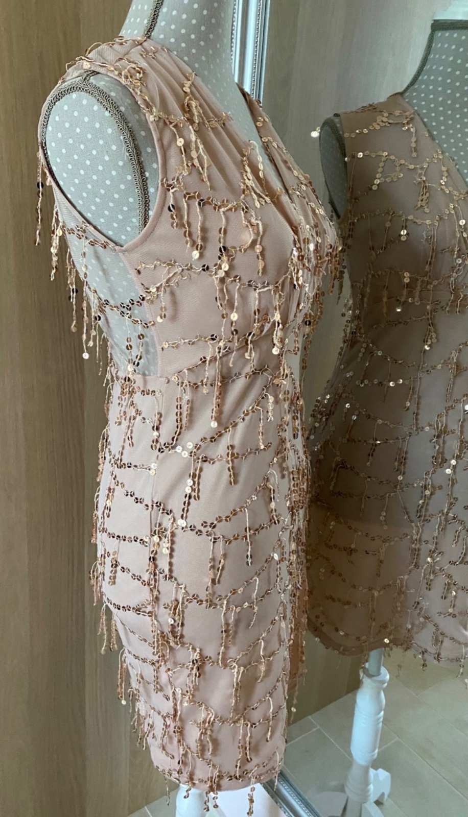 Krasne saty od MOHITO Gold Label; cele podšité okrem chrbta; farba telova, jemne do lososova so zlatými flitrovymi strapcami; PC 40€; figurína ma obvod 86cm; viem ešte zmerať ak treba (sedí na XXS/XS)