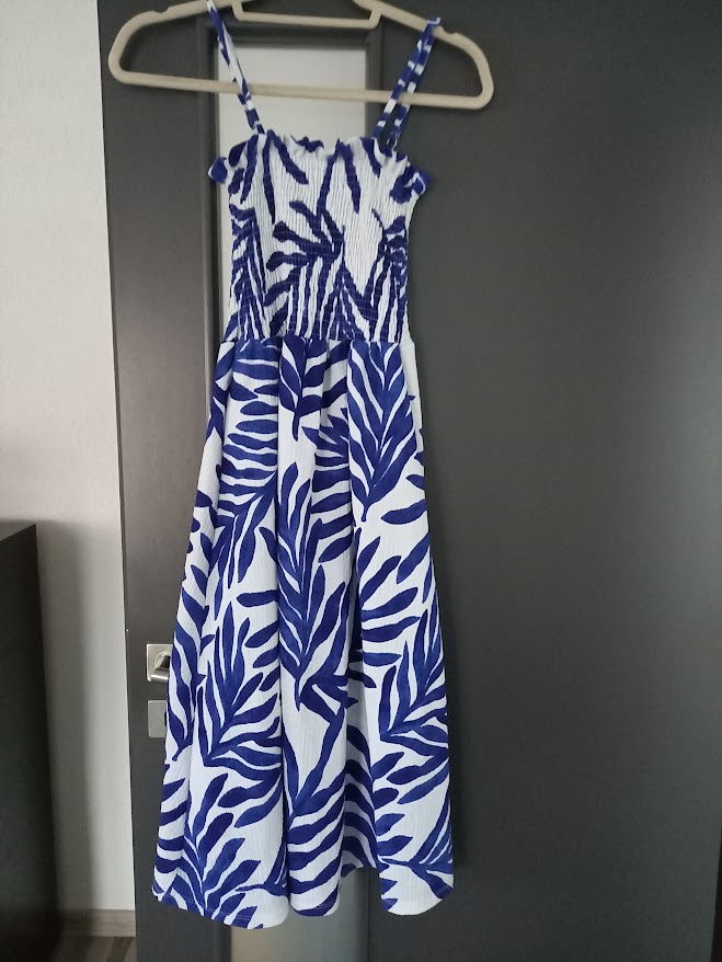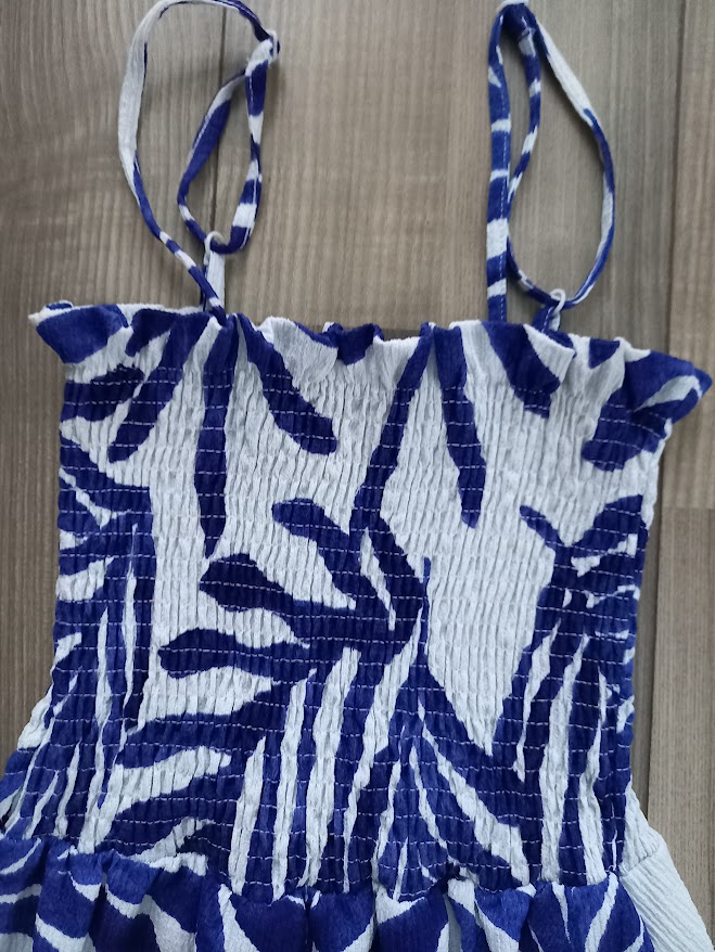 Letné moderné šaty po kolená s tenkými nastaviteľnými ramienkami, ozdobne zriaseným živôtikom s volánikovým lemom a jemne rozšírenou sukňou. Sú padavé, netreba žehliť, ako nové, moderná krčivá štruktúra. Celková dĺžka 94 cm. Kupované ako nové, nosené jedno leto na dovolenke jedným dieťaťom. Cena 8,50 € + poštovné.